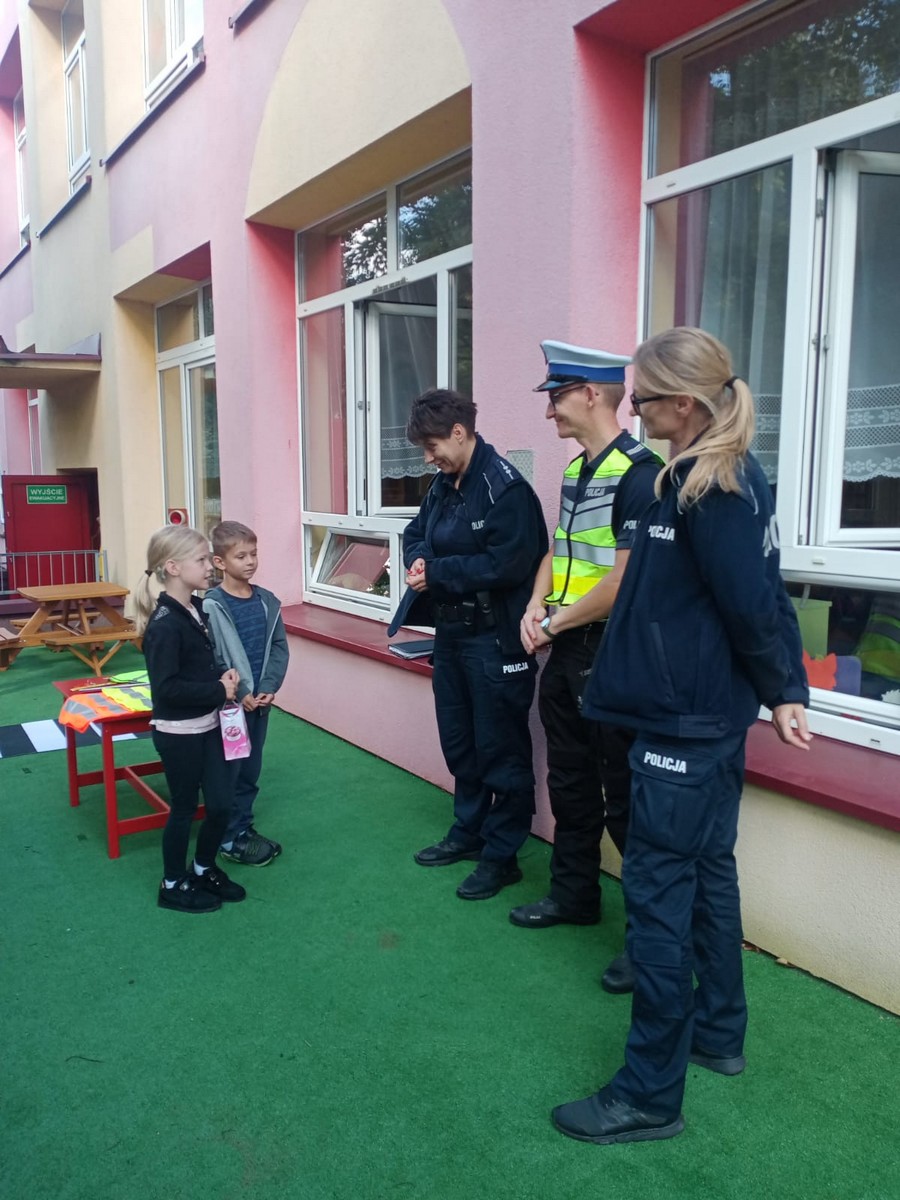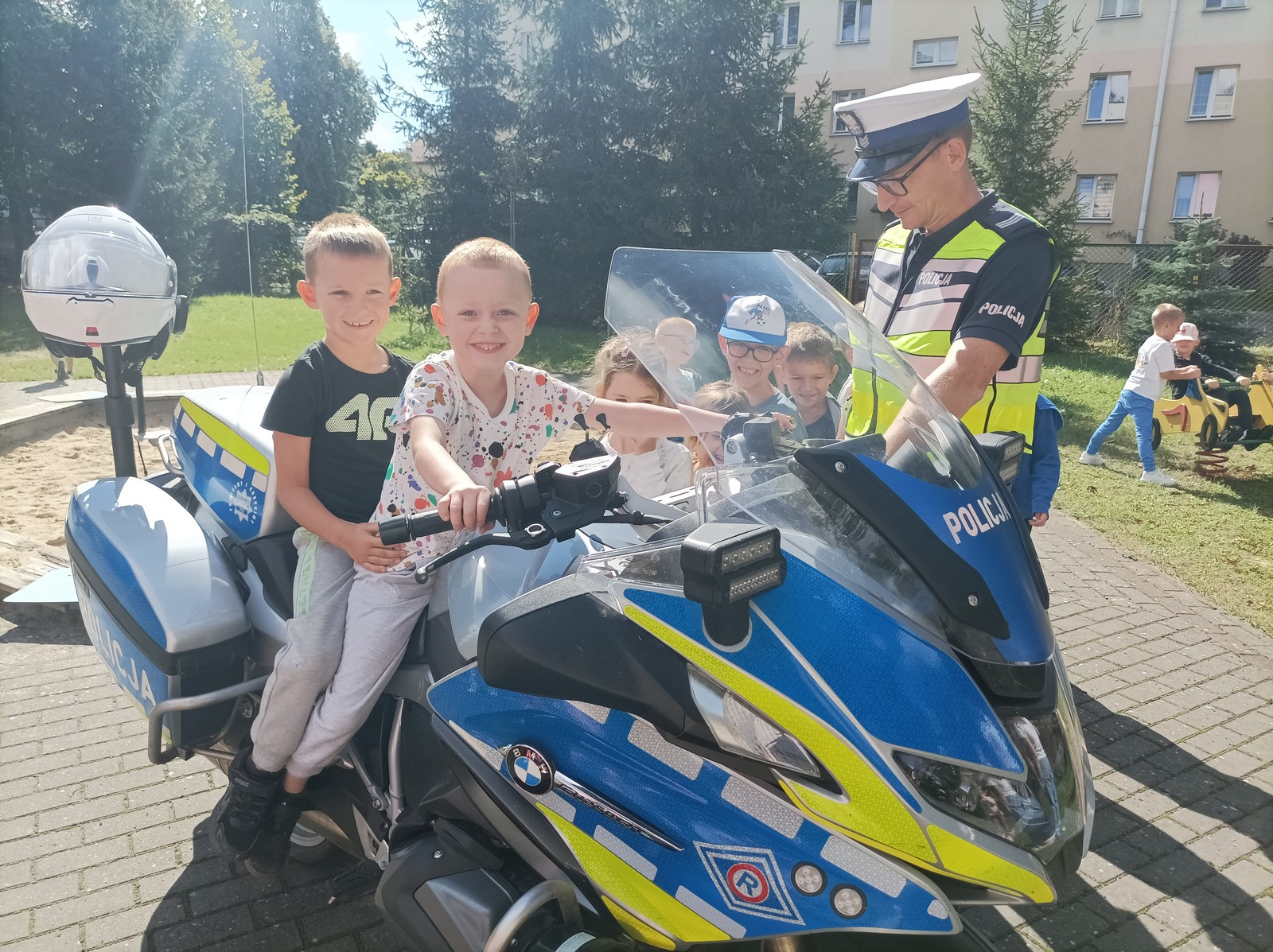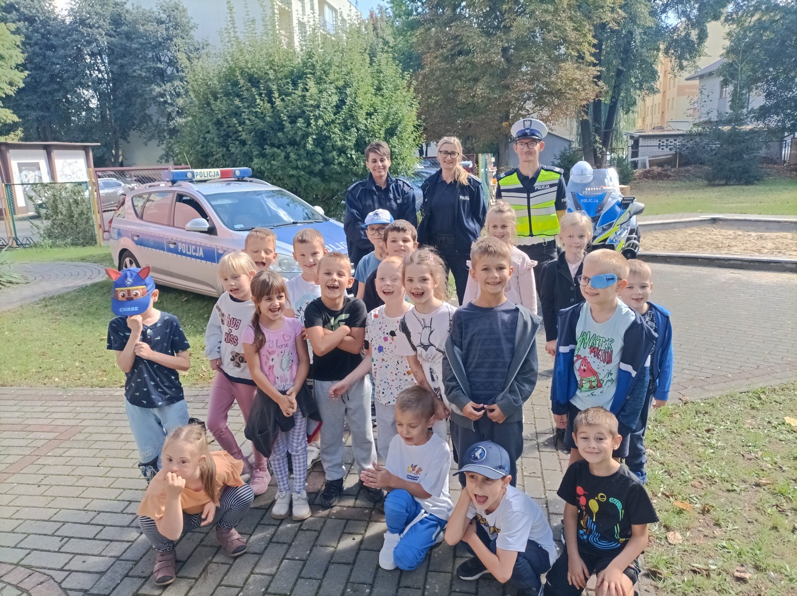 W poniedziałek, 15 września 2025 r., ogromną radość naszym przedszkolakom sprawiło spotkanie z Policjantami, którymi byli nasi Rodzice – Pani Agnieszka, mama Ninki i Pan Karol, tatuś Kacperka. Funkcjonariusze policji utrwalili z dziećmi podstawowe zasady bezpieczeństwa w ruchu drogowym. Dzieci chętnie odpowiadały na pytania i wykazały się dużą wiedzą w tej tematyce. Największe jednak emocje wzbudziło oglądanie policyjnego radiowozu i motocykla. Na zakończenie spotkania każdy przedszkolak otrzymał odblask i kolorowankę, które mają przypominać o zasadach bezpieczeństwa na co dzień.