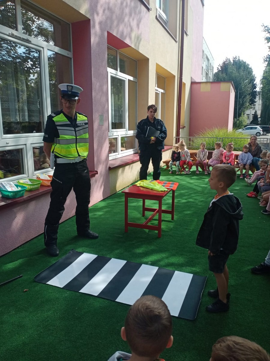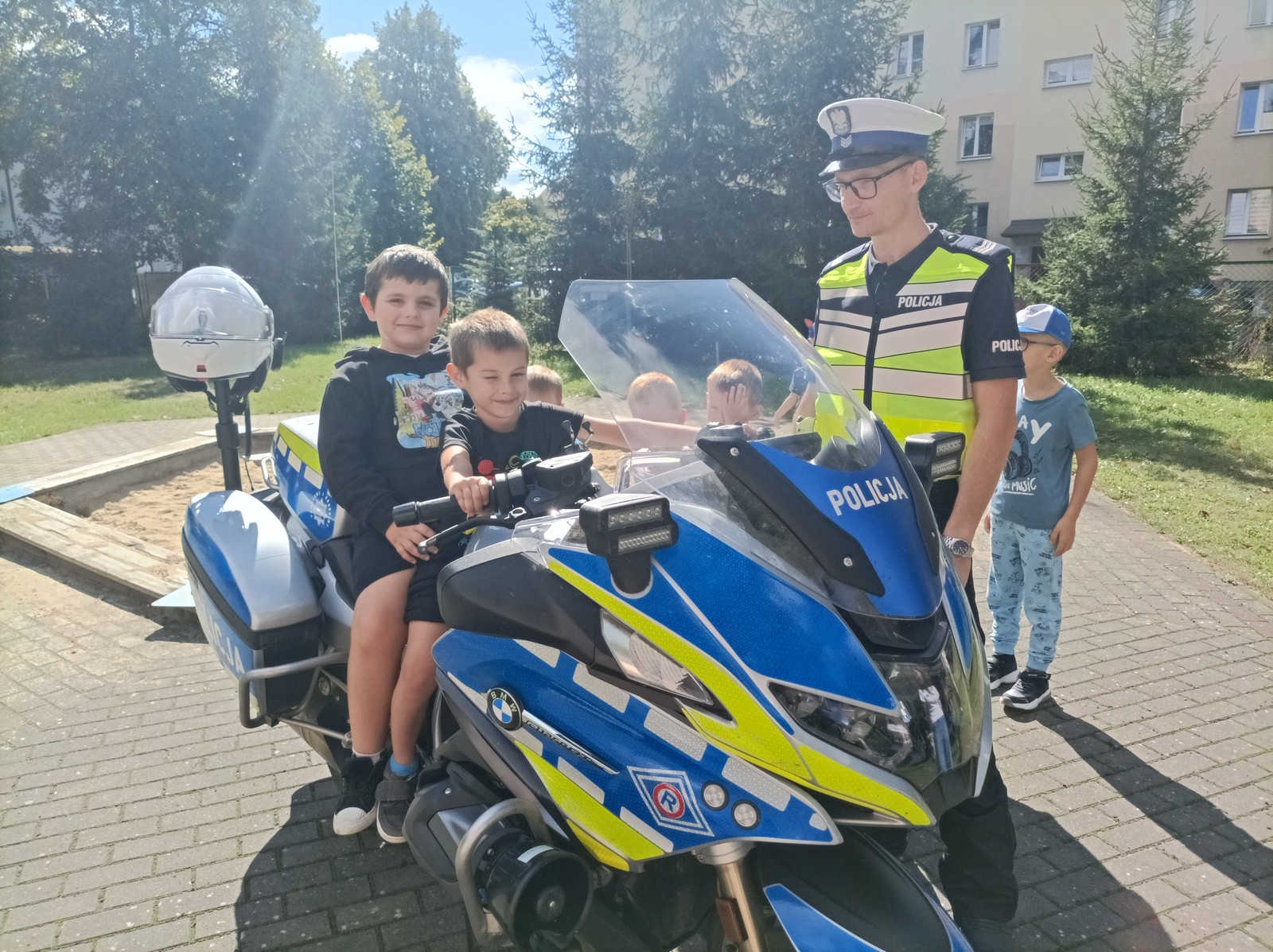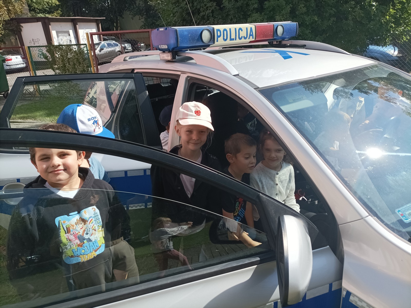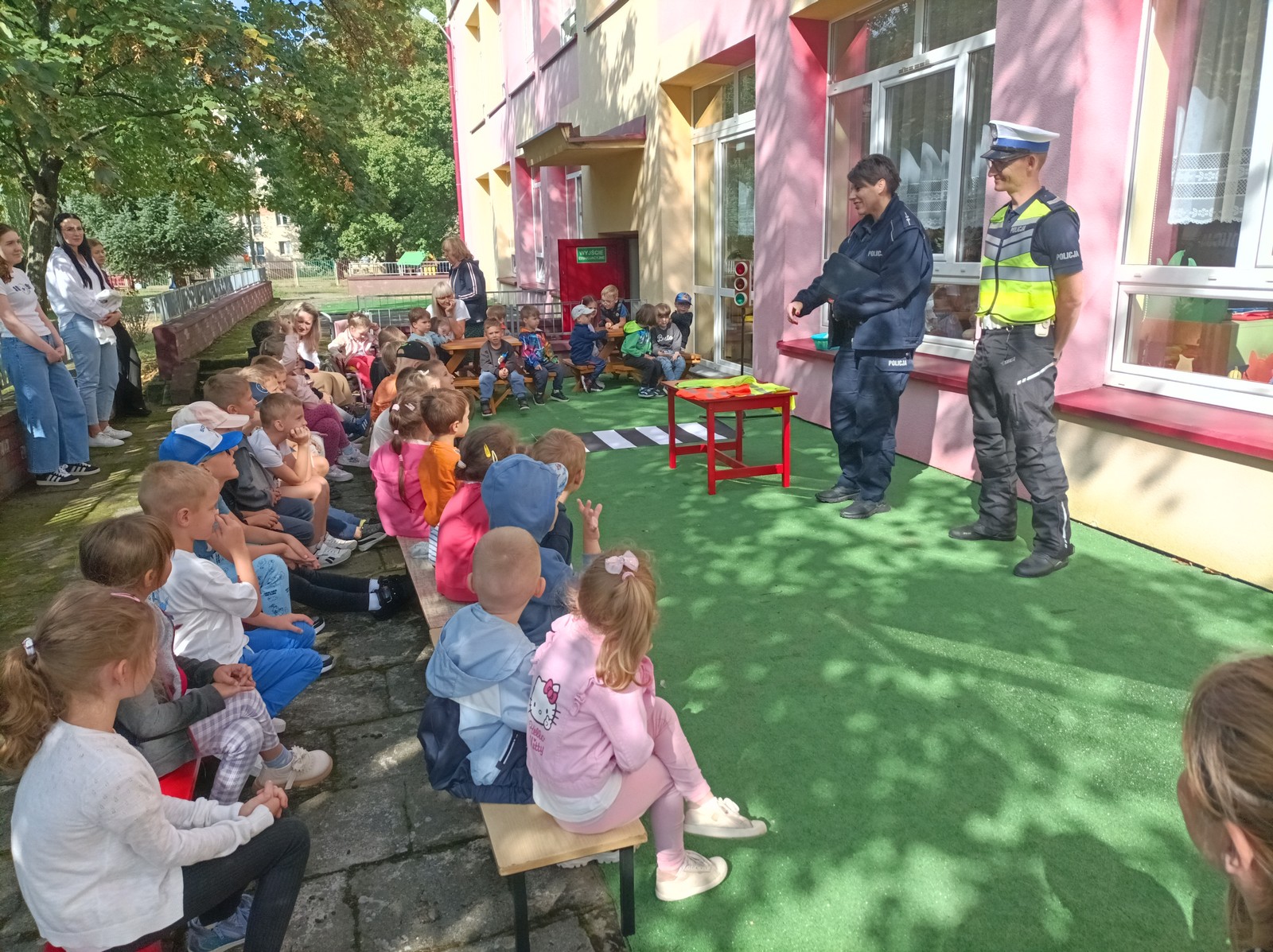 W poniedziałek, 15 września 2025 r., ogromną radość naszym przedszkolakom sprawiło spotkanie z Policjantami, którymi byli nasi Rodzice – Pani Agnieszka, mama Ninki i Pan Karol, tatuś Kacperka. Funkcjonariusze policji utrwalili z dziećmi podstawowe zasady bezpieczeństwa w ruchu drogowym. Dzieci chętnie odpowiadały na pytania i wykazały się dużą wiedzą w tej tematyce. Największe jednak emocje wzbudziło oglądanie policyjnego radiowozu i motocykla. Na zakończenie spotkania każdy przedszkolak otrzymał odblask i kolorowankę, które mają przypominać o zasadach bezpieczeństwa na co dzień.