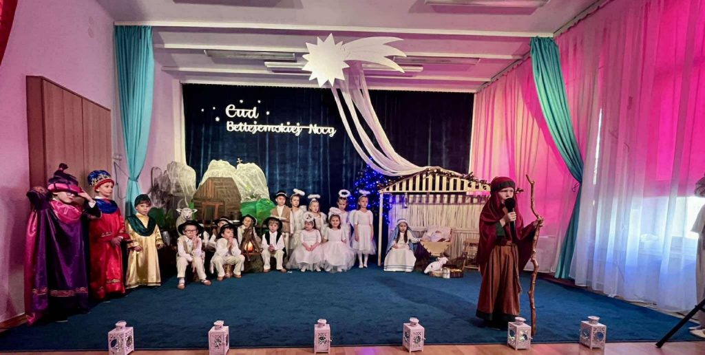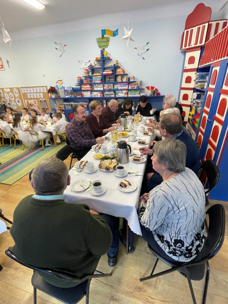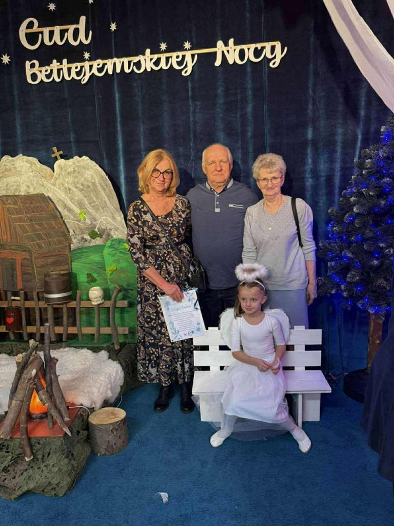Z okazji Dnia Babci i Dziadka w naszej grupie Średniaków odbyło się wyjątkowe spotkanie pełne wzruszeń i radości. Dzieci z wielkim zaangażowaniem zaprezentowały jasełka, wprowadzając zgromadzonych gości w świąteczny, pełen ciepła nastrój. Po występie przedszkolaki złożyły swoim Babciom i Dziadkom serdeczne życzenia oraz wręczyły własnoręcznie przygotowane prezenty, które były wyrazem miłości i wdzięczności. Spotkanie zakończyło się wspólnym poczęstunkiem na sali, podczas którego nie zabrakło rozmów, uśmiechów i miłej, rodzinnej atmosfery.