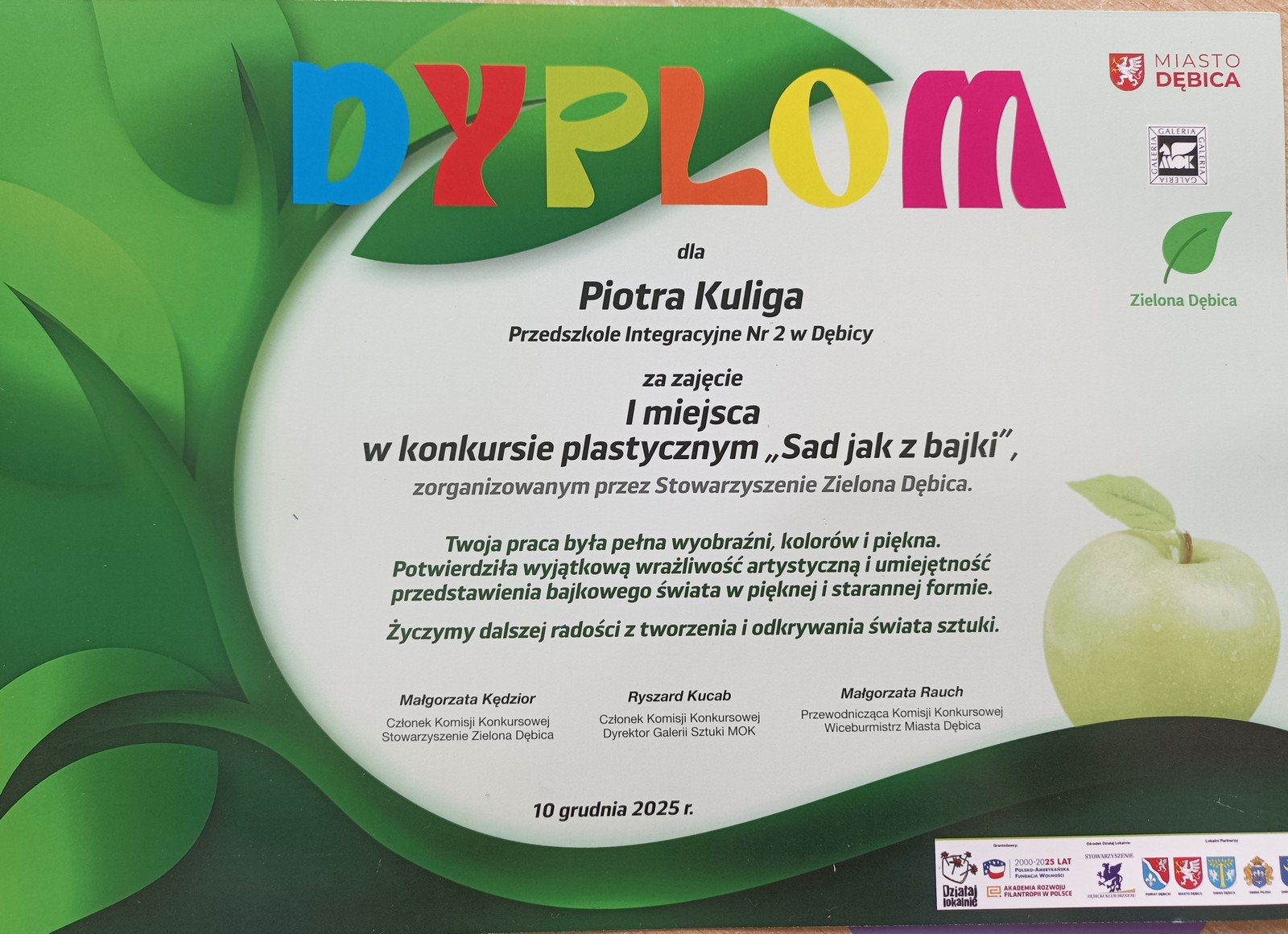Z radością informujemy, że Amelia i Piotr z grupy IV zdobyli ex aequo Imiejsce w Międzyprzedszkolnym Konkursie Plastycznym „Sad jak z bajki” zorganizowanym przez Stowarzyszenie Zielona Dębica.