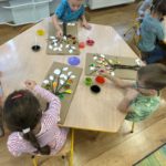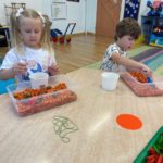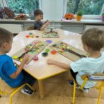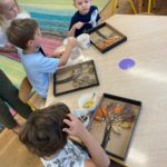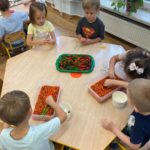 W naszym przedszkolu dzieci miały okazję uczestniczyć w zajęciach sensorycznych, które pobudzały ich wyobraźnię, rozwijały zmysły i sprawiały mnóstwo radości! Podczas zajęć odbijaliśmy prawdziwe liście pomalowane farbą na kartonie. Przesypywaliśmy różne materiały spożywcze poznając ich fakturę. Malowaliśmy barwnikami spożywczymi za pomocą pipetek. Powstały piękne jesienne obrazy. Nawlekaliśmy kolorowy makaron na sznureczki, tworząc jesienne naszyjniki oraz szukaliśmy „skarbów” ukrytych w kolorowym ryżu. Dzieci były zachwycone i z dużym zaangażowaniem uczestniczyły w każdej aktywności. Z pewnością powtórzymy takie zajęcia jeszcze nie raz!