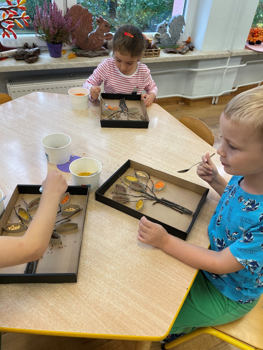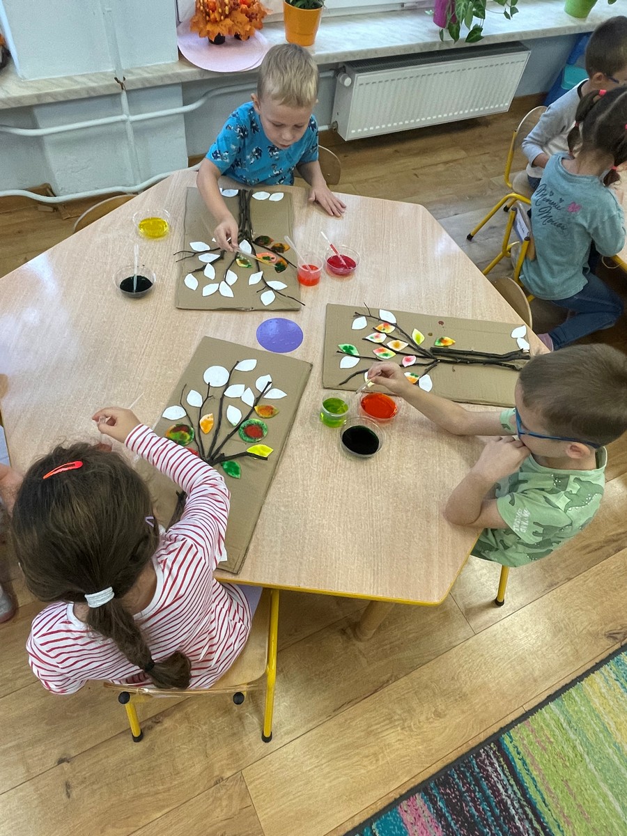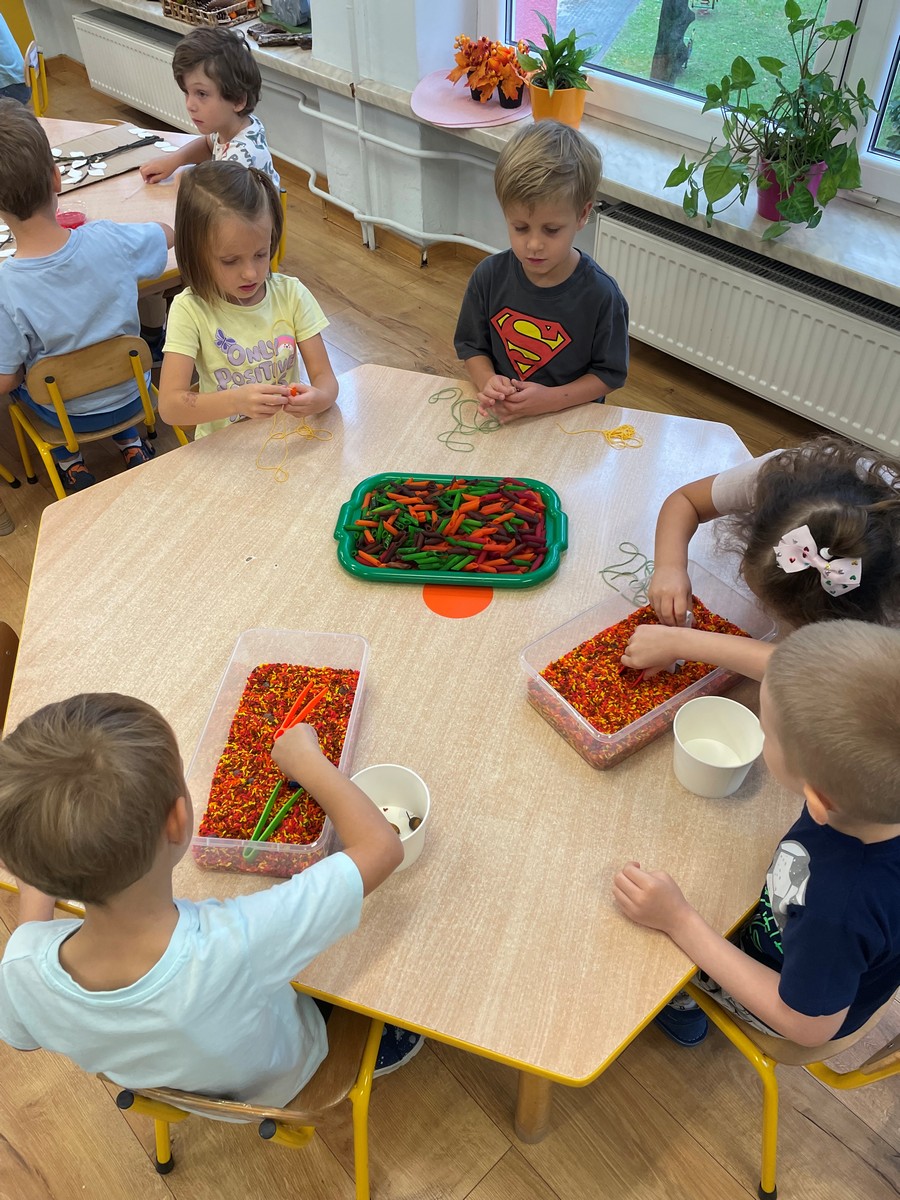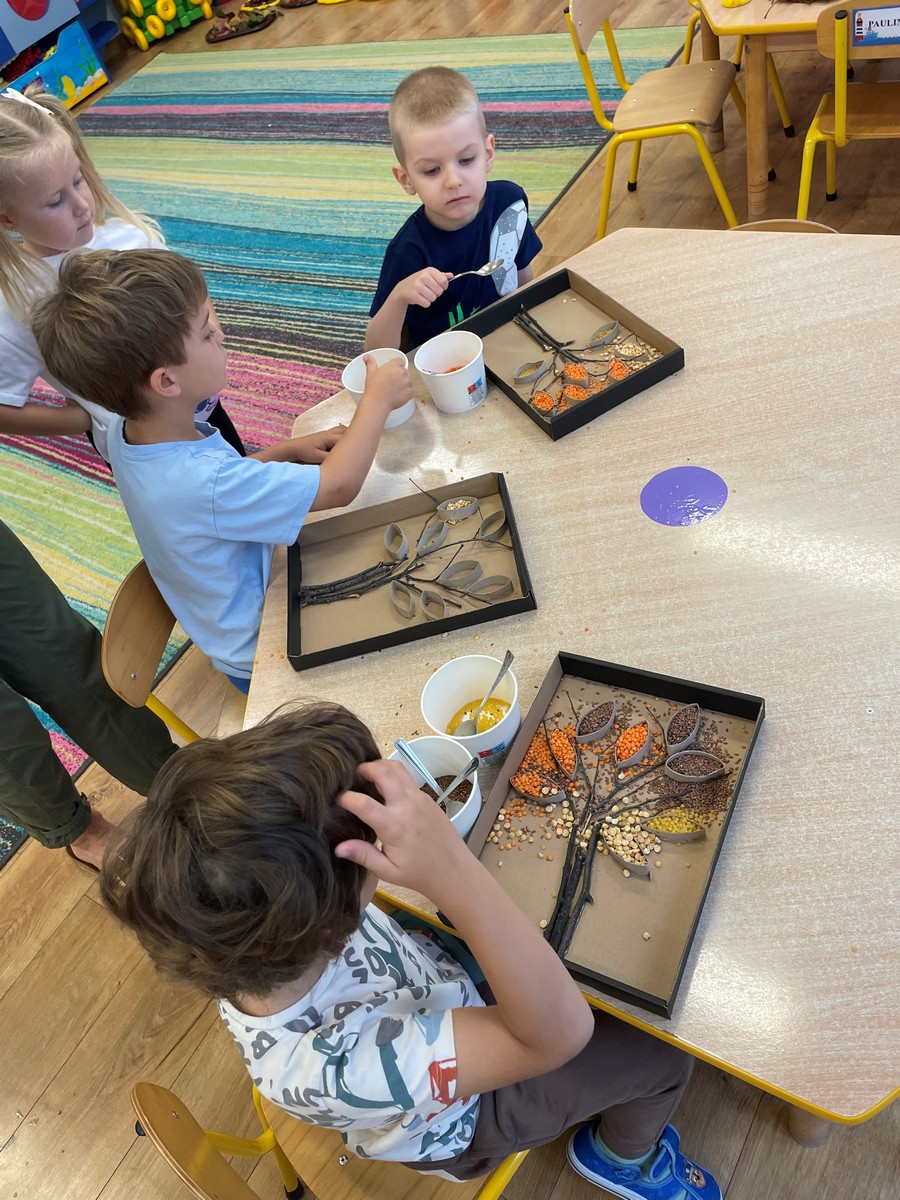 W naszym przedszkolu dzieci miały okazję uczestniczyć w zajęciach sensorycznych, które pobudzały ich wyobraźnię, rozwijały zmysły i sprawiały mnóstwo radości! Podczas zajęć odbijaliśmy prawdziwe liście pomalowane farbą na kartonie. Przesypywaliśmy różne materiały spożywcze poznając ich fakturę. Malowaliśmy barwnikami spożywczymi za pomocą pipetek. Powstały piękne jesienne obrazy. Nawlekaliśmy kolorowy makaron na sznureczki, tworząc jesienne naszyjniki oraz szukaliśmy „skarbów” ukrytych w kolorowym ryżu. Dzieci były zachwycone i z dużym zaangażowaniem uczestniczyły w każdej aktywności. Z pewnością powtórzymy takie zajęcia jeszcze nie raz!