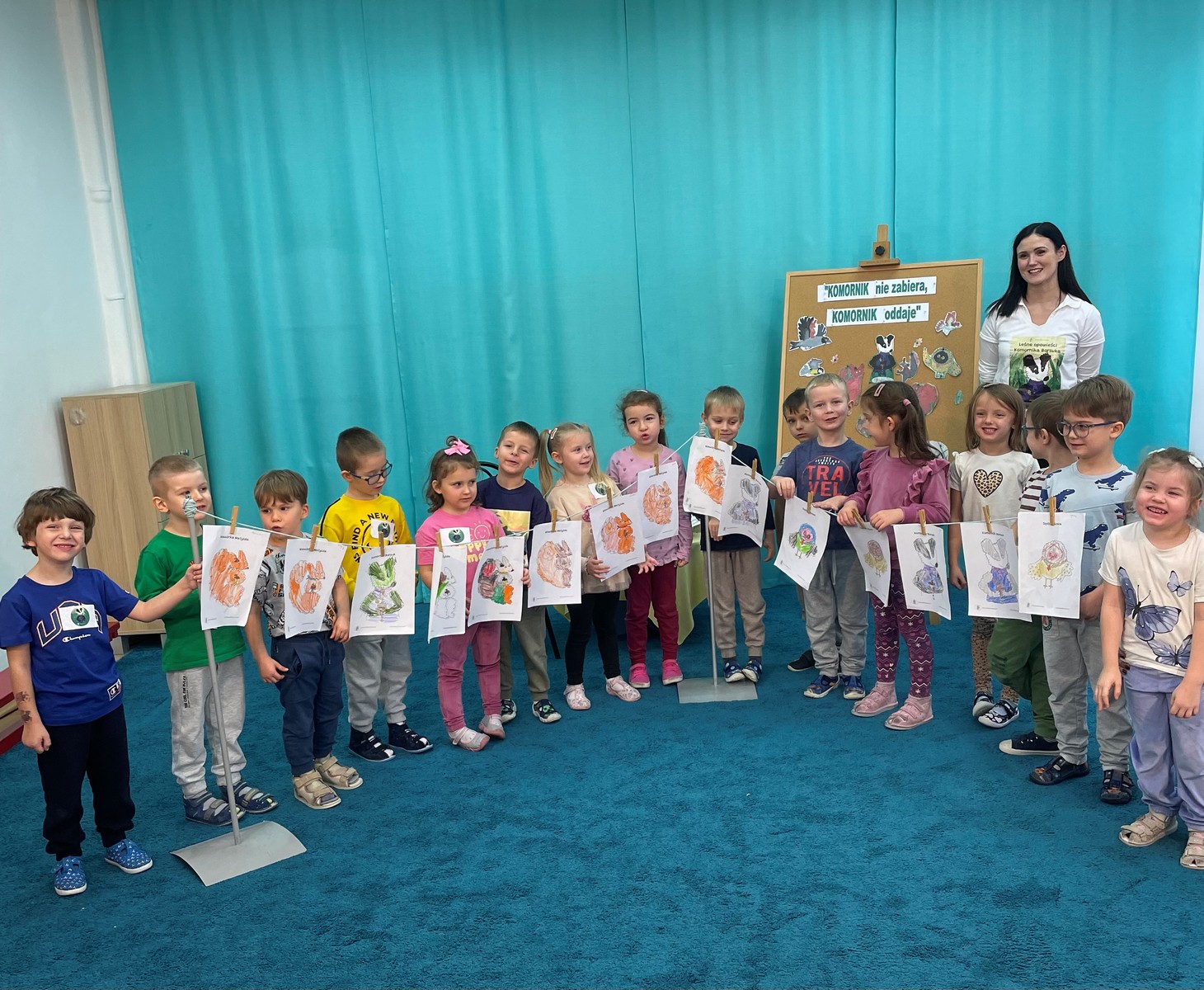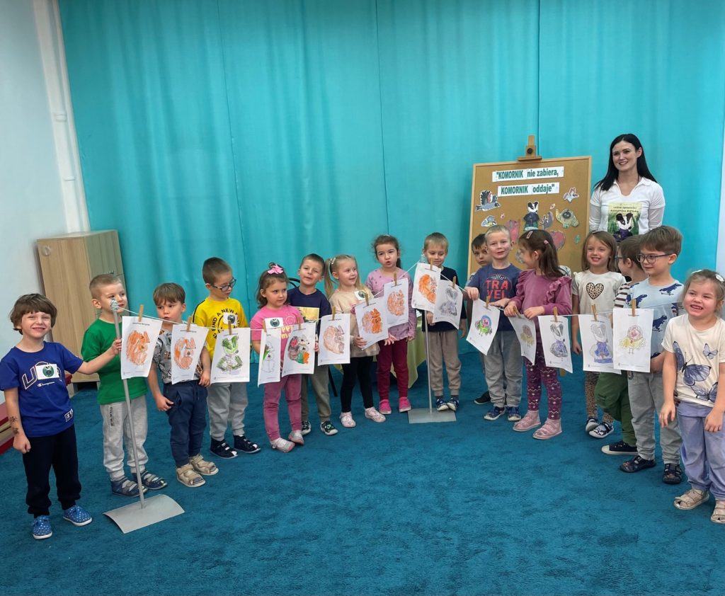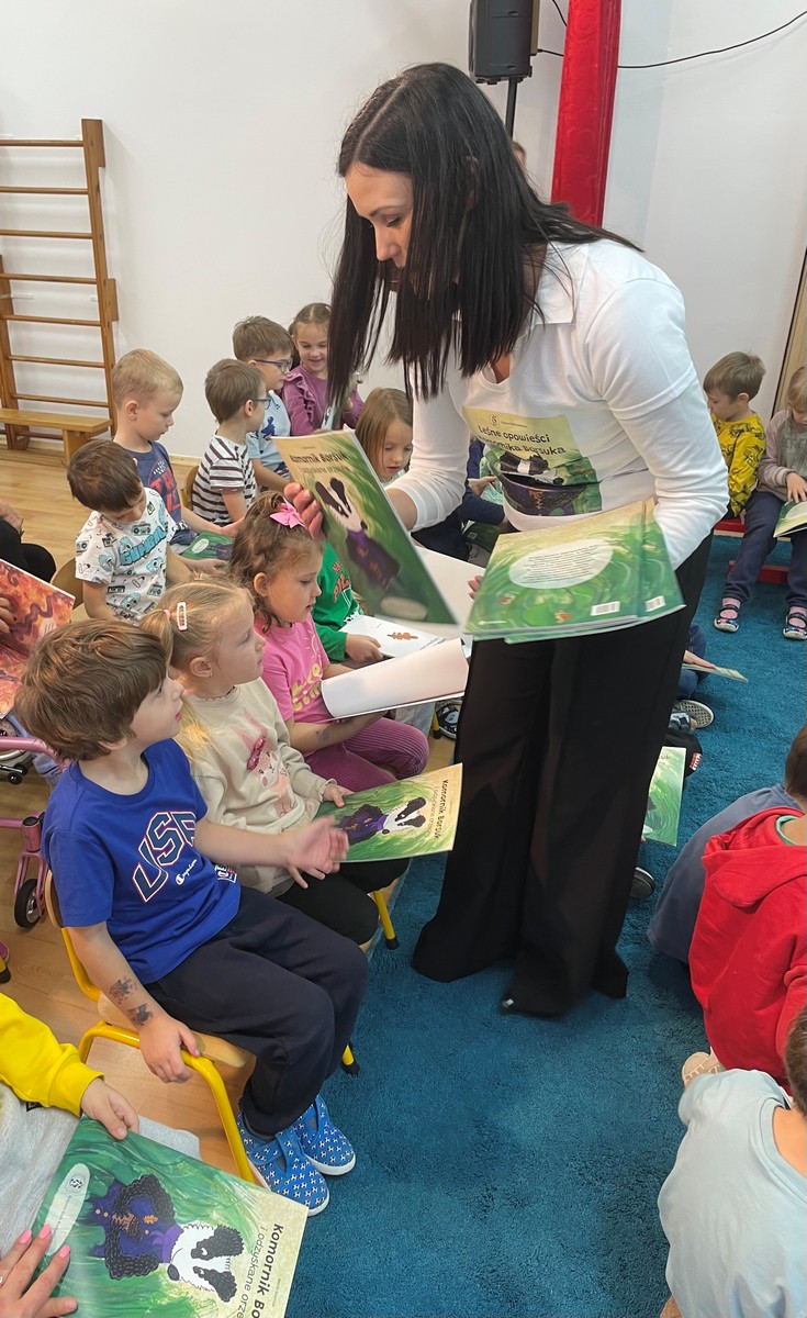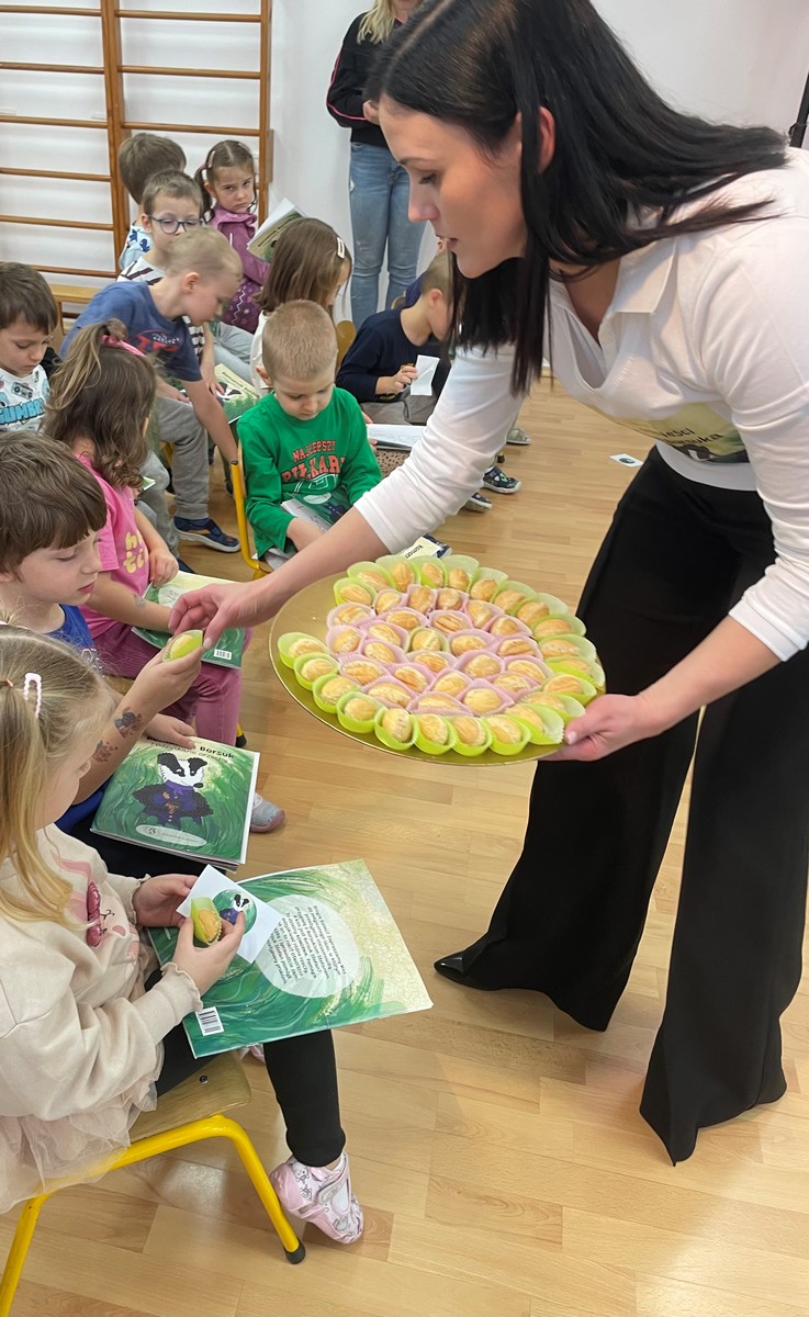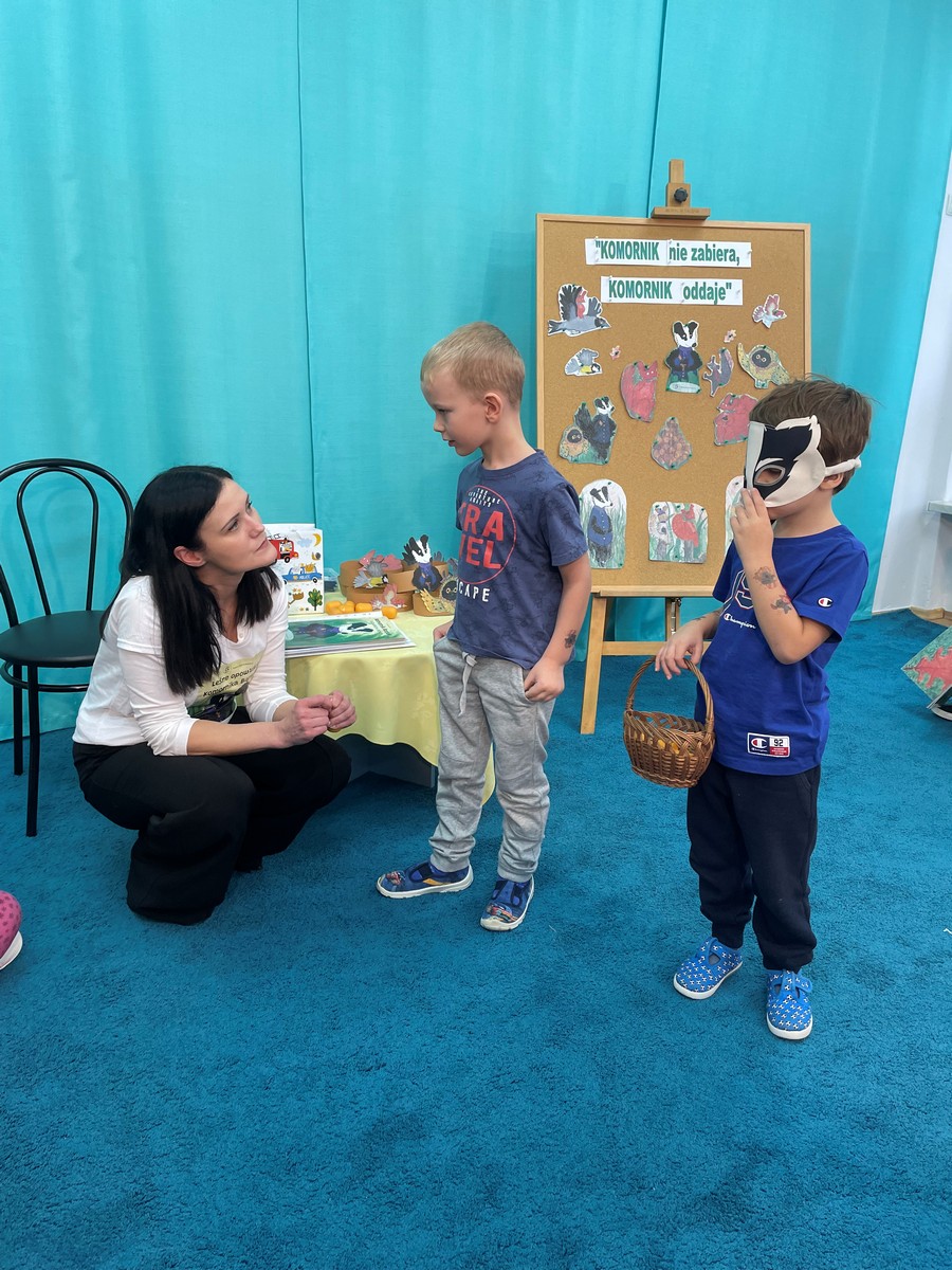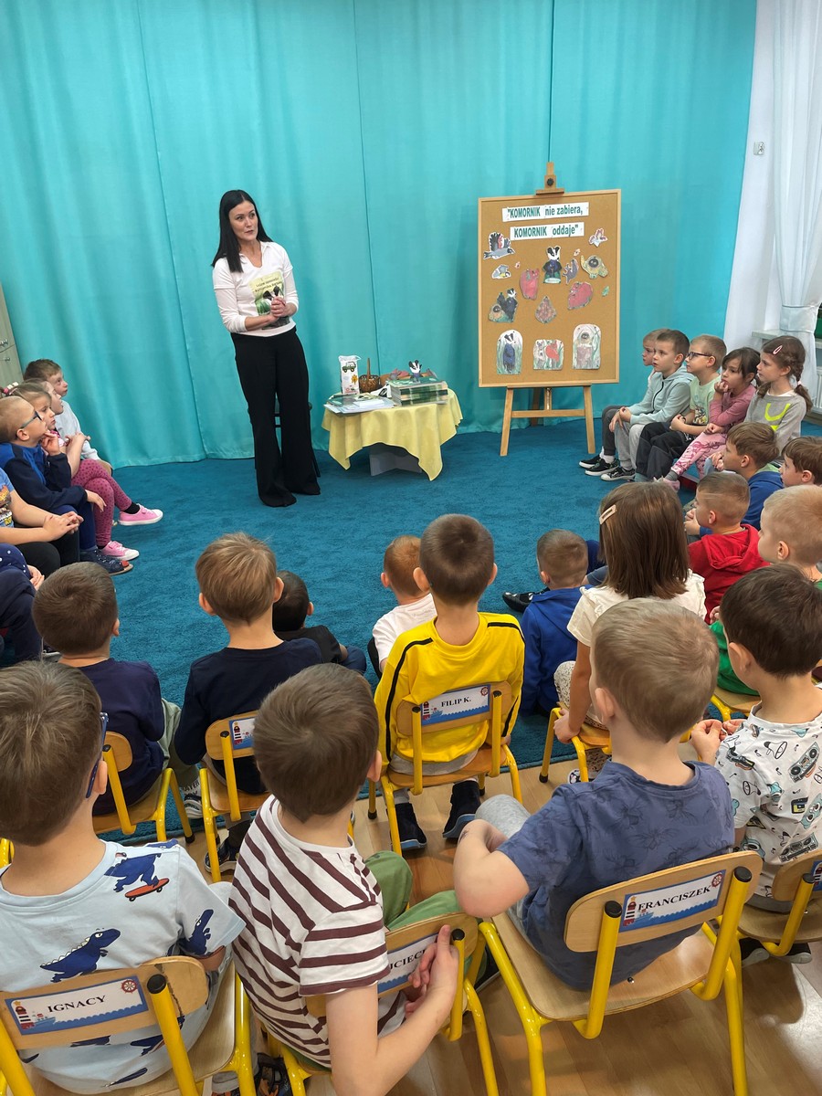 21 listopada w naszym przedszkolu odbyło się wyjątkowe spotkanie z Panią Komornik, które wzbudziło ogromne zainteresowanie wśród dzieci. Gość przeczytał przedszkolakom bajkę, dzięki której w prosty i przystępny sposób wyjaśnił, na czym polega jego praca oraz dlaczego jest ważna. Podczas wizyty Pani Komornik wspólnie z przedszkolakami rozwiązywała i tłumaczyła zagadki. Na zakończenie dzieci miały przygotowany słodki poczęstunek, który wywołał wiele uśmiechów. Spotkanie przebiegło w miłej, serdecznej atmosferze, a dzieci z zainteresowaniem słuchały i aktywnie uczestniczyły w rozmowie. Dzięki takim wizytom nasi podopieczni mają okazję poznawać różne zawody oraz uczyć się poprzez zabawę.