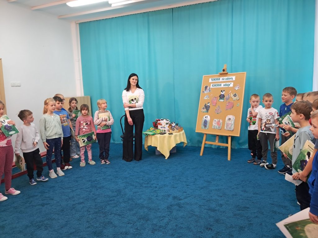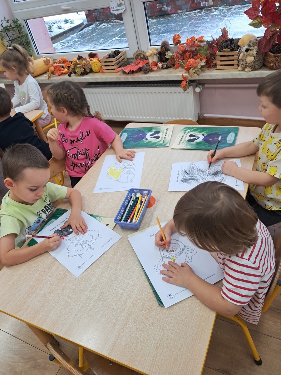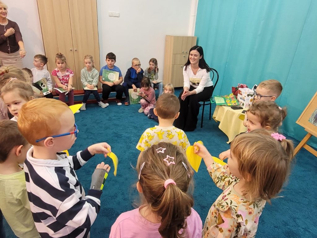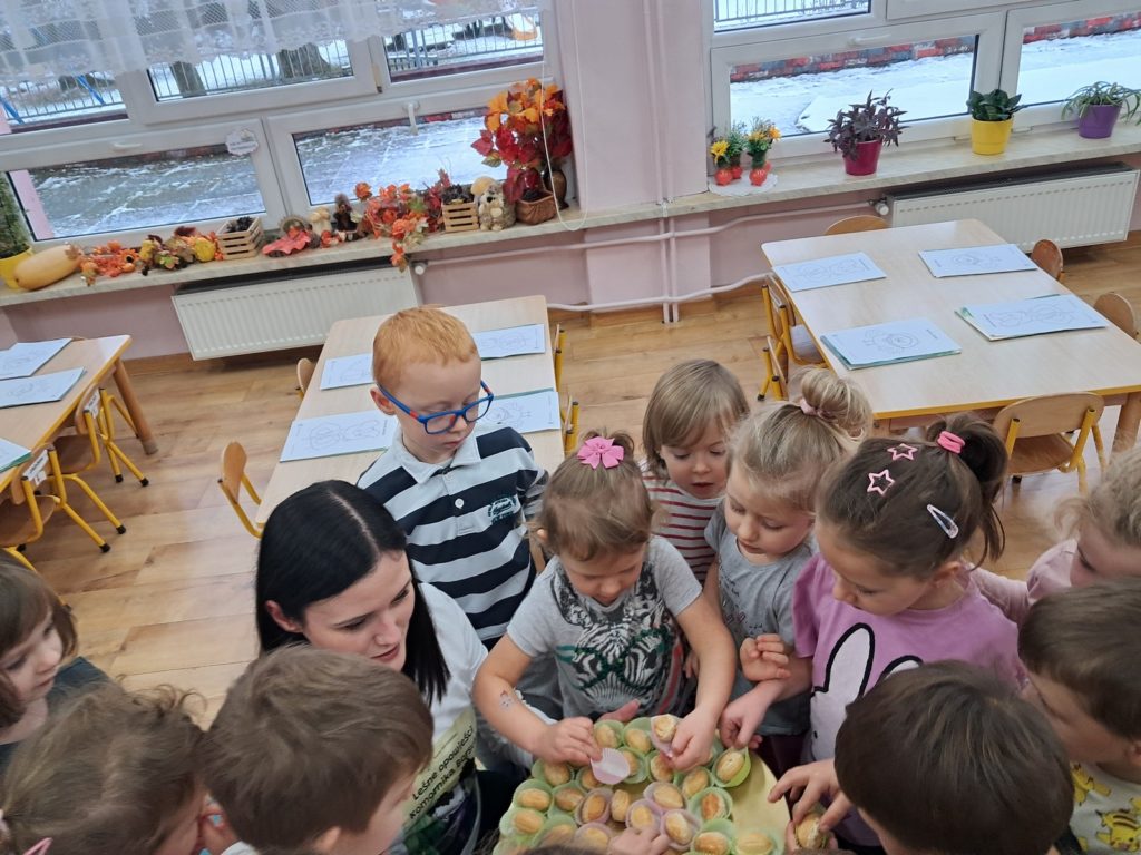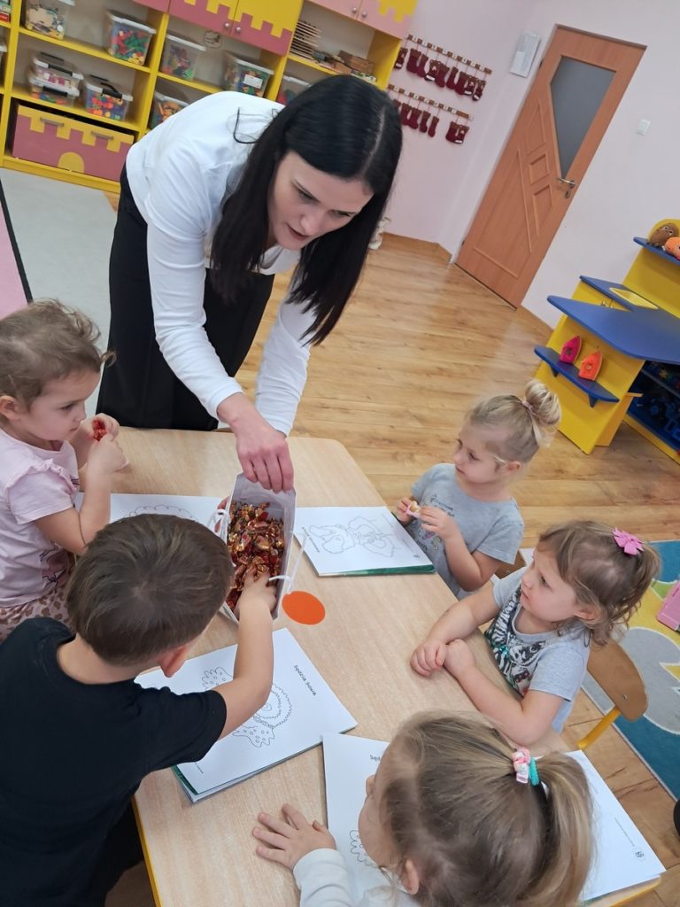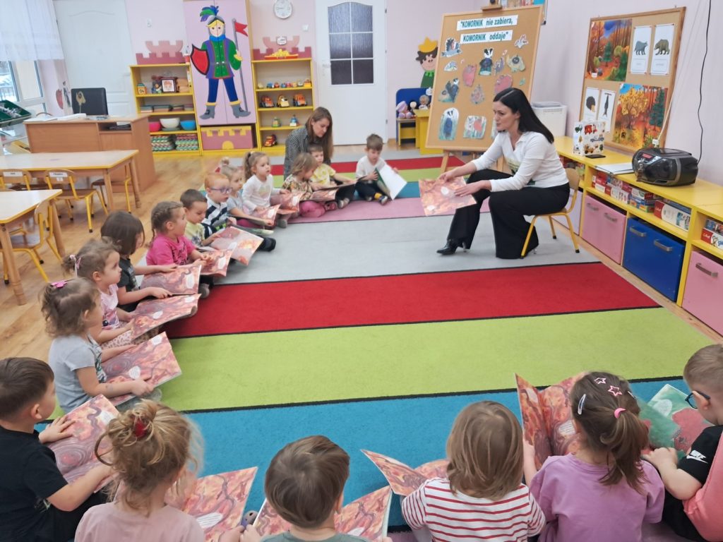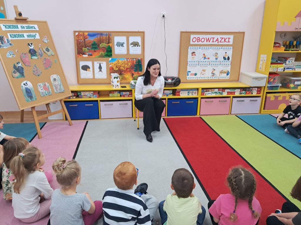 21 listopada 2025r. w naszym przedszkolu odbyło się wyjątkowe spotkanie. Naszym Gościem była Mama Bartusia, która wykonuje zawód komornika sądowego. Pani Kasia podarowała wszystkim dzieciom bajkę pt. ,,Komornik Borsuk i odzyskane orzechy”, a następnie przedstawiła jej treść. W prosty i przystępny sposób wyjaśniła, na czym polega jej praca oraz dlaczego jest ważna. Maluszki zaprosiły miłego Gościa do wspólnej zabawy przy piosence o wiewiórce. Dzieci miały możliwość wyboru kolorowanki z postacią z bajki, którą potem kolorowały. Mama Bartusia poczęstowała Maluszki pysznymi orzeszkami i cukierkami. Spotkanie przebiegło w miłej, serdecznej atmosferze, a dzieci z zainteresowaniem słuchały i aktywnie uczestniczyły w rozmowie i zabawie. Na zakończenie przedszkolaki podziękowały miłemu Gościowi za wizytę, zaśpiewały piosenkę i wręczyły kwiaty. Dzięki takim wizytom nasze przedszkolaki mają okazję poznawać różne zawody oraz uczą się szacunku do różnych profesji.