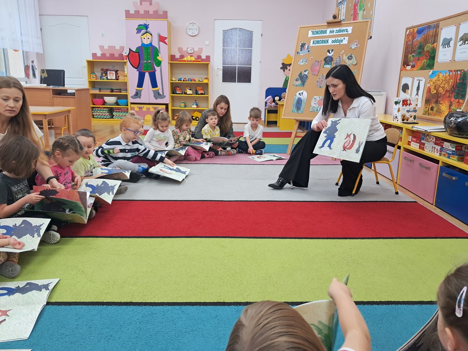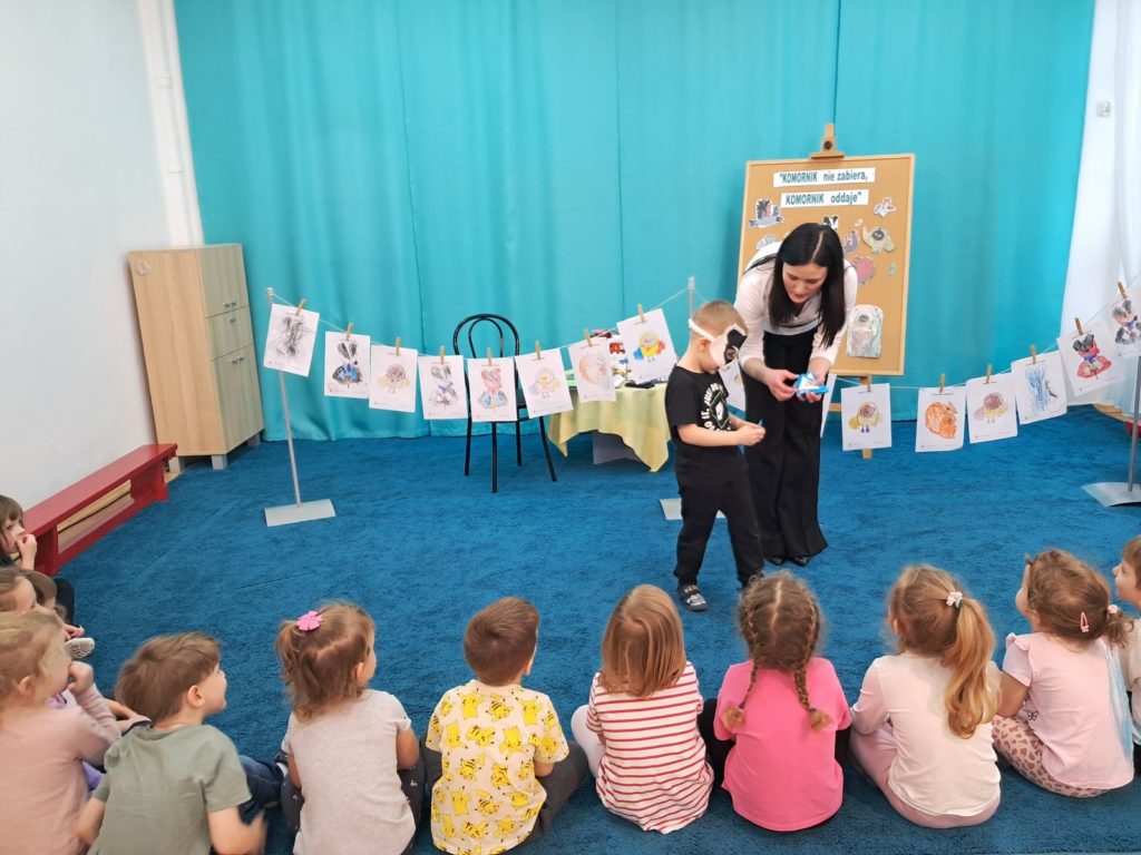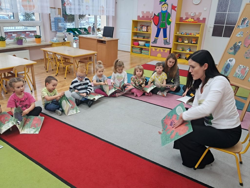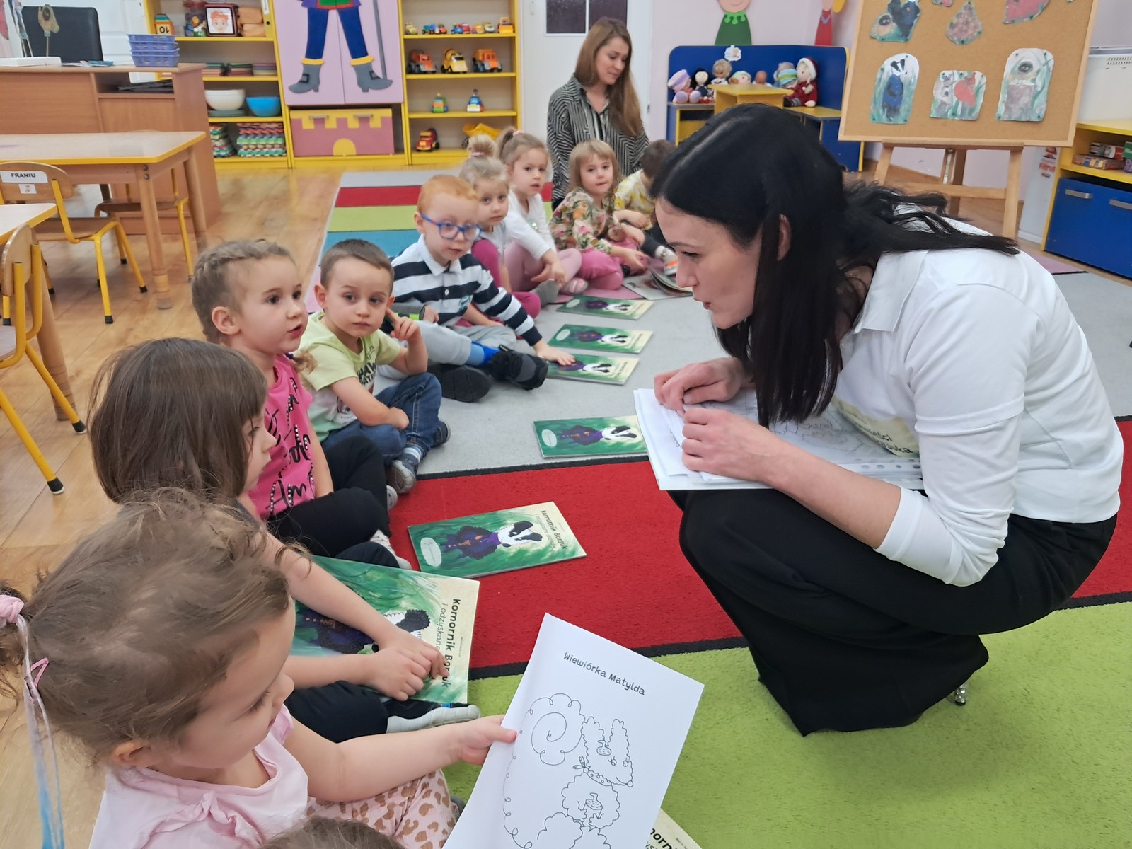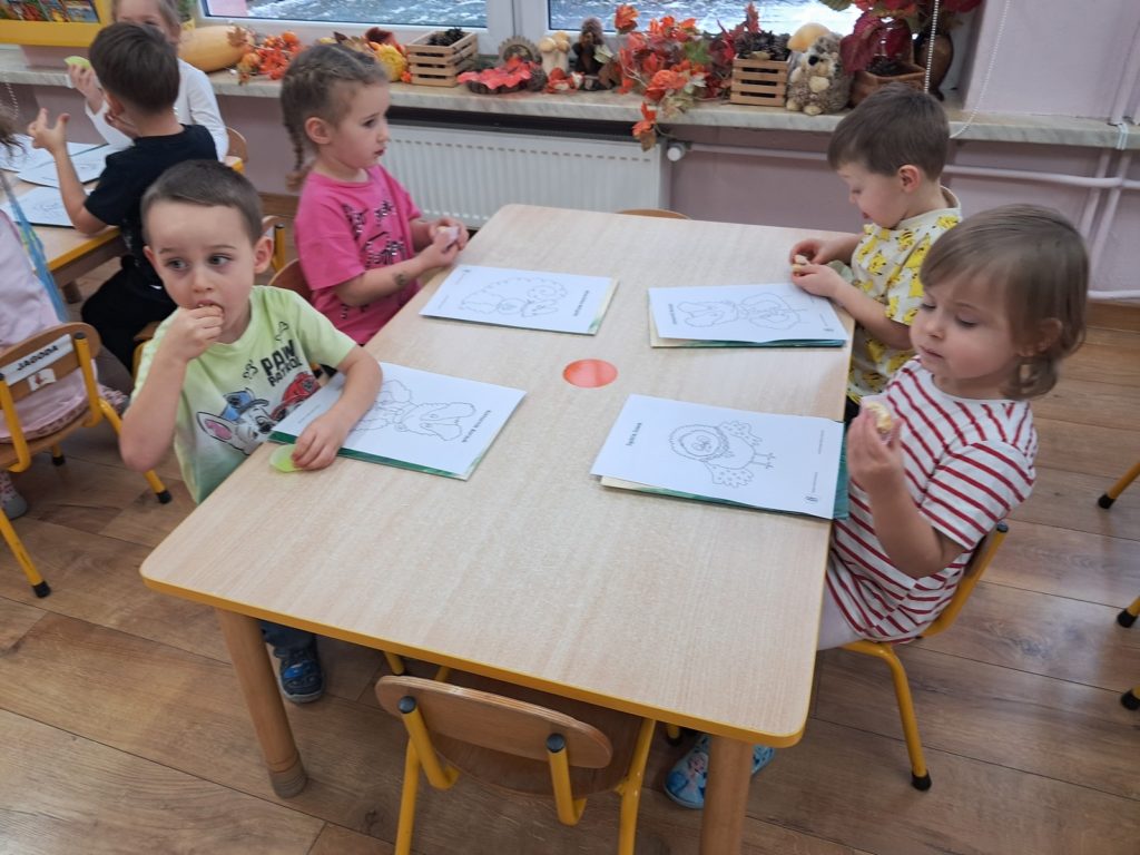 21 listopada 2025r. w naszym przedszkolu odbyło się wyjątkowe spotkanie. Naszym Gościem była Mama Bartusia, która wykonuje zawód komornika sądowego. Pani Kasia podarowała wszystkim dzieciom bajkę pt. ,,Komornik Borsuk i odzyskane orzechy”, a następnie przedstawiła jej treść. W prosty i przystępny sposób wyjaśniła, na czym polega jej praca oraz dlaczego jest ważna. Maluszki zaprosiły miłego Gościa do wspólnej zabawy przy piosence o wiewiórce. Dzieci miały możliwość wyboru kolorowanki z postacią z bajki, którą potem kolorowały. Mama Bartusia poczęstowała Maluszki pysznymi orzeszkami i cukierkami. Spotkanie przebiegło w miłej, serdecznej atmosferze, a dzieci z zainteresowaniem słuchały i aktywnie uczestniczyły w rozmowie i zabawie. Na zakończenie przedszkolaki podziękowały miłemu Gościowi za wizytę, zaśpiewały piosenkę i wręczyły kwiaty. Dzięki takim wizytom nasze przedszkolaki mają okazję poznawać różne zawody oraz uczą się szacunku do różnych profesji.