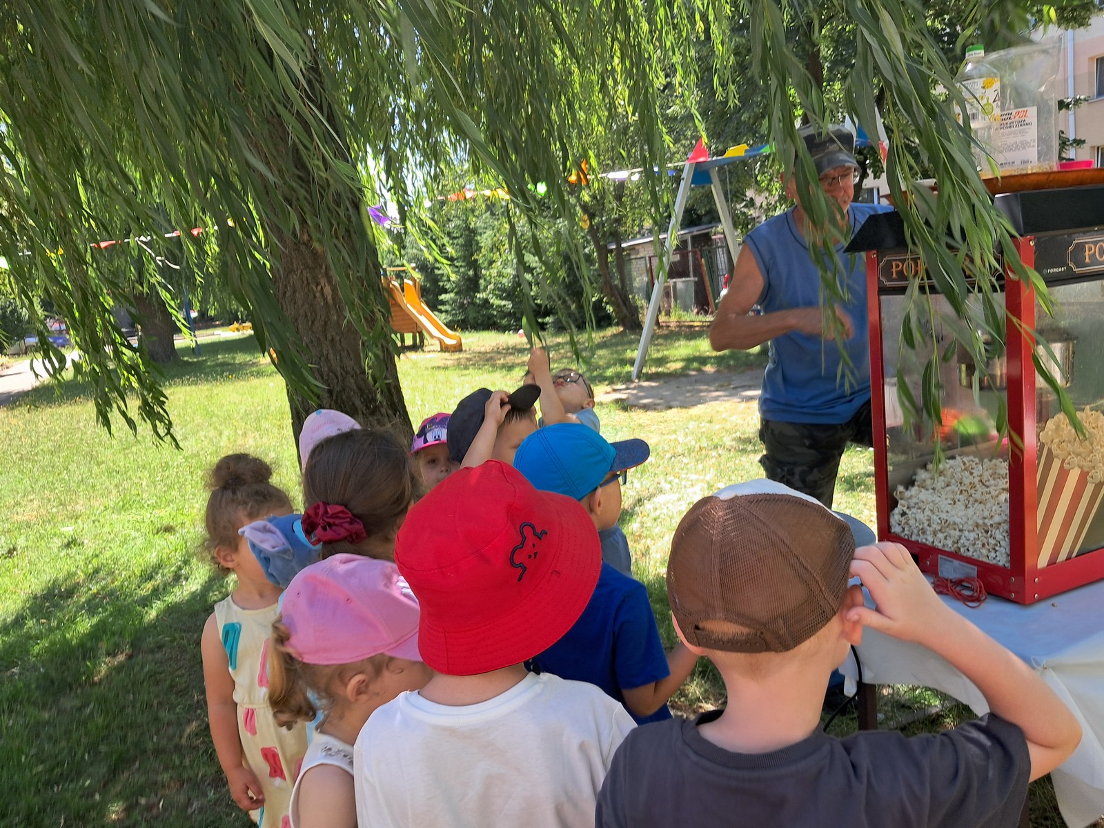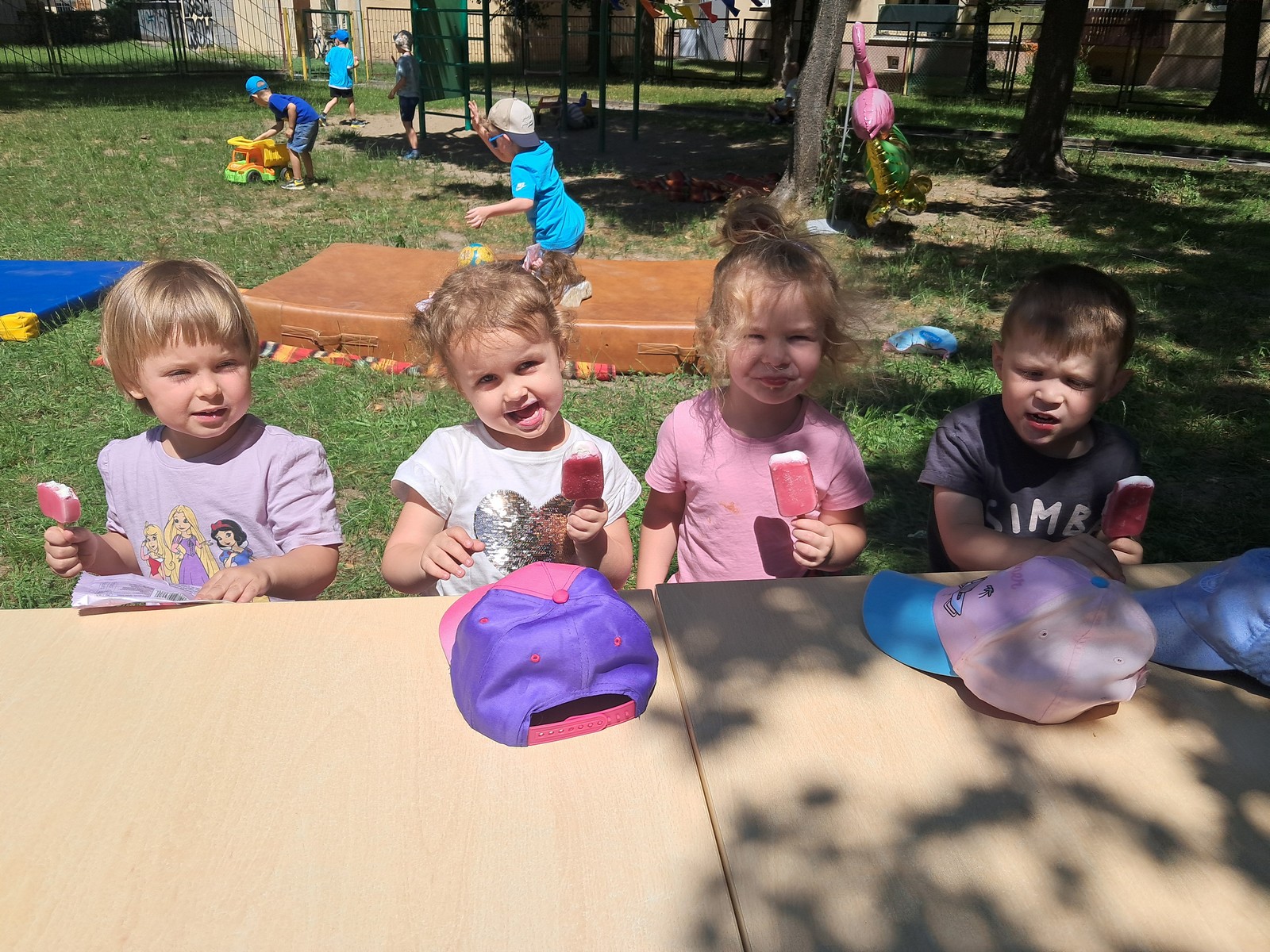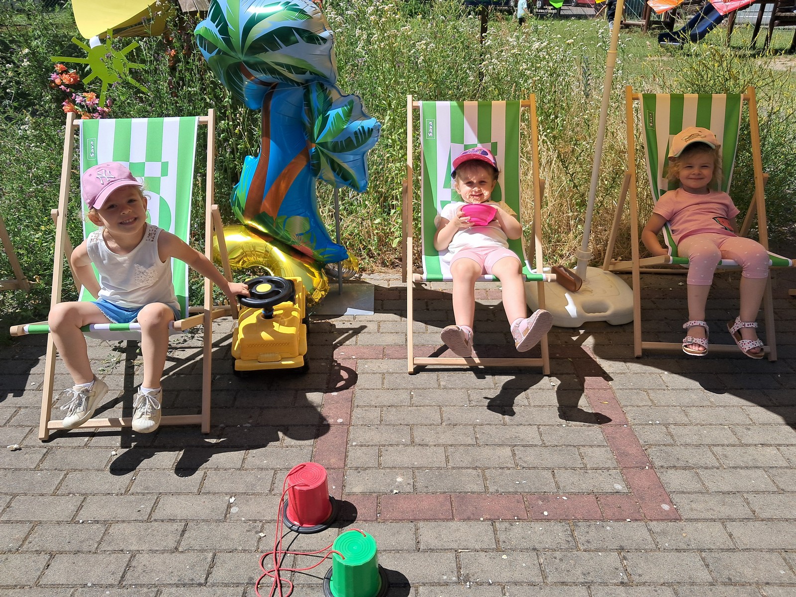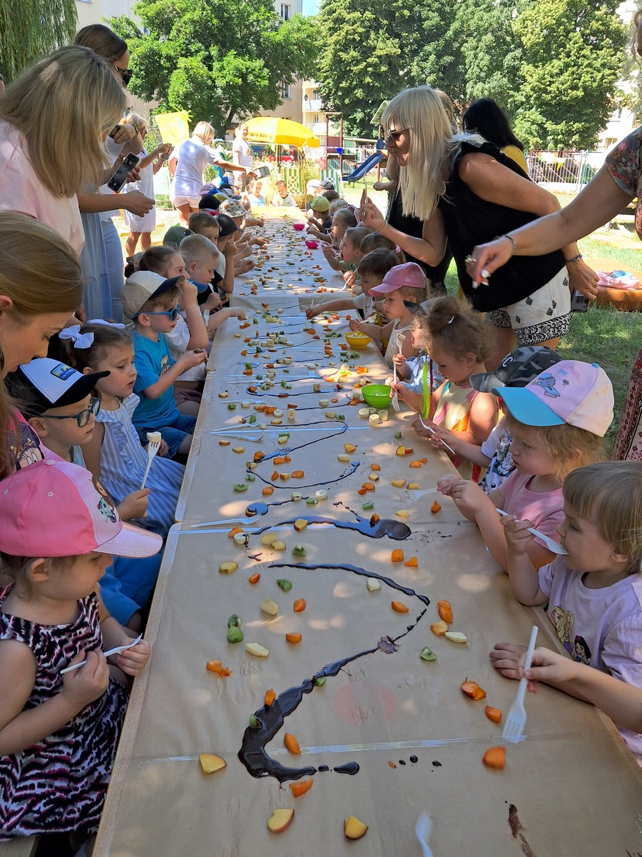 30 czerwca 2025r. był bardzo przyjemnym dniem w przedszkolu. Krasnalki, tak jak wszystkie przedszkolaki, długo czekały na wakacje. Już od rana, przy dźwiękach muzyki, dzieci wraz z Rodzicami, wchodziły do przedszkola tanecznym krokiem. Nadszedł czas wypoczynku. Hasłem tego dnia było: ,,Odpalamy wakacje”. I właśnie ta radość towarzyszyła wszystkim dzieciom i paniom oraz panu Andrzejowi. Dzień był szczególnie słoneczny i wesoły. Przedszkolaki z wszystkich grup bawiły się tak, jak miały na to ochotę. Pokonywały tory przeszkód, budowały ciekawe konstrukcje z dużych klocków, odpoczywały na kocach lub na leżakach, rysowały, jeździły na samochodzikach, bawiły się piłką, wózkami i lalkami. W tym czasie także częstowały się przy wspólnym stole: owocami polanymi czekoladą, specjalnie upieczonym ciastem. Pan Andrzej przygotował dla dzieci pyszny popcorn, a pani Ania intendentka i pani Dyrektor poczęstowała dzieci truskawkowymi lodami. Na zakończenie wspólnego pobytu w ogrodzie przedszkolnym dzieci zjadły obiad na świeżym powietrzu. Dzień był udany i pełen wrażeń. Na pewno stał się miłym początkiem WAKACJI.