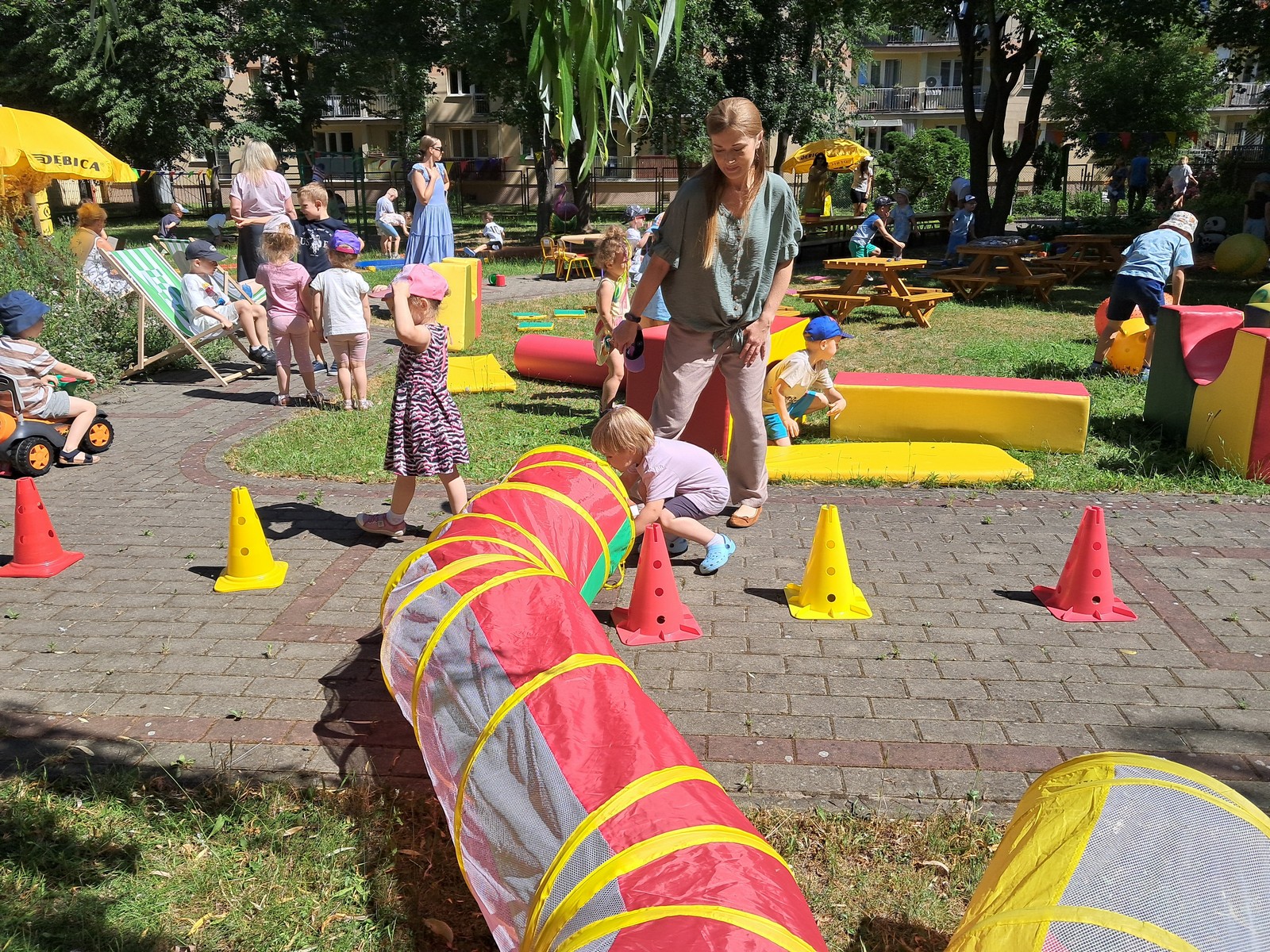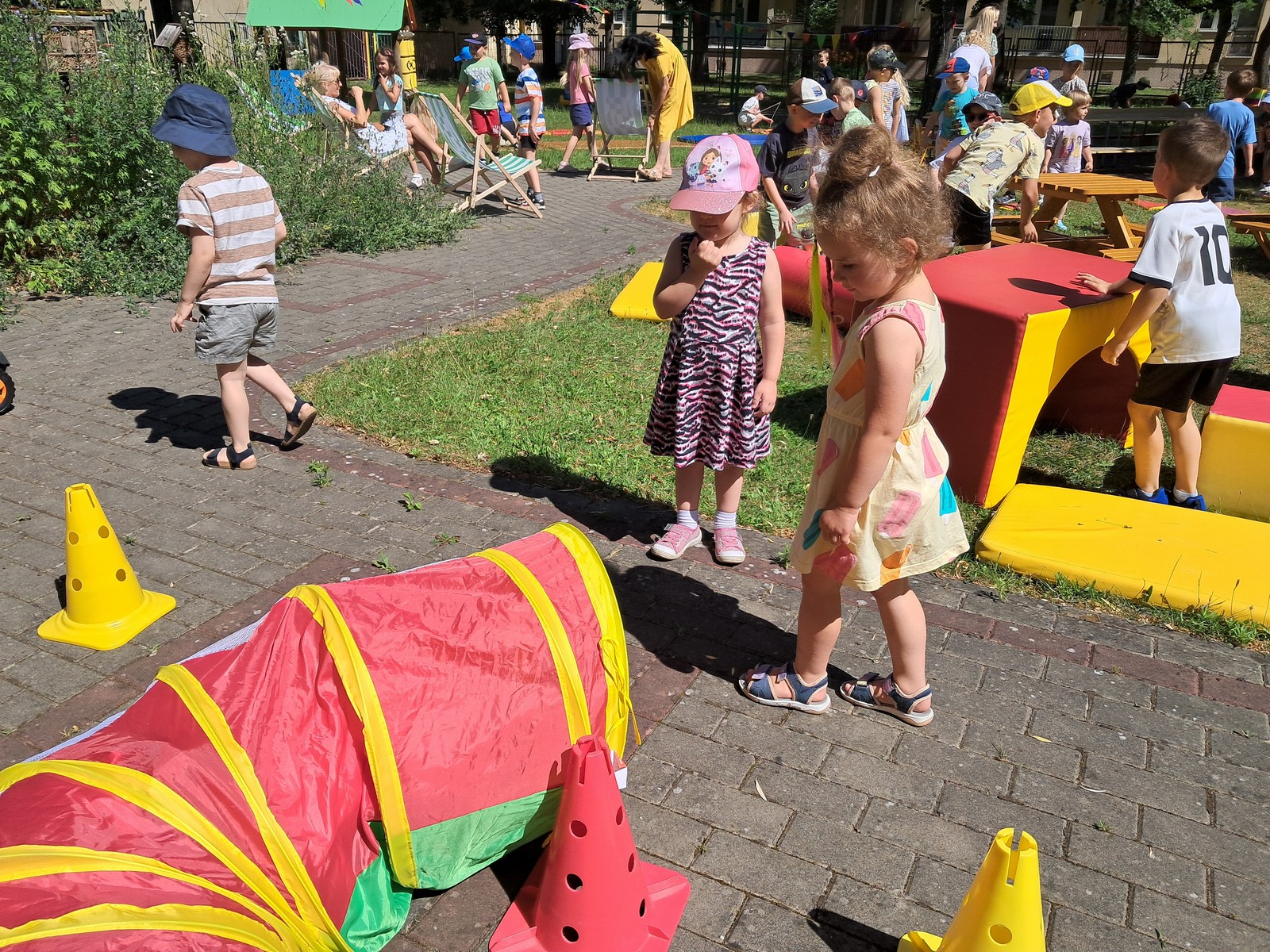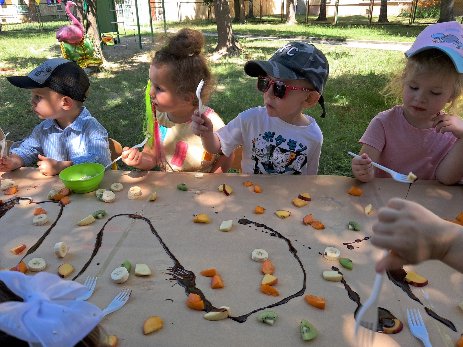 30 czerwca 2025r. był bardzo przyjemnym dniem w przedszkolu. Krasnalki, tak jak wszystkie przedszkolaki, długo czekały na wakacje. Już od rana, przy dźwiękach muzyki, dzieci wraz z Rodzicami, wchodziły do przedszkola tanecznym krokiem. Nadszedł czas wypoczynku. Hasłem tego dnia było: ,,Odpalamy wakacje”. I właśnie ta radość towarzyszyła wszystkim dzieciom i paniom oraz panu Andrzejowi. Dzień był szczególnie słoneczny i wesoły. Przedszkolaki z wszystkich grup bawiły się tak, jak miały na to ochotę. Pokonywały tory przeszkód, budowały ciekawe konstrukcje z dużych klocków, odpoczywały na kocach lub na leżakach, rysowały, jeździły na samochodzikach, bawiły się piłką, wózkami i lalkami. W tym czasie także częstowały się przy wspólnym stole: owocami polanymi czekoladą, specjalnie upieczonym ciastem. Pan Andrzej przygotował dla dzieci pyszny popcorn, a pani Ania intendentka i pani Dyrektor poczęstowała dzieci truskawkowymi lodami. Na zakończenie wspólnego pobytu w ogrodzie przedszkolnym dzieci zjadły obiad na świeżym powietrzu. Dzień był udany i pełen wrażeń. Na pewno stał się miłym początkiem WAKACJI.