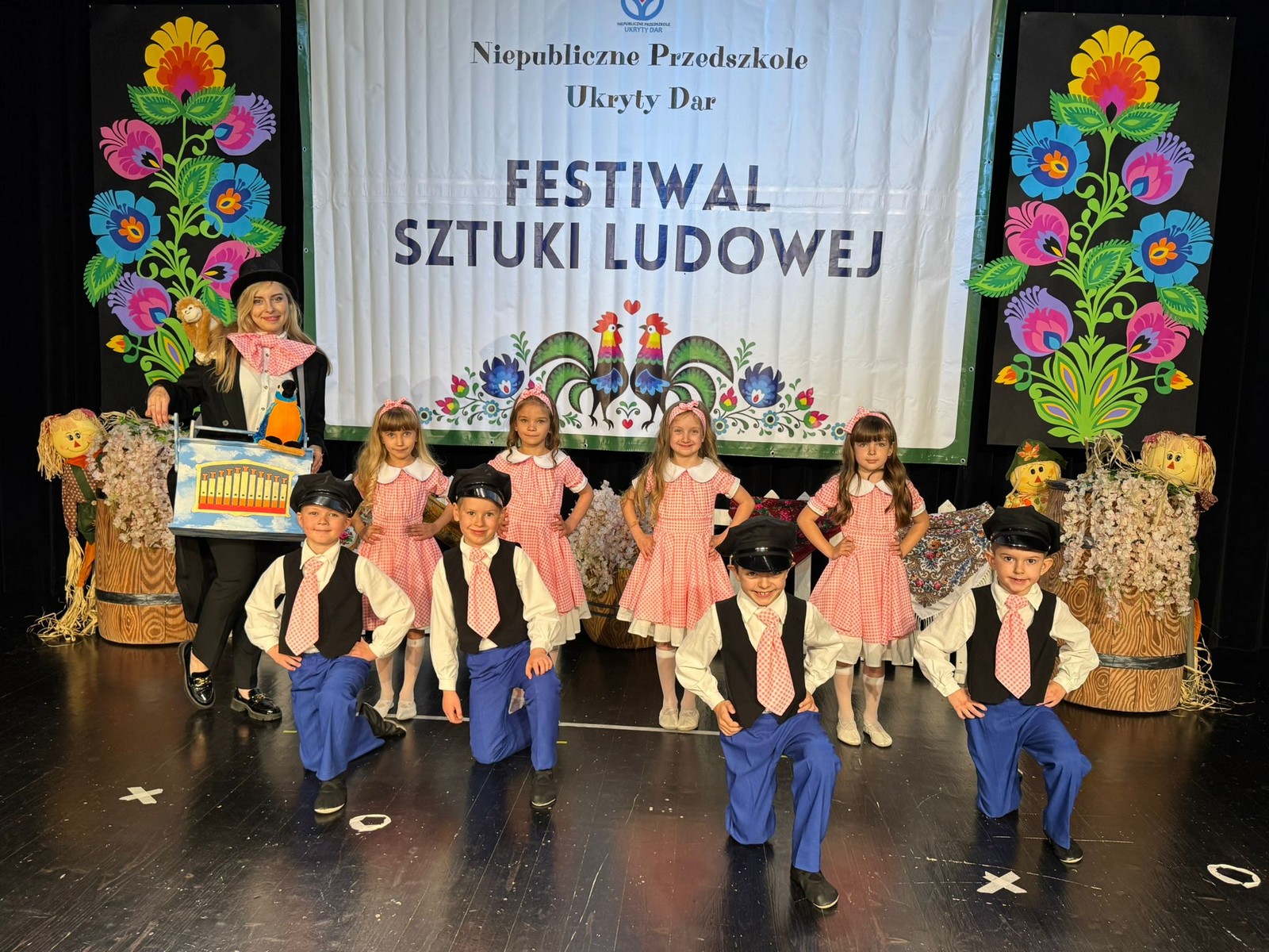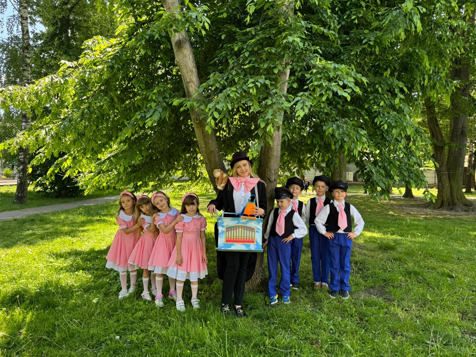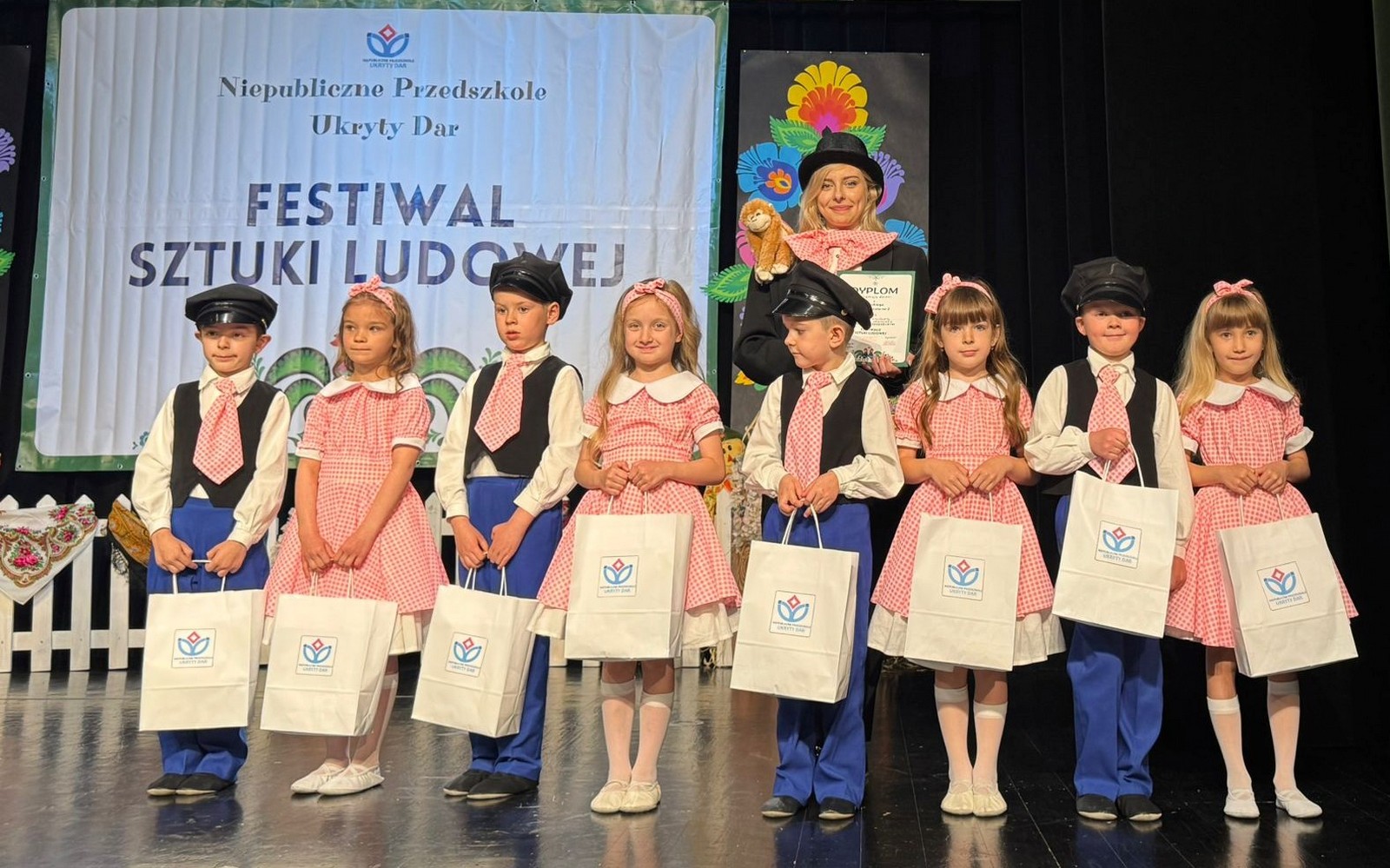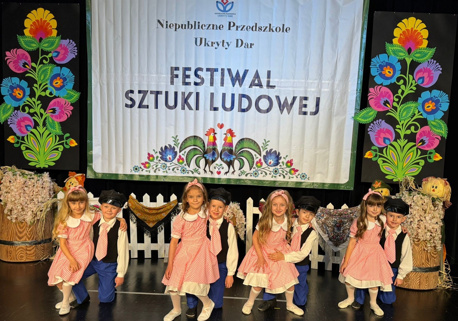21 maja w Domu Kultury „Śnieżka” odbyła się II edycja Międzyprzedszkolnego Festiwalu Sztuki Ludowej pod hasłem „Dokoluśka, a żywo” zorganizowany przez Niepubliczne Przedszkole ,,Ukryty Dar”. Nasze Przedszkole z dumą reprezentowała grupa dzieci: Liliana, Julia, Aleksandra, Wiktoria, Mikołaj B. Tymon, Dariusz oraz Antoni W. prezentując polkę warszawską! Starszaki wystąpiły z ogromnym wdziękiem i dumą, zachwycając widownię swoim strojem, ruchem i skupieniem. Za udział w festiwalu każdy uczestnik otrzymał nagrody oraz pamiątkowy dyplom. Głównym celem wydarzenia było popularyzowanie sztuki ludowej wśród najmłodszych, rozwijanie wrażliwości muzycznej, wspieranie uzdolnień dzieci oraz stworzenie im przestrzeni do prezentacji swoich talentów.