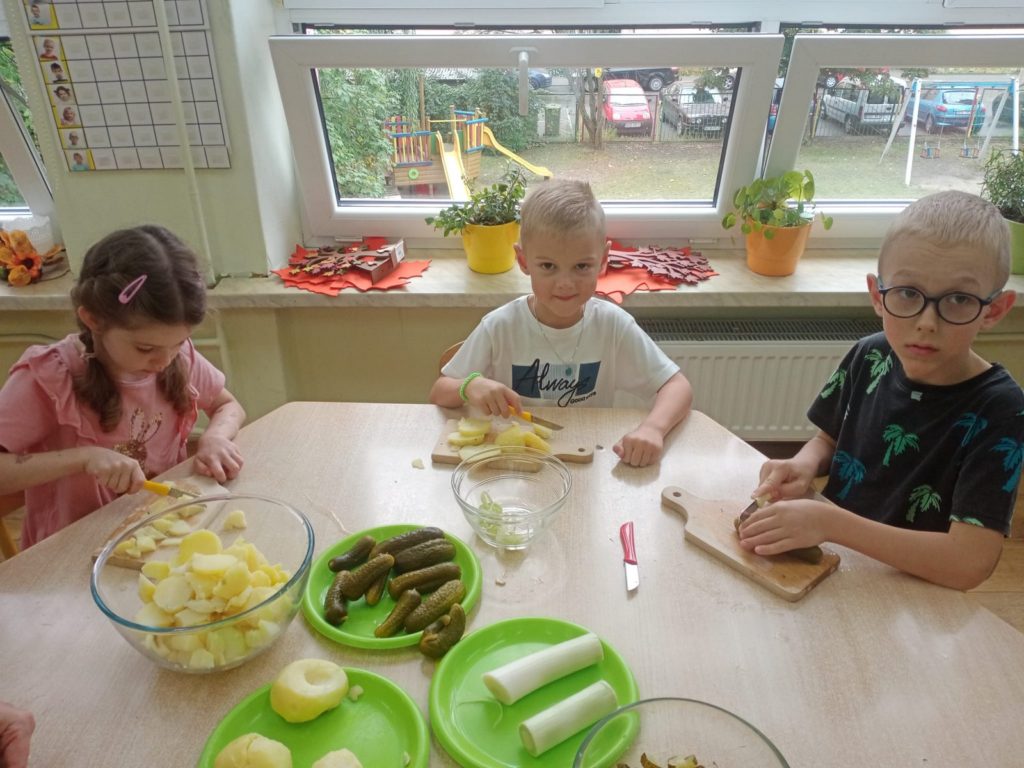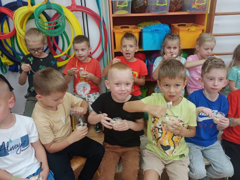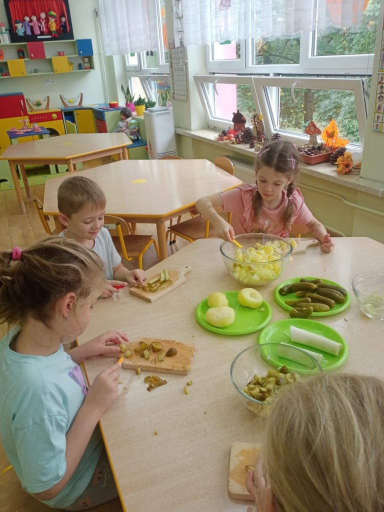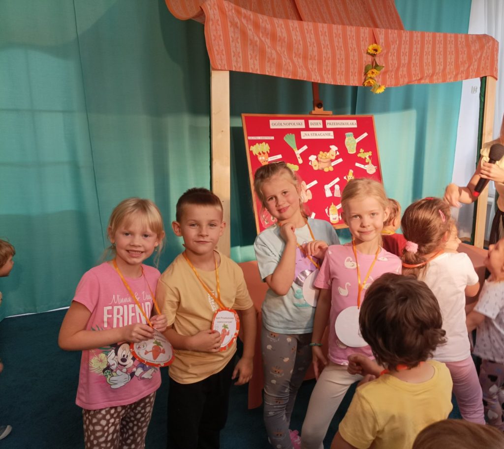 W piątek, 19 września, nasze przedszkolaki poczuły się wyjątkowo. W przedszkolu tego dnia świętowaliśmy Dzień Przedszkolaka. Pracownicy przedszkola przygotowali dla dzieci specjalne atrakcje: inscenizację znanego wiersza „Na straganie” – wcielając się w rolę warzyw, zagadki, zabawy ruchowe, konkursy. Ponadto dzieci z wszystkich grup miały okazję wspólnie przygotować sałatkę jarzynową. Każda grupa otrzymała wybrane składniki do krojenia. Po zakończonej pracy, przedszkolaki spotkały się na sali gimnastycznej, gdzie czekała na nich Pani Justynka, nasza Kucharka. Pod jej bacznym okiem pokrojone warzywa zostały połączone, wymieszane i doprawione. Sałatka była pyszna i zdrowa dlatego szybko została zjedzona. Tego dnia dzieci przyniosły także własnoręcznie wykonane warzywa, które pięknie wypełniły stragan na naszym przedszkolnym korytarzu. Dodatkowo wszystkie cztery stragany zostały ocenione przez Rodziców i dzieci, a po głosowaniu każdy mógł poczęstować się soczystym jabłuszkiem.