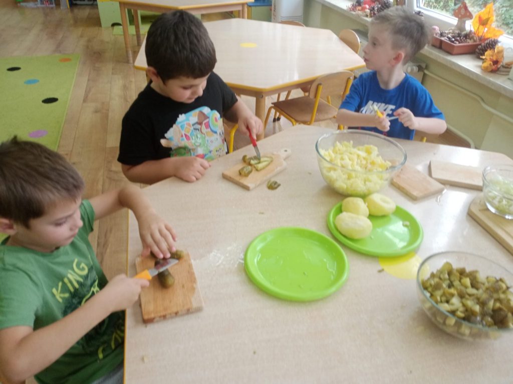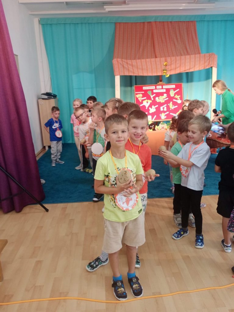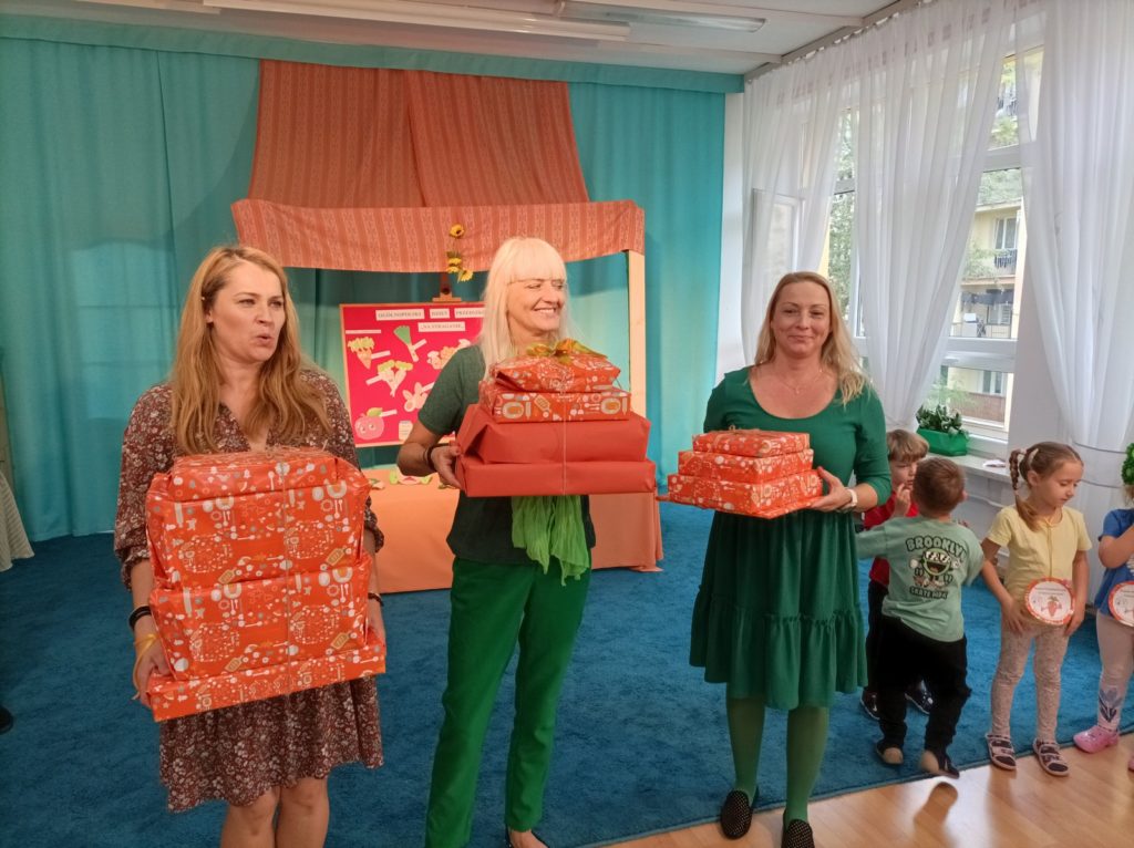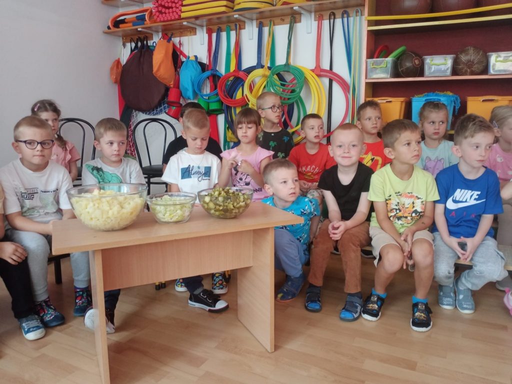 W piątek, 19 września, nasze przedszkolaki poczuły się wyjątkowo. W przedszkolu tego dnia świętowaliśmy Dzień Przedszkolaka. Pracownicy przedszkola przygotowali dla dzieci specjalne atrakcje: inscenizację znanego wiersza „Na straganie” – wcielając się w rolę warzyw, zagadki, zabawy ruchowe, konkursy. Ponadto dzieci z wszystkich grup miały okazję wspólnie przygotować sałatkę jarzynową. Każda grupa otrzymała wybrane składniki do krojenia. Po zakończonej pracy, przedszkolaki spotkały się na sali gimnastycznej, gdzie czekała na nich Pani Justynka, nasza Kucharka. Pod jej bacznym okiem pokrojone warzywa zostały połączone, wymieszane i doprawione. Sałatka była pyszna i zdrowa dlatego szybko została zjedzona. Tego dnia dzieci przyniosły także własnoręcznie wykonane warzywa, które pięknie wypełniły stragan na naszym przedszkolnym korytarzu. Dodatkowo wszystkie cztery stragany zostały ocenione przez Rodziców i dzieci, a po głosowaniu każdy mógł poczęstować się soczystym jabłuszkiem.