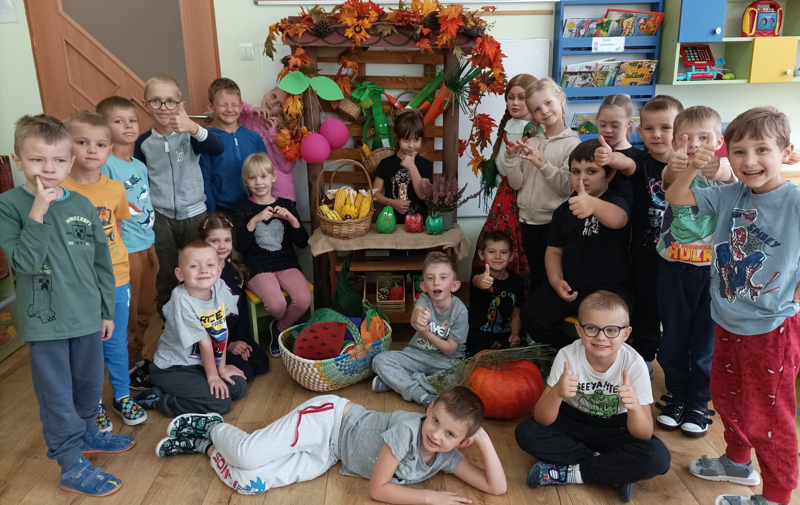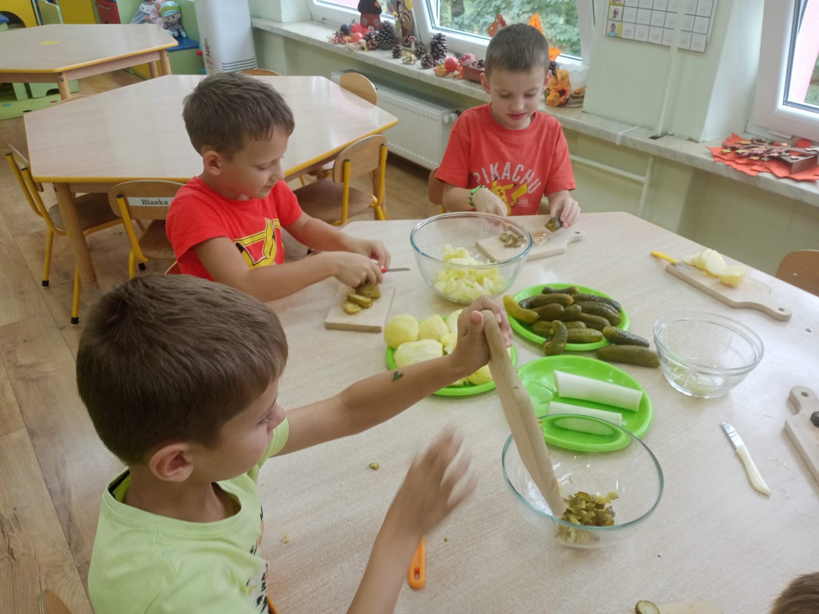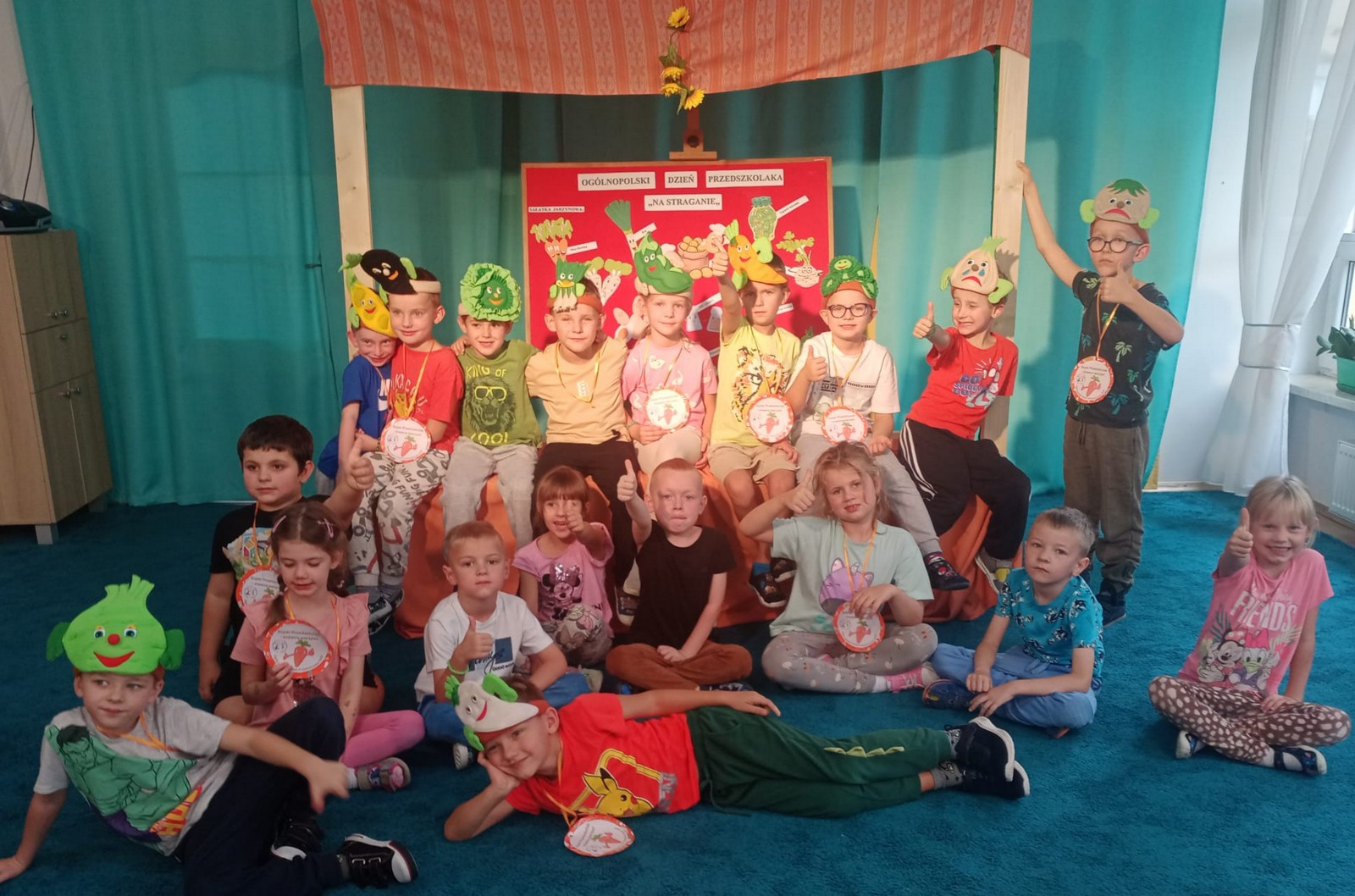 W piątek, 19 września, nasze przedszkolaki poczuły się wyjątkowo. W przedszkolu tego dnia świętowaliśmy Dzień Przedszkolaka. Pracownicy przedszkola przygotowali dla dzieci specjalne atrakcje: inscenizację znanego wiersza „Na straganie” – wcielając się w rolę warzyw, zagadki, zabawy ruchowe, konkursy. Ponadto dzieci z wszystkich grup miały okazję wspólnie przygotować sałatkę jarzynową. Każda grupa otrzymała wybrane składniki do krojenia. Po zakończonej pracy, przedszkolaki spotkały się na sali gimnastycznej, gdzie czekała na nich Pani Justynka, nasza Kucharka. Pod jej bacznym okiem pokrojone warzywa zostały połączone, wymieszane i doprawione. Sałatka była pyszna i zdrowa dlatego szybko została zjedzona. Tego dnia dzieci przyniosły także własnoręcznie wykonane warzywa, które pięknie wypełniły stragan na naszym przedszkolnym korytarzu. Dodatkowo wszystkie cztery stragany zostały ocenione przez Rodziców i dzieci, a po głosowaniu każdy mógł poczęstować się soczystym jabłuszkiem.