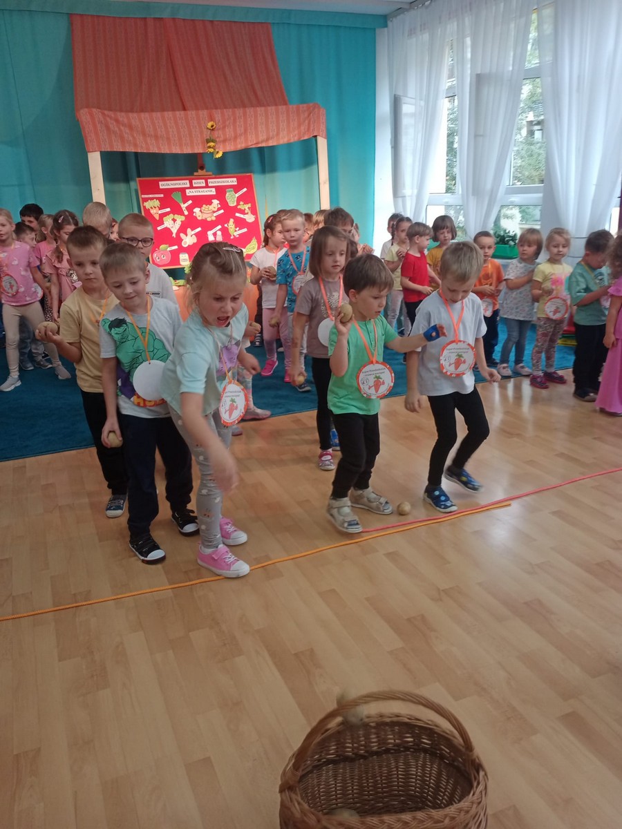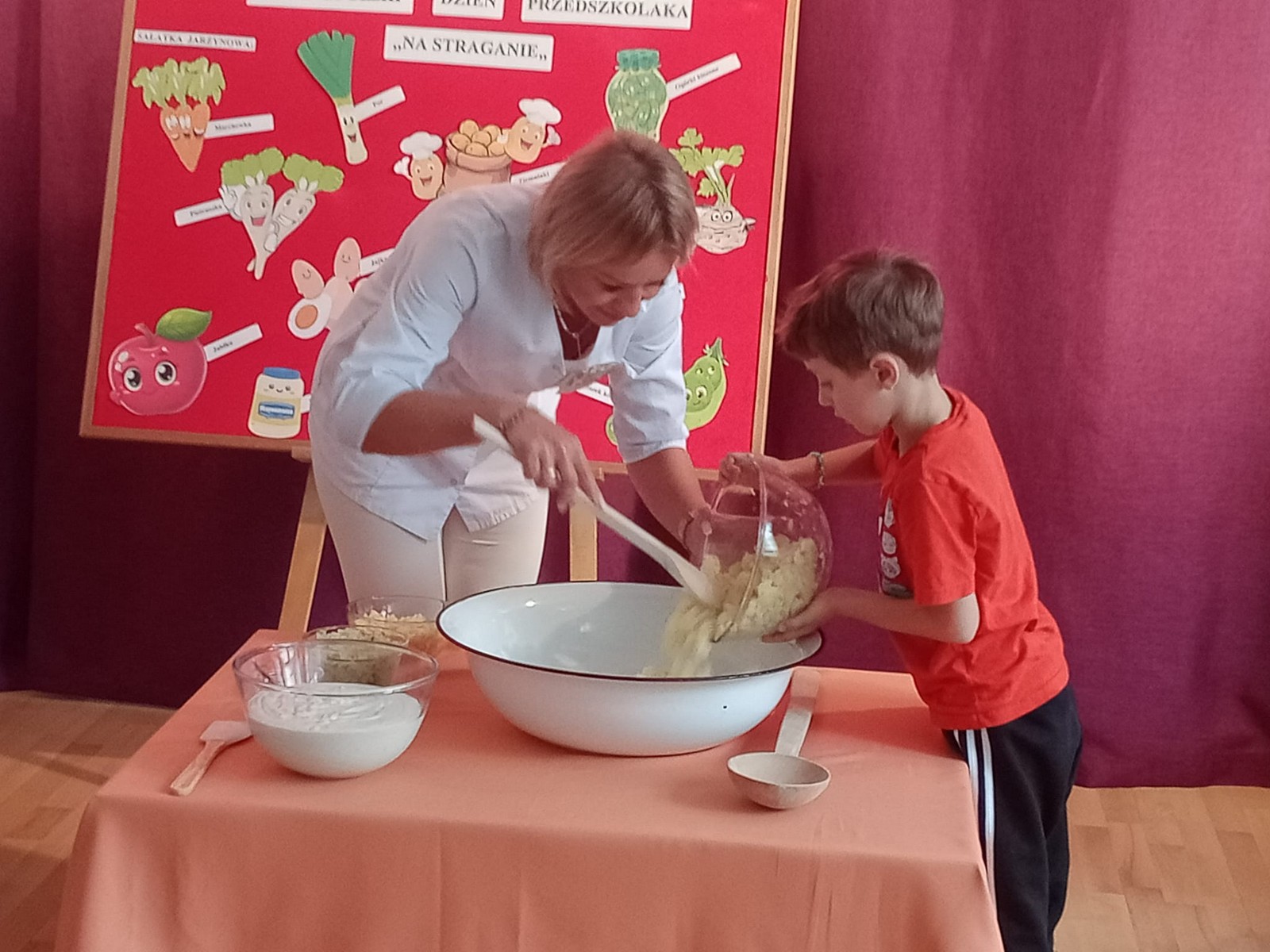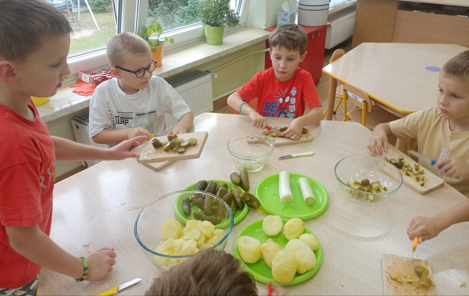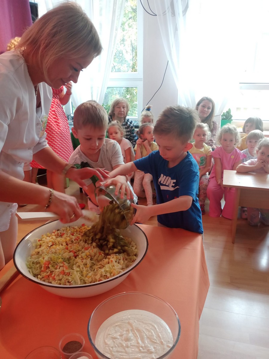 W piątek, 19 września, nasze przedszkolaki poczuły się wyjątkowo. W przedszkolu tego dnia świętowaliśmy Dzień Przedszkolaka. Pracownicy przedszkola przygotowali dla dzieci specjalne atrakcje: inscenizację znanego wiersza „Na straganie” – wcielając się w rolę warzyw, zagadki, zabawy ruchowe, konkursy. Ponadto dzieci z wszystkich grup miały okazję wspólnie przygotować sałatkę jarzynową. Każda grupa otrzymała wybrane składniki do krojenia. Po zakończonej pracy, przedszkolaki spotkały się na sali gimnastycznej, gdzie czekała na nich Pani Justynka, nasza Kucharka. Pod jej bacznym okiem pokrojone warzywa zostały połączone, wymieszane i doprawione. Sałatka była pyszna i zdrowa dlatego szybko została zjedzona. Tego dnia dzieci przyniosły także własnoręcznie wykonane warzywa, które pięknie wypełniły stragan na naszym przedszkolnym korytarzu. Dodatkowo wszystkie cztery stragany zostały ocenione przez Rodziców i dzieci, a po głosowaniu każdy mógł poczęstować się soczystym jabłuszkiem.