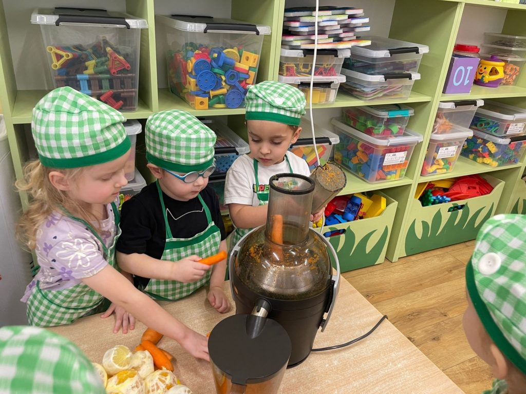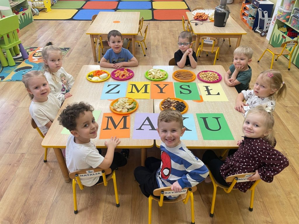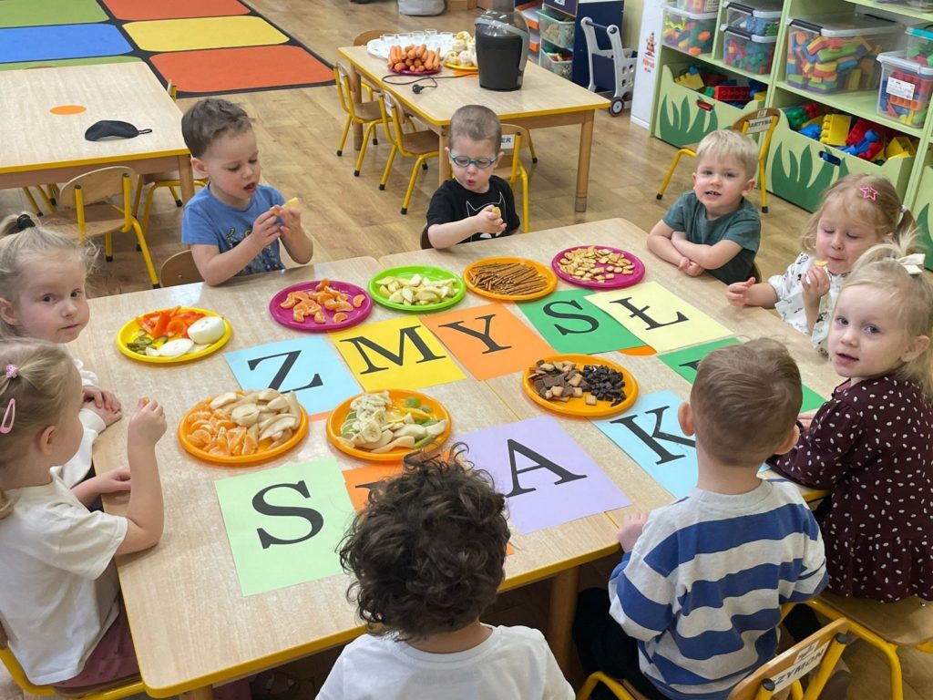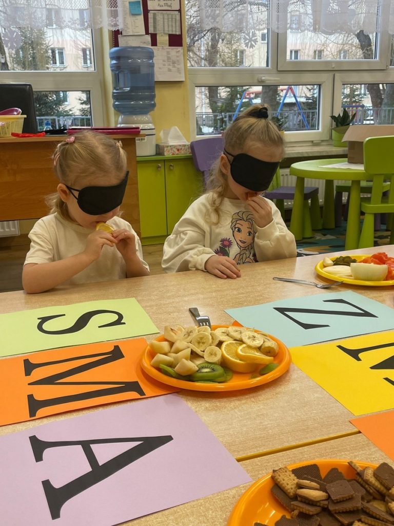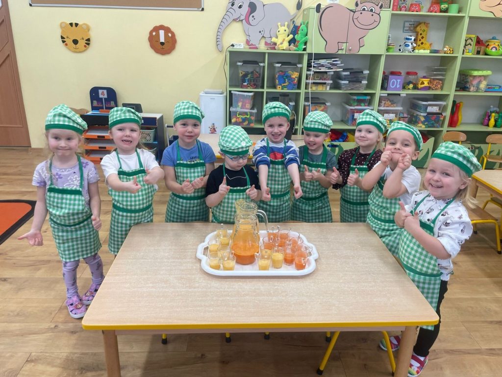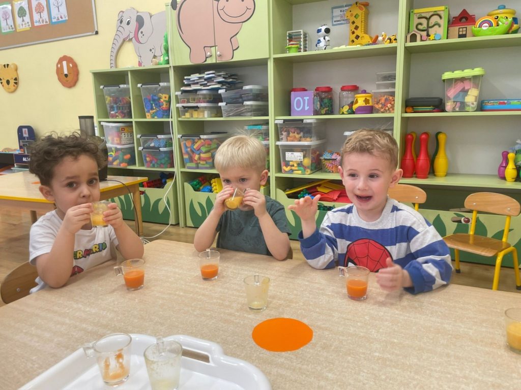 „Pięć zmysłów mamy, więc je odkrywamy to innowacja pedagogiczna, która pozwala naszym Krasnalkom poznawać świat poprzez aktywne doświadczanie wszystkimi zmysłami. 30 stycznia skupiliśmy się na zmyśle smaku, który pozwala dzieciom odkrywać różnorodność potraw i uczy świadomego poznawania tego, co jemy. Podczas zajęć Krasnalki próbowały różnych smaków: słodkiego, słonego, kwaśnego i gorzkiego, ucząc się je rozpoznawać i nazywać. Dodatkową atrakcją było wspólne przygotowanie soku – dzieci samodzielnie wybierały owoce i warzywa, poznawały ich smak i zapach, a następnie z ogromną radością degustowały własnoręcznie wykonany napój. Było mnóstwo emocji, ciekawości i radości z odkrywania nowych doznań smakowych.