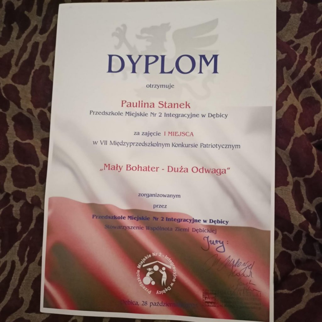Z radością informujemy, że Paulina z grupy III zdobyła pierwsze miejsce w międzyprzedszkolnym konkursie plastycznym „Mały bohater – duża odwaga”. Jej praca zachwyciła jury pomysłowością oraz pięknym ukazaniem tematu odwagi w codziennych sytuacjach.