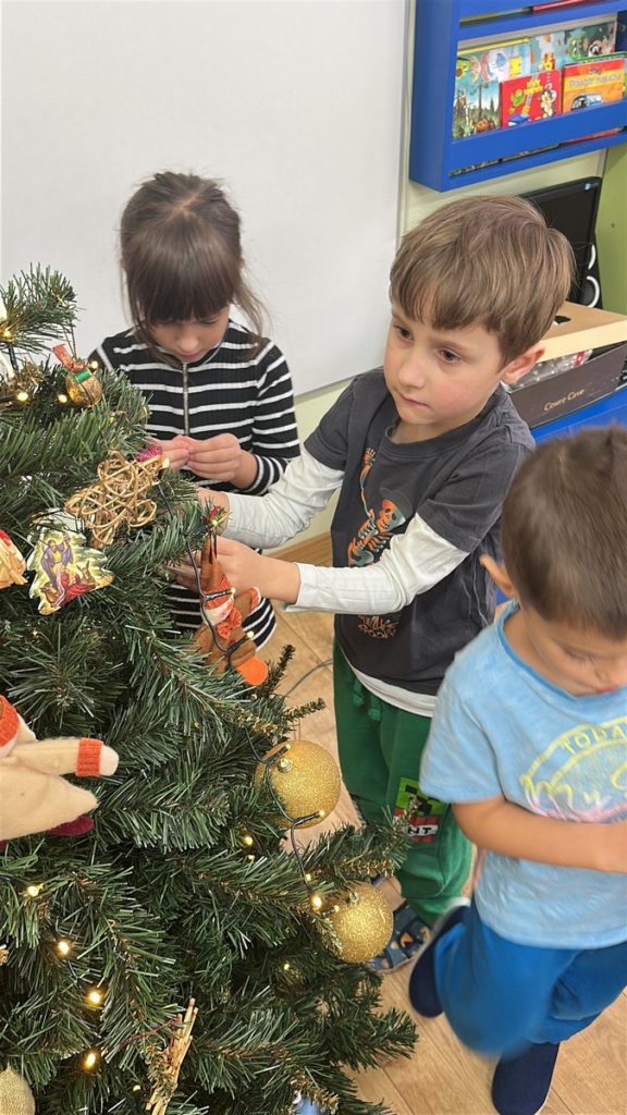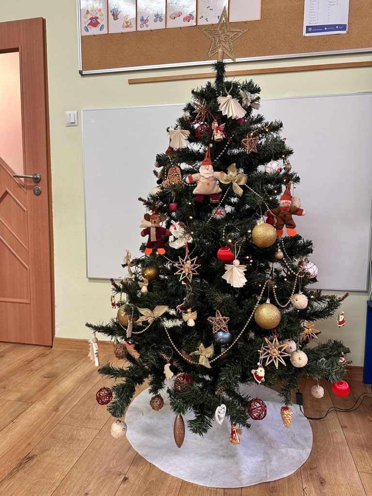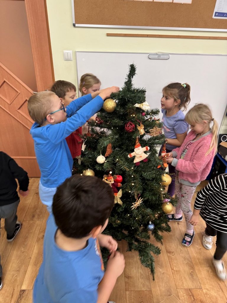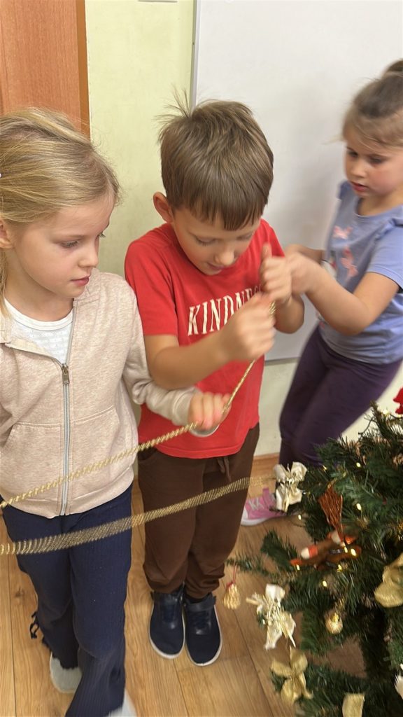 Ubieranie choinki – to moment , na który z niecierpliwością czekały wszystkie przedszkolaki. Starszaki z zapałem przystąpiły do zawieszania na gałązkach ozdób, łańcuchów i kolorowych lampek. Drzewko zostało przystrojone bardzo szybko, wygląda wyjątkowo i przypomina nam, że Święta Bożego Narodzenia zbliżają się tuż, tuż…
