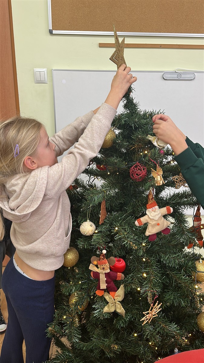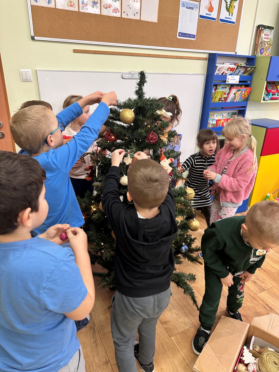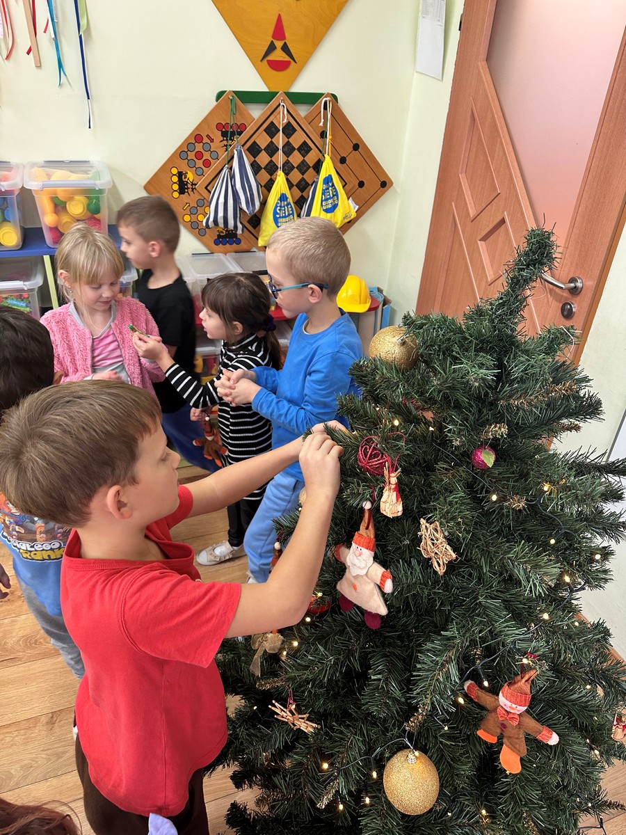 Ubieranie choinki – to moment , na który z niecierpliwością czekały wszystkie przedszkolaki. Starszaki z zapałem przystąpiły do zawieszania na gałązkach ozdób, łańcuchów i kolorowych lampek. Drzewko zostało przystrojone bardzo szybko, wygląda wyjątkowo i przypomina nam, że Święta Bożego Narodzenia zbliżają się tuż, tuż…