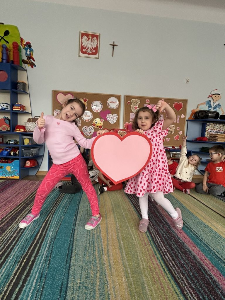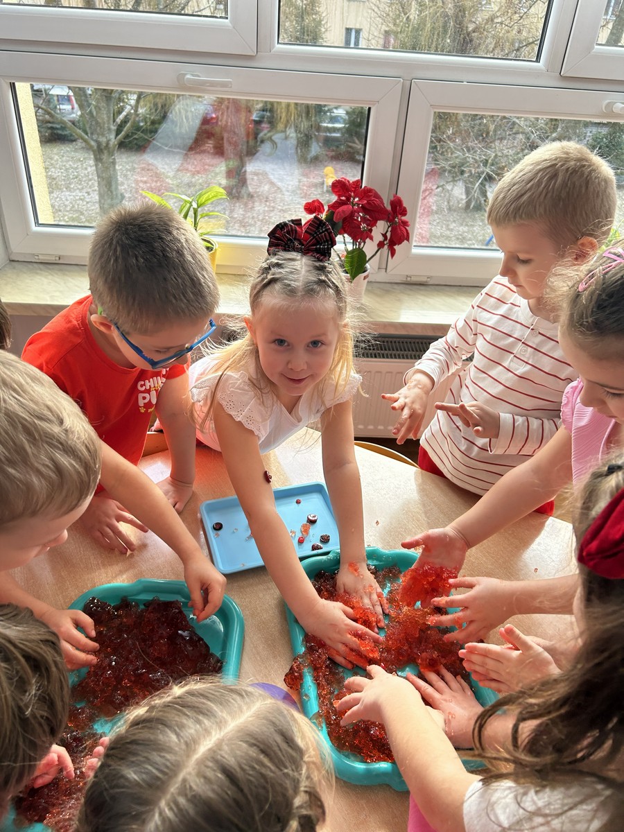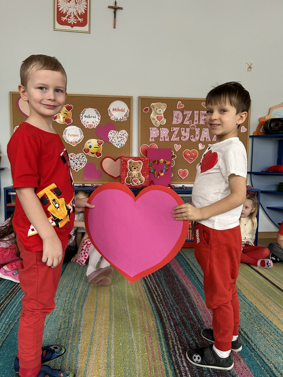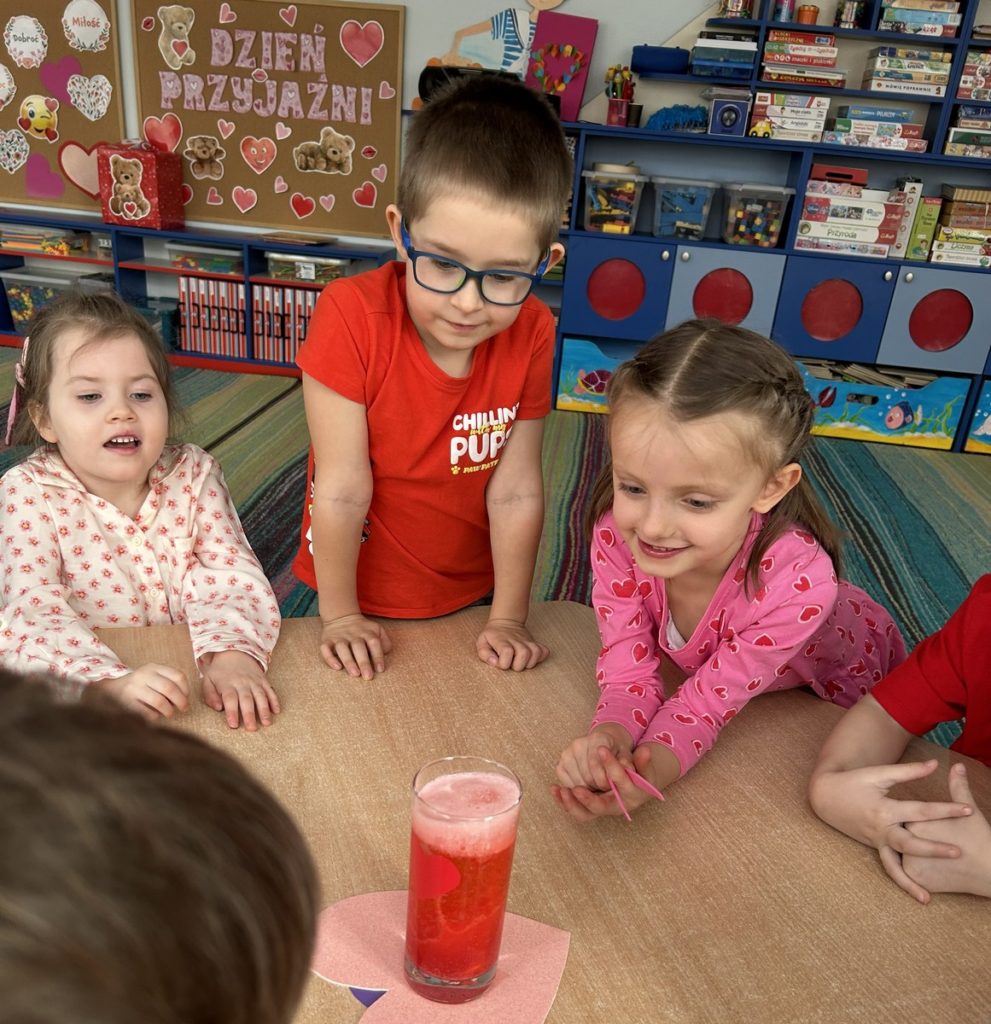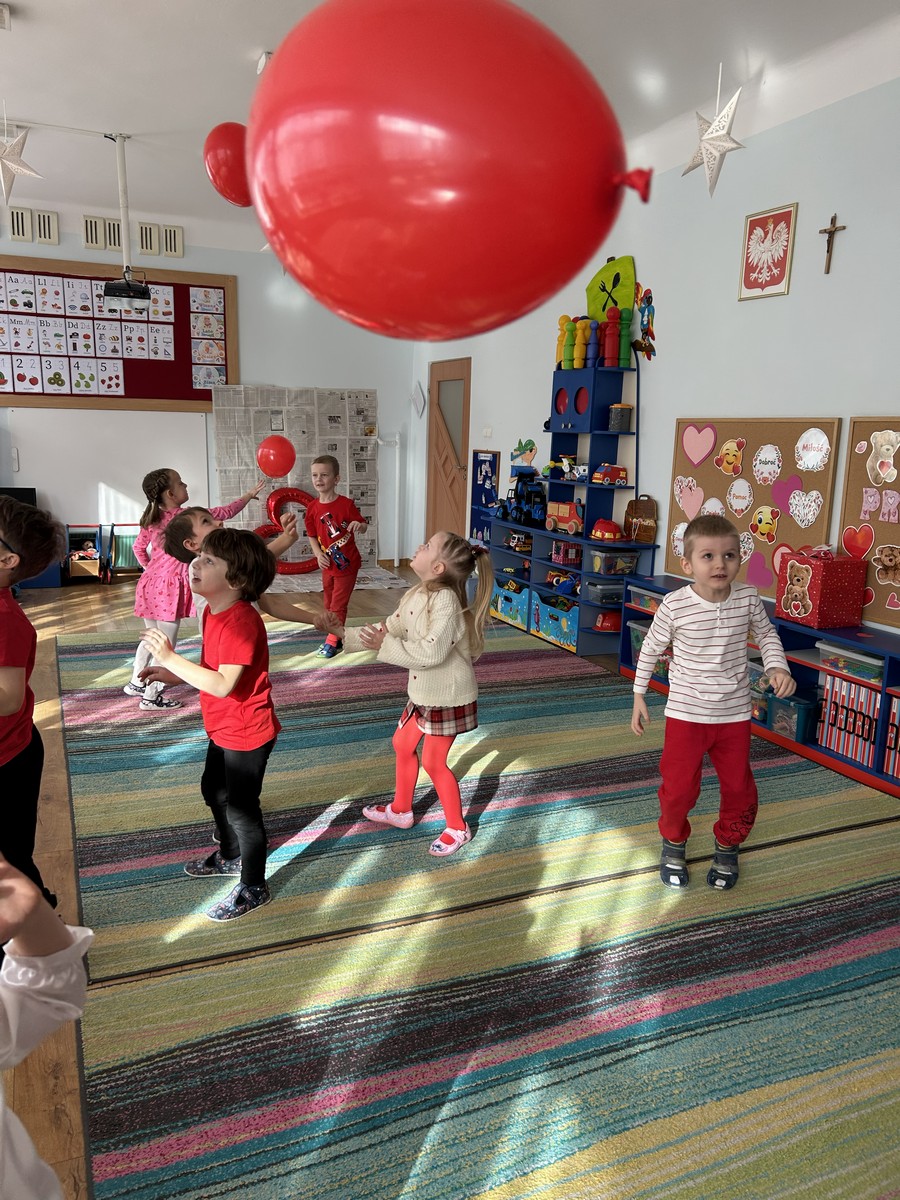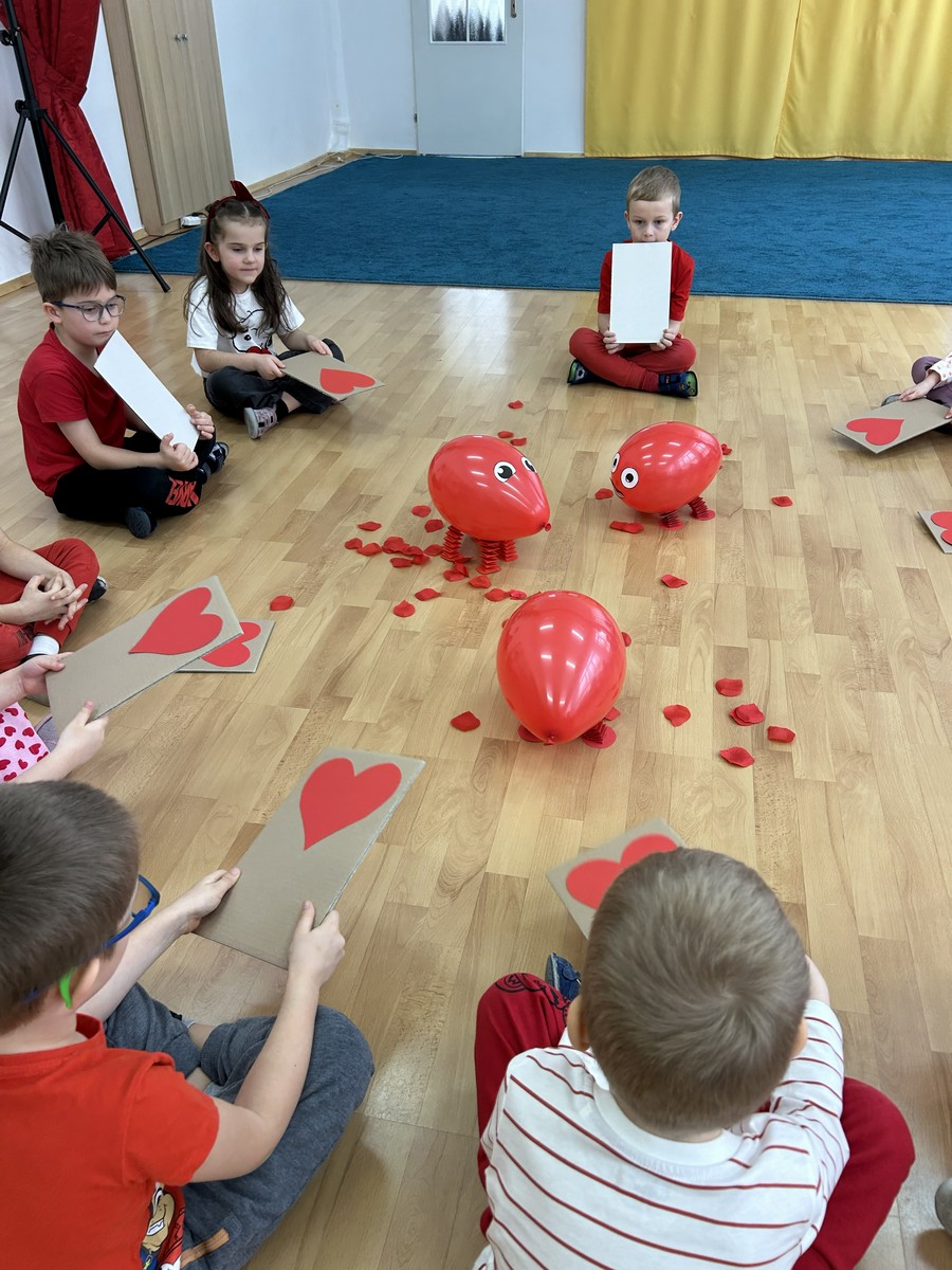 13 lutego świętowaliśmy Dzień Przyjaźni – dzień pełen uśmiechu i życzliwości! Dzieci ubrane na czerwono i różowo z dumą wypełniały Skrzynkę Przyjaźni domowymi laurkami, by później z radością wylosować dla siebie niespodziankę od kolegi lub koleżanki. W rymie radosnych, walentynkowych piosenek o przyjaźni dzieci wirowały  w tańcu z balonami i z wielkim zapałem brały udział w zabawnych konkurencjach zręcznościowych. Z zasłoniętymi szarfą oczami rozpoznawały swoich przyjaciół dotykiem. Prawdziwym hitem była zabawa z tekturowymi wachlarzami, dzięki którym dzieci sprawiły, że urocze balony z nóżkami radośnie podskakiwały. Brały udział w ciekawej konkurencji z kostką – „Serce z kubków”. Wykazały się kreatywnością, malując czerwoną farbą serca na ściance z gazet. Przedszkolaki zamieniły się w małych odkrywców, wykonując doświadczenie „Wulkan Przyjaźni” oraz tworząc na talerzu magiczne, tęczowe serca. Nie zabrakło też wyzwań dla małych rączek- dzieci z ogromnym skupieniem badały strukturę czerwonej galaretki, by odnaleźć w niej tajemnicze, ukryte guziki. To był dzień pełen magii, bliskości oraz wspaniałej, wspólnej zabawy!