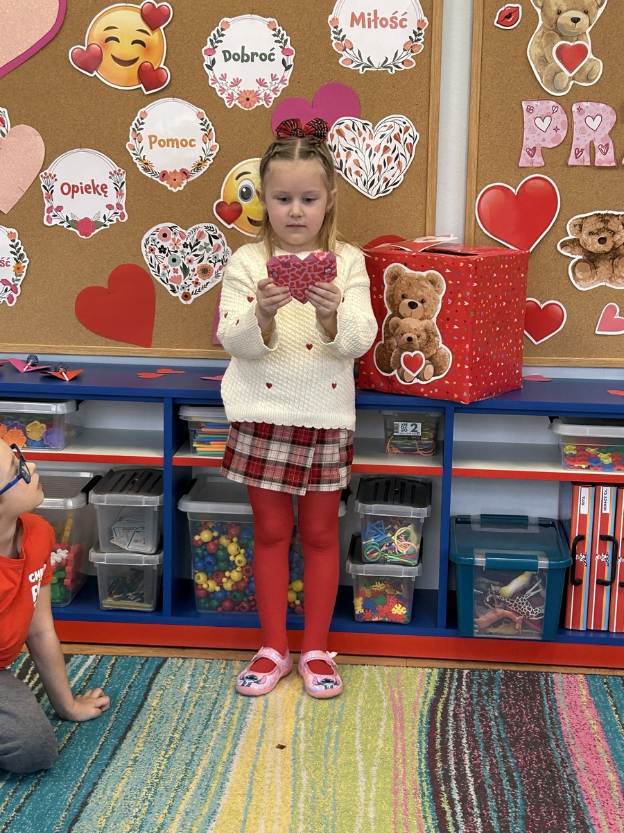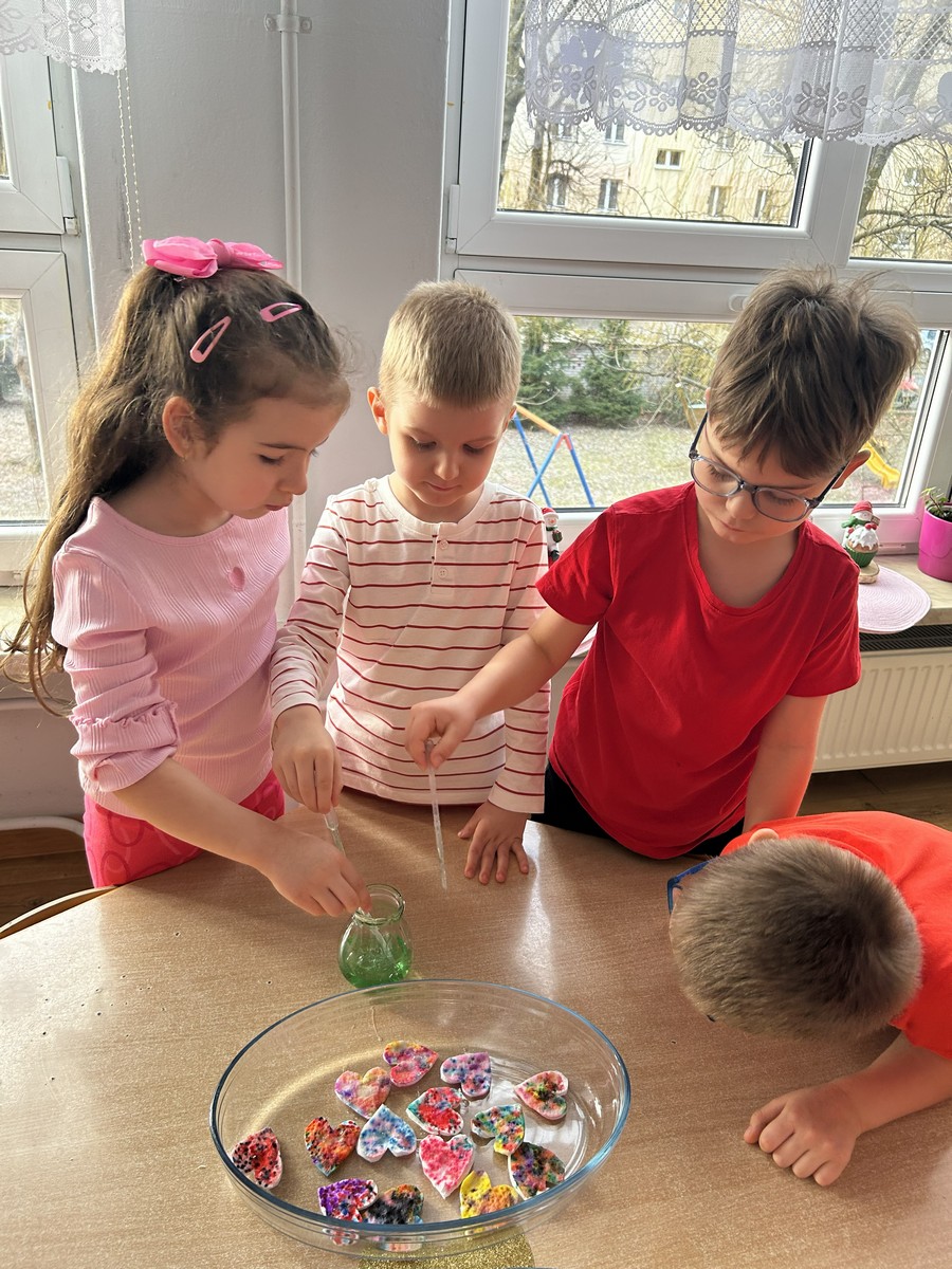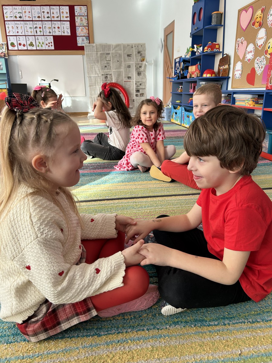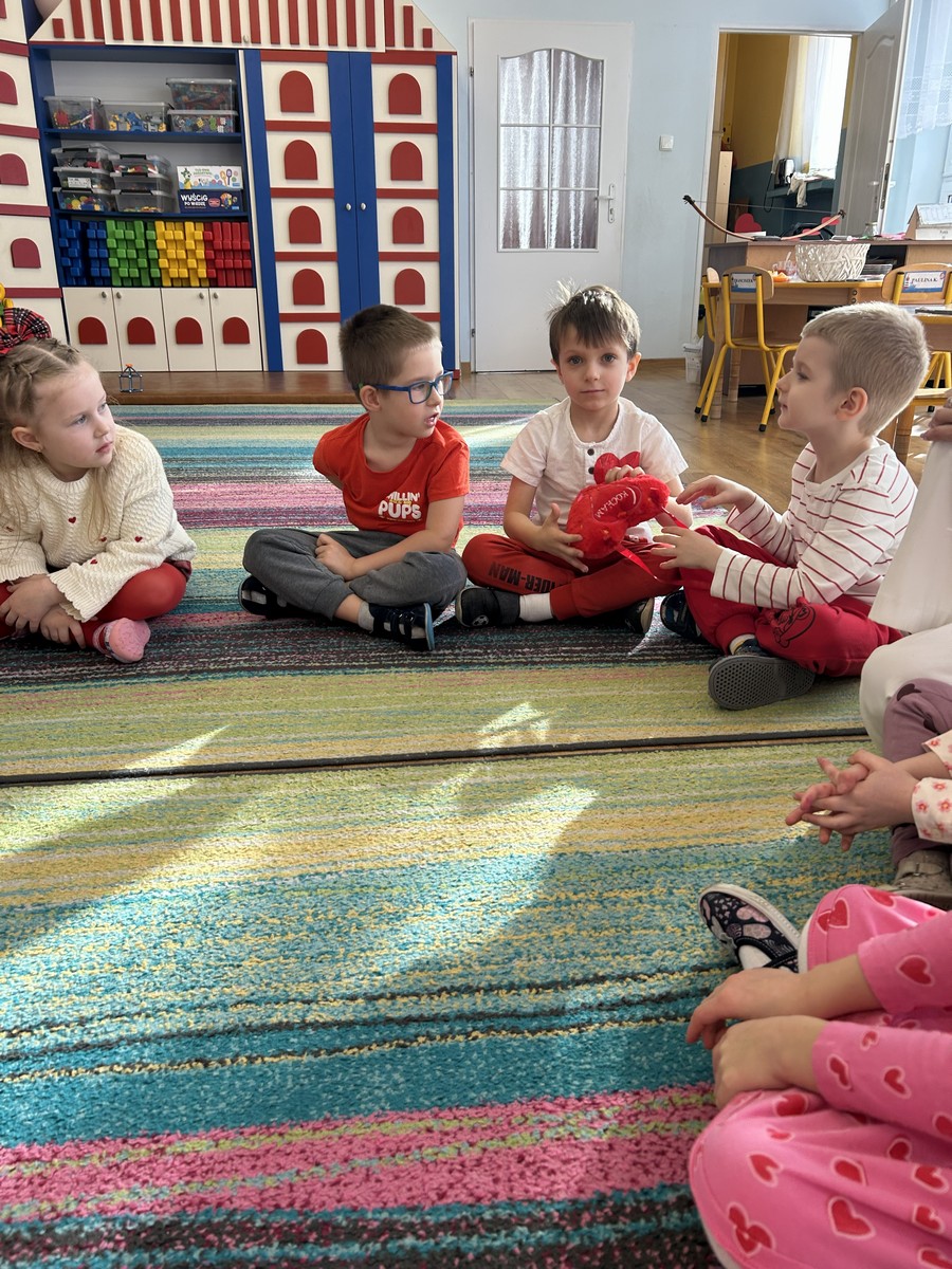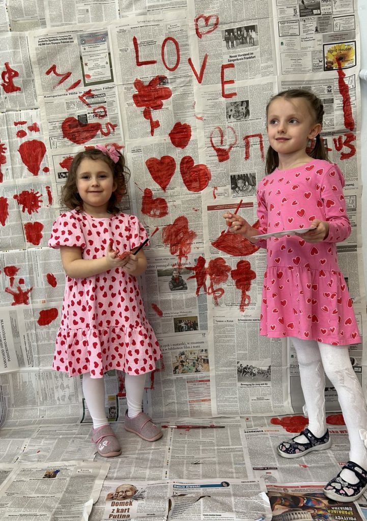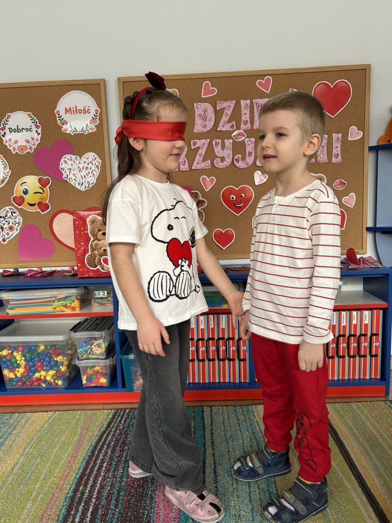 13 lutego świętowaliśmy Dzień Przyjaźni – dzień pełen uśmiechu i życzliwości! Dzieci ubrane na czerwono i różowo z dumą wypełniały Skrzynkę Przyjaźni domowymi laurkami, by później z radością wylosować dla siebie niespodziankę od kolegi lub koleżanki. W rymie radosnych, walentynkowych piosenek o przyjaźni dzieci wirowały  w tańcu z balonami i z wielkim zapałem brały udział w zabawnych konkurencjach zręcznościowych. Z zasłoniętymi szarfą oczami rozpoznawały swoich przyjaciół dotykiem. Prawdziwym hitem była zabawa z tekturowymi wachlarzami, dzięki którym dzieci sprawiły, że urocze balony z nóżkami radośnie podskakiwały. Brały udział w ciekawej konkurencji z kostką – „Serce z kubków”. Wykazały się kreatywnością, malując czerwoną farbą serca na ściance z gazet. Przedszkolaki zamieniły się w małych odkrywców, wykonując doświadczenie „Wulkan Przyjaźni” oraz tworząc na talerzu magiczne, tęczowe serca. Nie zabrakło też wyzwań dla małych rączek- dzieci z ogromnym skupieniem badały strukturę czerwonej galaretki, by odnaleźć w niej tajemnicze, ukryte guziki. To był dzień pełen magii, bliskości oraz wspaniałej, wspólnej zabawy!