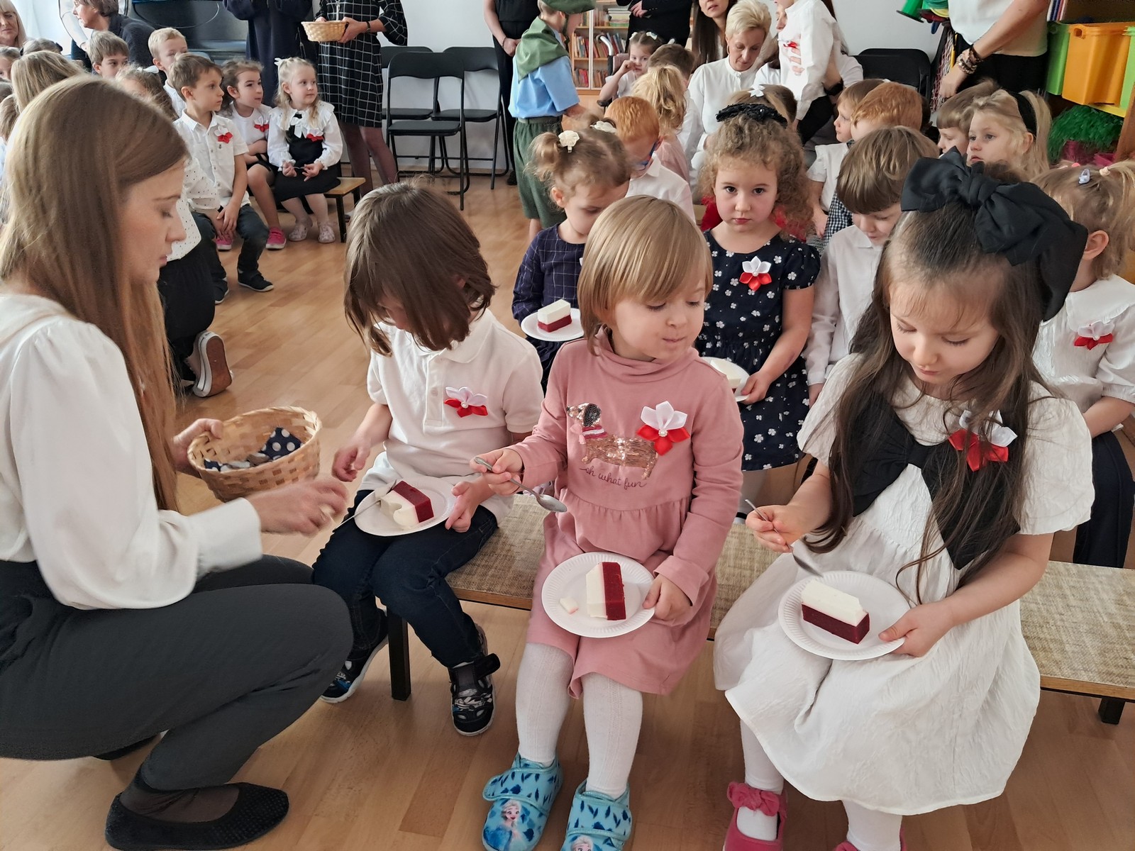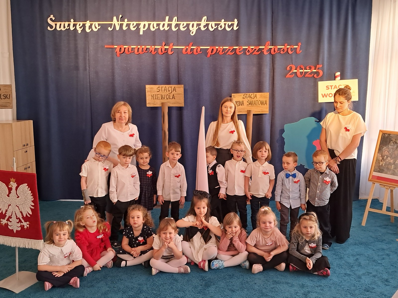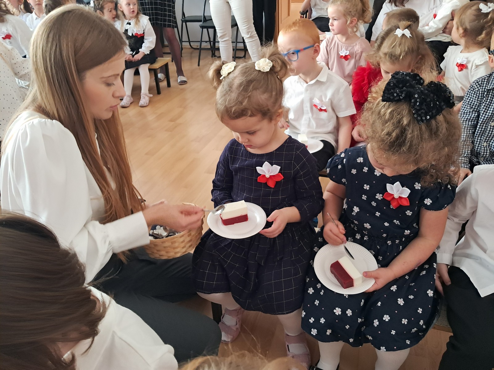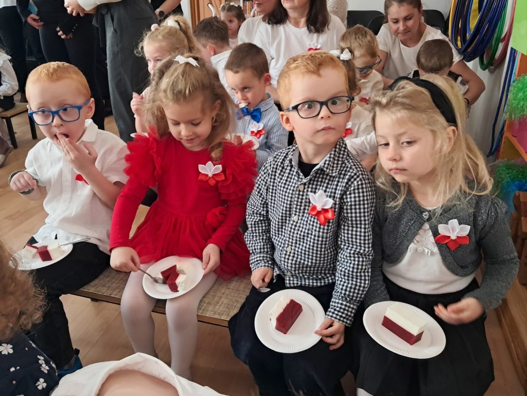 6 listopada 2025r. w naszym przedszkolu odbyła się wyjątkowa Uroczystość z okazji Narodowego Święta Niepodległości. W trakcie pięknego przedstawienia, Dwójkowe Zuchy zaprezentowały wzruszającą lekcję patriotyzmu pod tytułem „Powrót do przeszłości”. Najstarsze przedszkolaki wystąpiły w krótkich scenkach, które ukazywały historię Polski – od rozbiorów po odzyskanie niepodległości. W programie znalazły się także patriotyczne pieśni oraz wspólne odśpiewanie Hymnu Polski w postawie na baczność. Maluszki, jak i przedszkolaki z innych grup, były bardzo zaciekawione występem starszych kolegów i koleżanek. Piękne przedstawienie zostało nagrodzone gromkimi brawami. Uroczystość zakończyła się wspólnym, słodkim poczęstunkiem – przepysznym tortem w biało-czerwonych barwach, przygotowanym przez nasze Panie Kucharki.