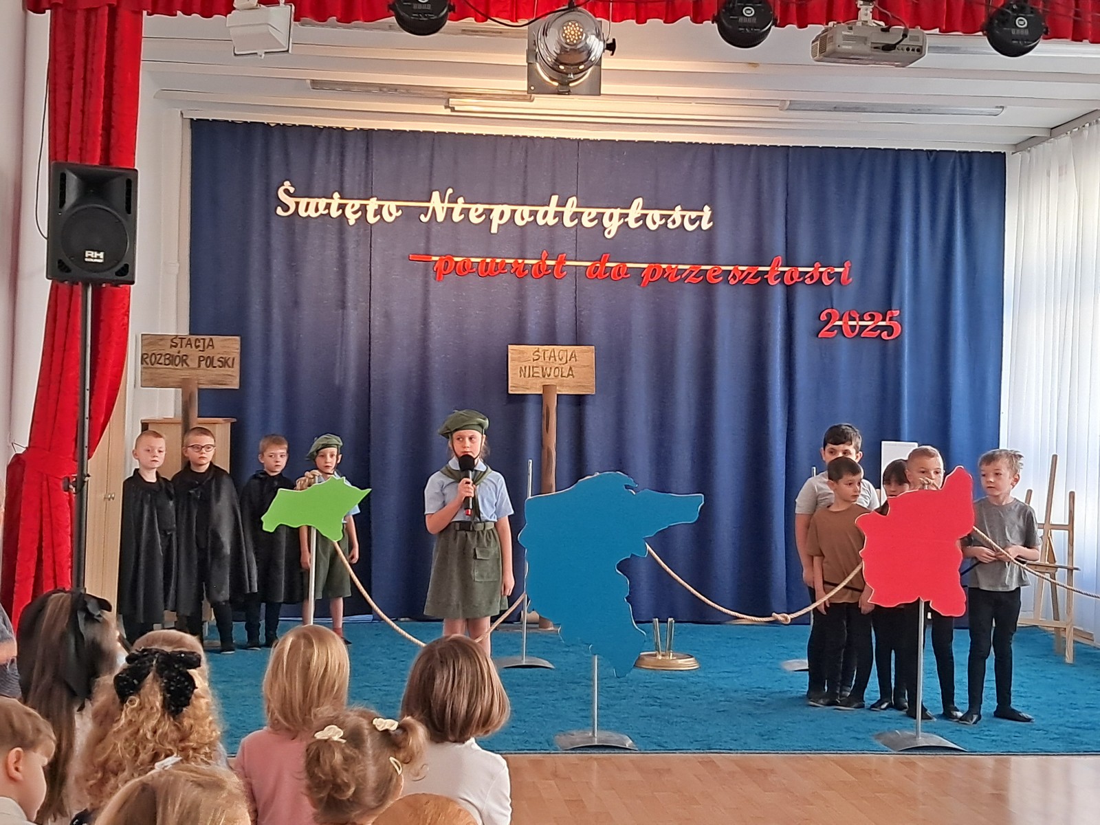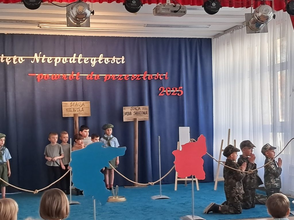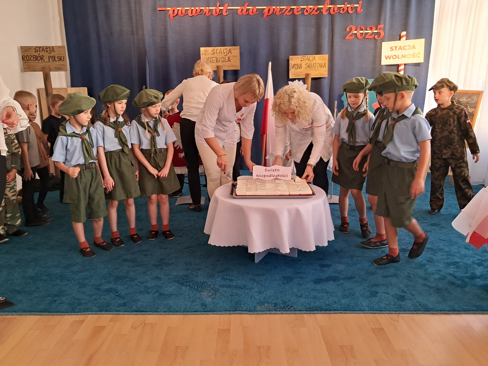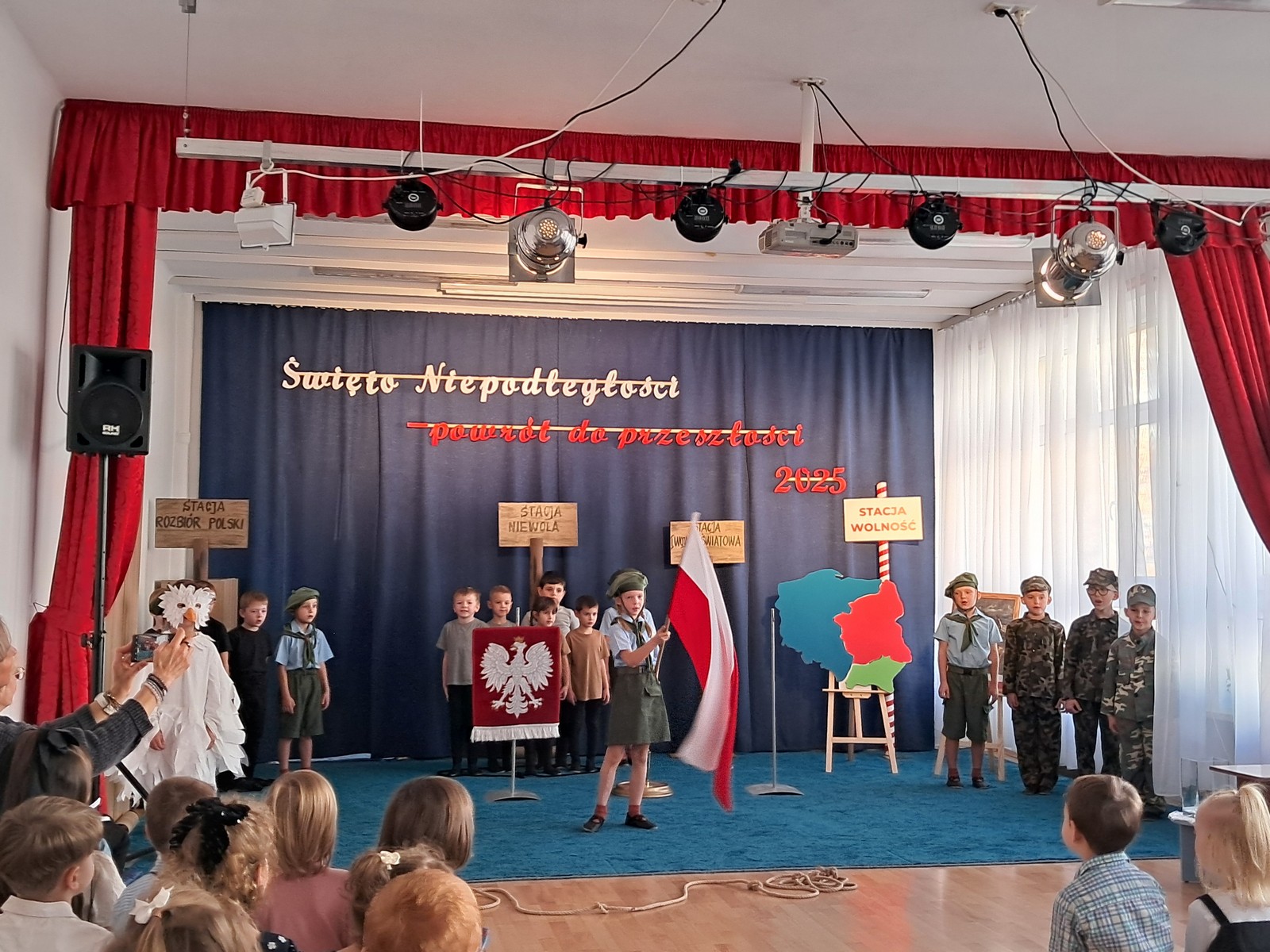 6 listopada 2025r. w naszym przedszkolu odbyła się wyjątkowa Uroczystość z okazji Narodowego Święta Niepodległości. W trakcie pięknego przedstawienia, Dwójkowe Zuchy zaprezentowały wzruszającą lekcję patriotyzmu pod tytułem „Powrót do przeszłości”. Najstarsze przedszkolaki wystąpiły w krótkich scenkach, które ukazywały historię Polski – od rozbiorów po odzyskanie niepodległości. W programie znalazły się także patriotyczne pieśni oraz wspólne odśpiewanie Hymnu Polski w postawie na baczność. Maluszki, jak i przedszkolaki z innych grup, były bardzo zaciekawione występem starszych kolegów i koleżanek. Piękne przedstawienie zostało nagrodzone gromkimi brawami. Uroczystość zakończyła się wspólnym, słodkim poczęstunkiem – przepysznym tortem w biało-czerwonych barwach, przygotowanym przez nasze Panie Kucharki.