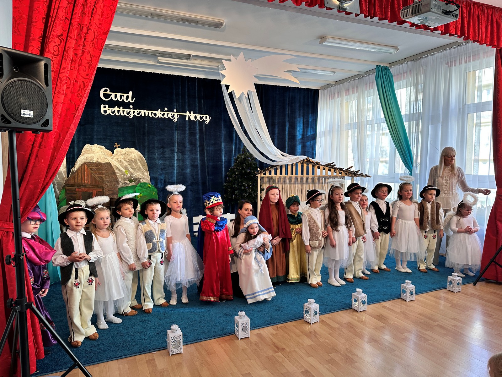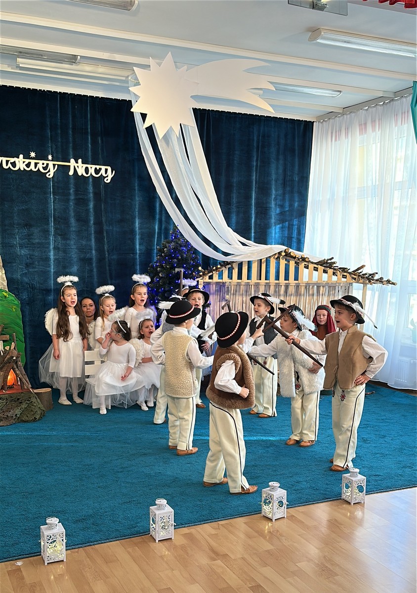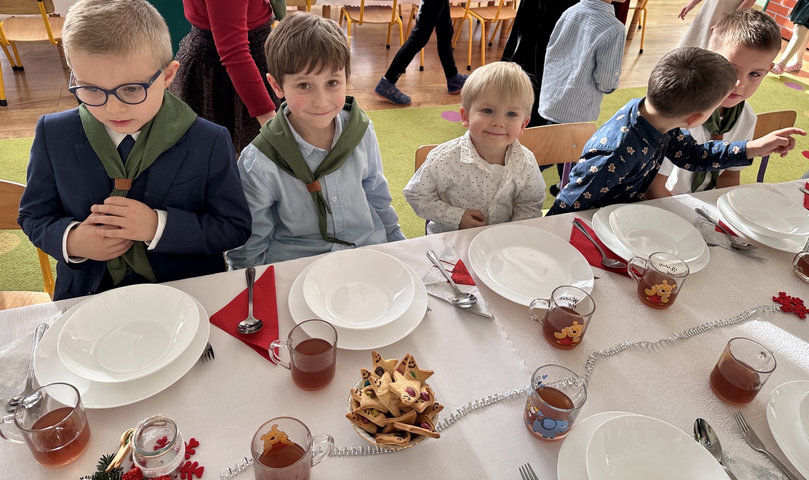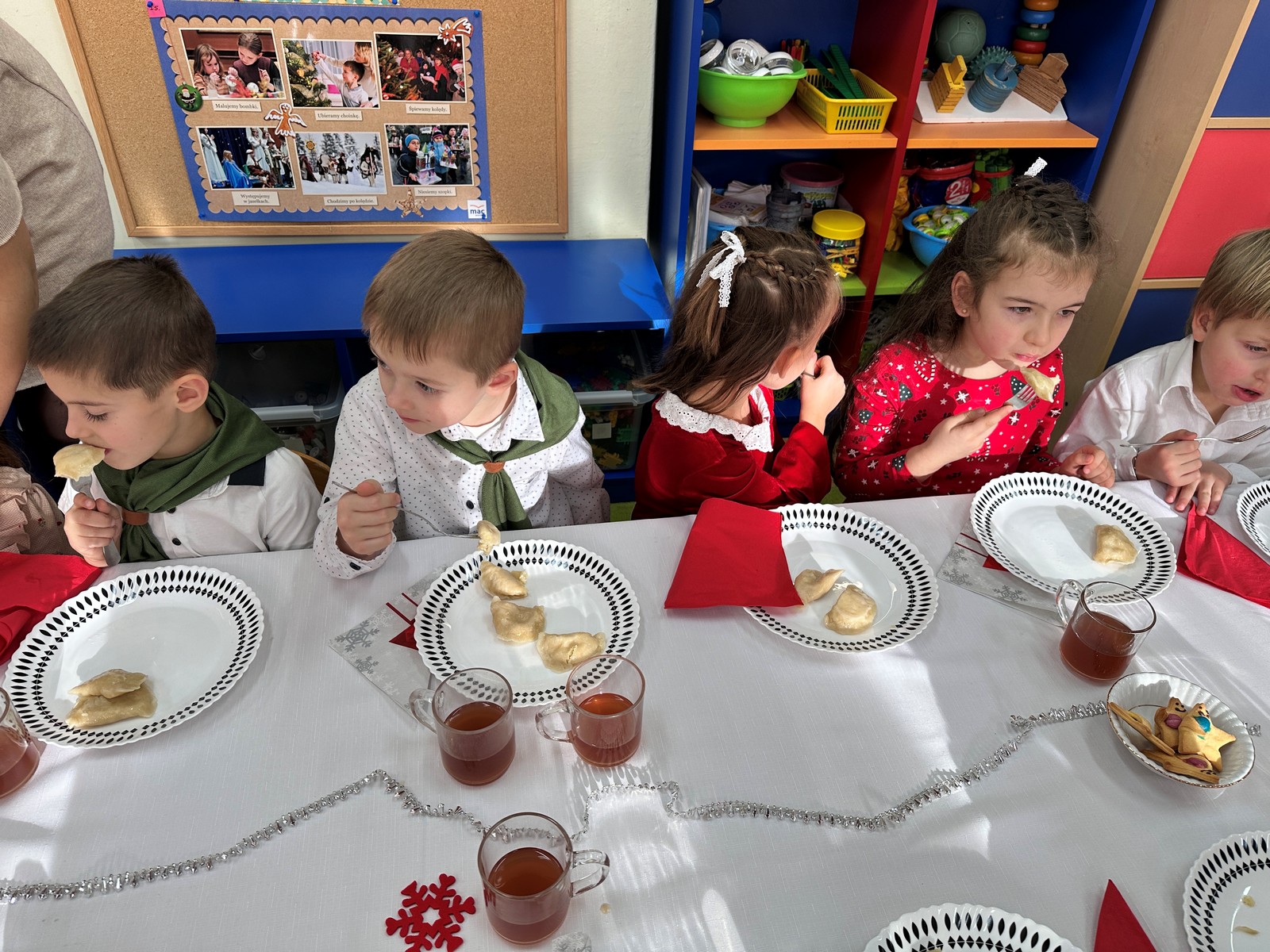 17 grudnia w naszym przedszkolu obchodziliśmy jeden z najpiękniejszych dni w roku – Wigilię Bożego Narodzenia. W sali gimnastycznej o wyznaczonej godzinie zebrała się cała społeczność przedszkola oraz zaproszeni goście, przewodnicząca Rady Rodziców pani Kinga Małozięć oraz dyrektor Miejskiego Zarządu Oświaty, pan Ireneusz Kozak, aby obejrzeć Jasełka pt. „Cud Betlejemskiej Nocy” przygotowane przez grupę Średniaków. Po występie łamaliśmy się opłatkiem składając sobie nawzajem życzenia. Następnie wszyscy zasiedliśmy przy odświętnie nakrytych stołach, gdzie smakowaliśmy tradycyjne wigilijne potrawy. W cudownej atmosferze Świąt Bożego Narodzenia rozmawialiśmy o świątecznych zwyczajach, potrawach wigilijnych, a w oddali cicho rozbrzmiewały kolędy. Zuchy bardzo uważnie opiekowały się naszymi najmłodszymi przedszkolakami, pomagając im podczas przemieszczania się między salami oraz podczas wigilijnego obiadu. Takie podniosłe chwile nie tylko utrwalają dzieciom znajomość tradycji i świątecznych zwyczajów lecz, również wzmacniają bliskie i serdeczne relacje między sobą i najbliższymi.