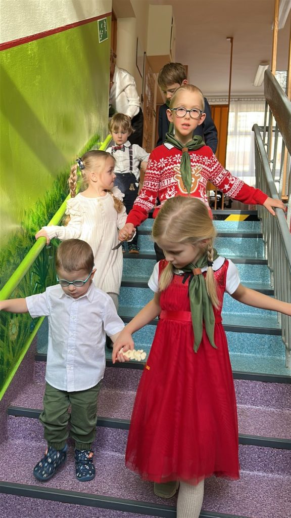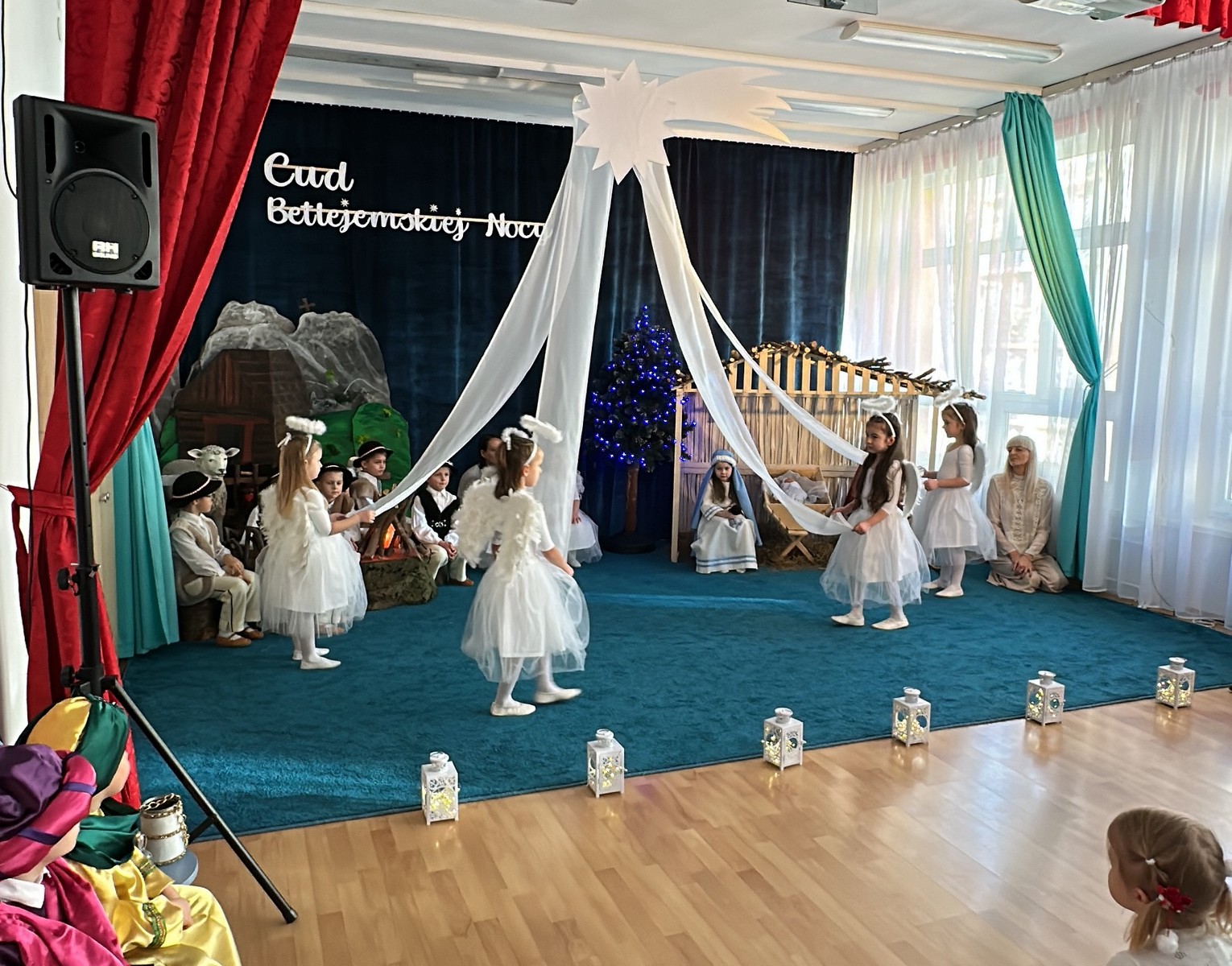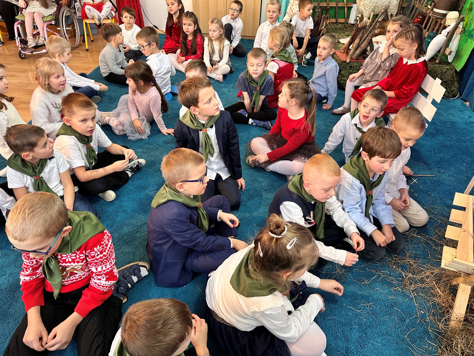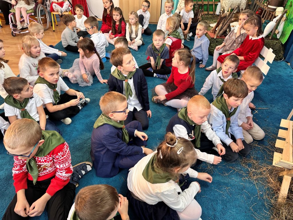 17 grudnia w naszym przedszkolu obchodziliśmy jeden z najpiękniejszych dni w roku – Wigilię Bożego Narodzenia. W sali gimnastycznej o wyznaczonej godzinie zebrała się cała społeczność przedszkola oraz zaproszeni goście, przewodnicząca Rady Rodziców pani Kinga Małozięć oraz dyrektor Miejskiego Zarządu Oświaty, pan Ireneusz Kozak, aby obejrzeć Jasełka pt. „Cud Betlejemskiej Nocy” przygotowane przez grupę Średniaków. Po występie łamaliśmy się opłatkiem składając sobie nawzajem życzenia. Następnie wszyscy zasiedliśmy przy odświętnie nakrytych stołach, gdzie smakowaliśmy tradycyjne wigilijne potrawy. W cudownej atmosferze Świąt Bożego Narodzenia rozmawialiśmy o świątecznych zwyczajach, potrawach wigilijnych, a w oddali cicho rozbrzmiewały kolędy. Zuchy bardzo uważnie opiekowały się naszymi najmłodszymi przedszkolakami, pomagając im podczas przemieszczania się między salami oraz podczas wigilijnego obiadu. Takie podniosłe chwile nie tylko utrwalają dzieciom znajomość tradycji i świątecznych zwyczajów lecz, również wzmacniają bliskie i serdeczne relacje między sobą i najbliższymi.