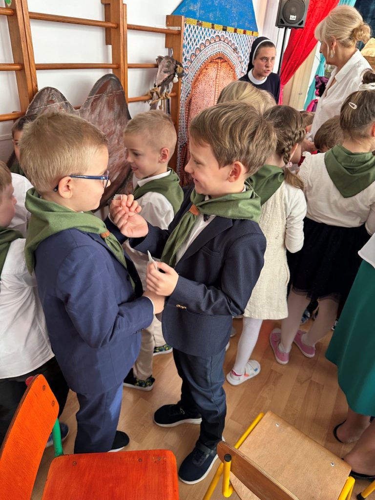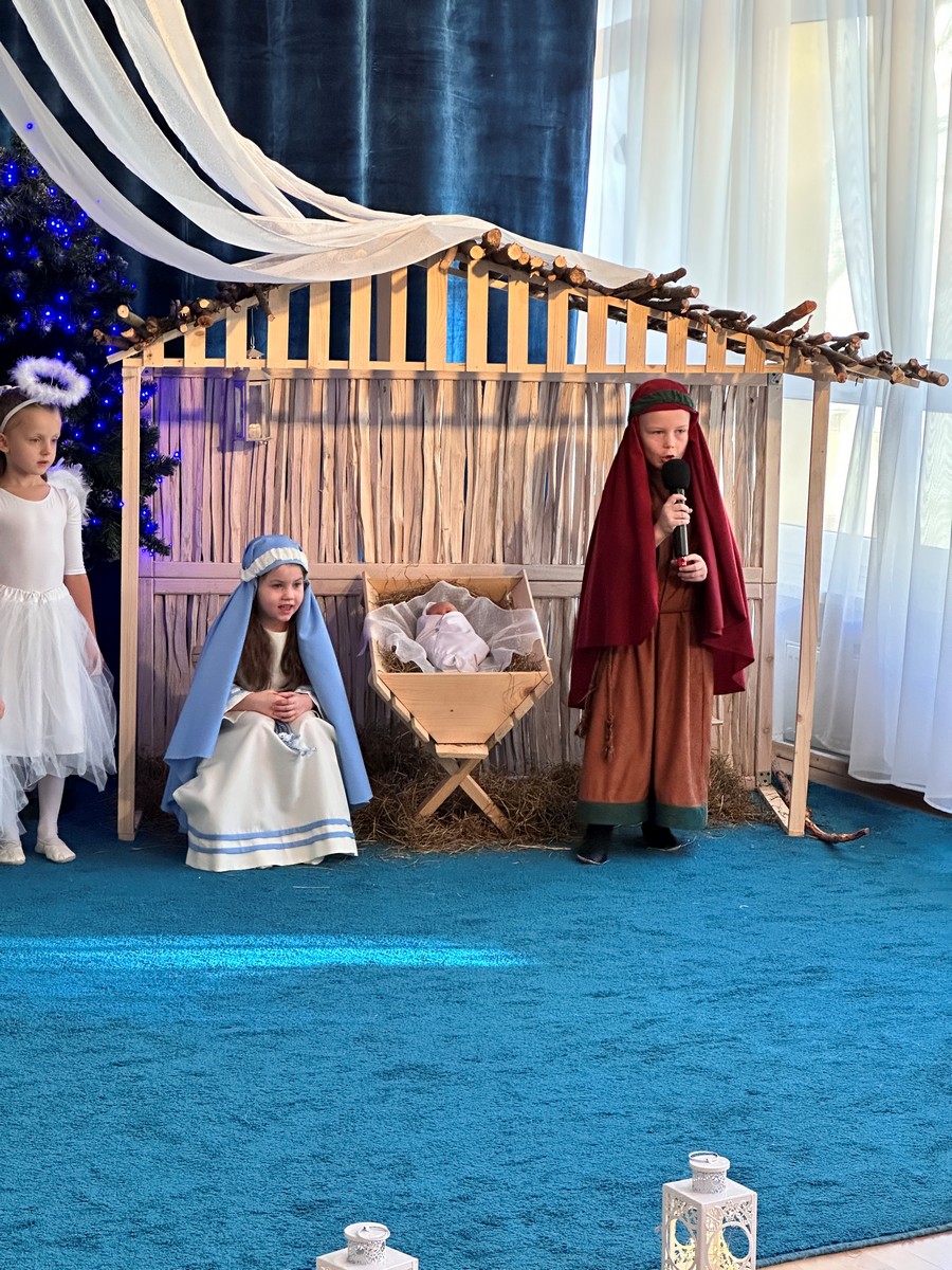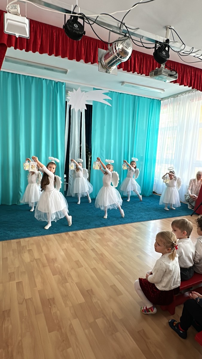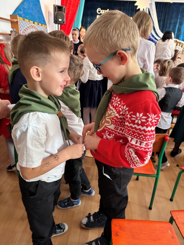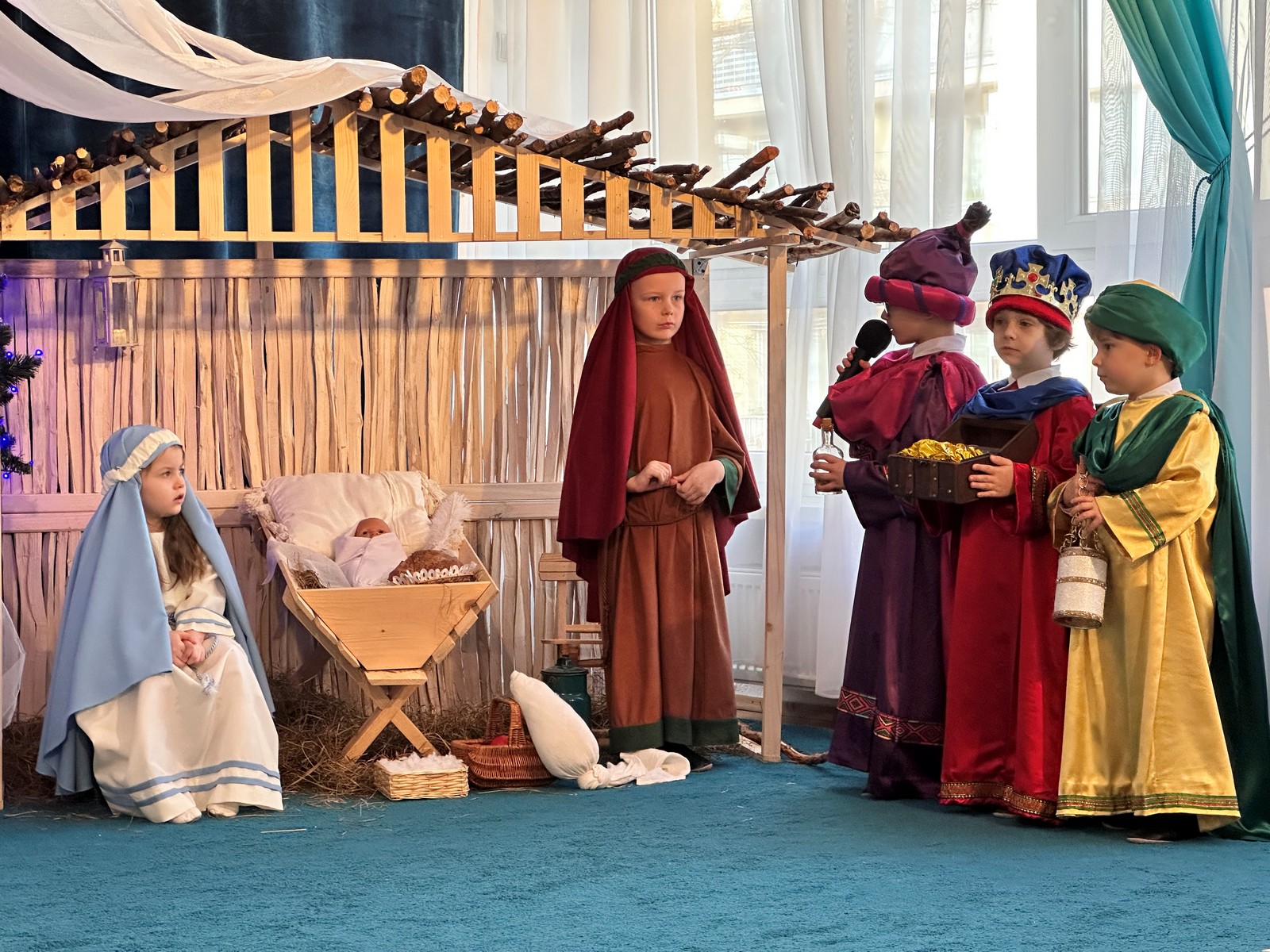 17 grudnia w naszym przedszkolu obchodziliśmy jeden z najpiękniejszych dni w roku – Wigilię Bożego Narodzenia. W sali gimnastycznej o wyznaczonej godzinie zebrała się cała społeczność przedszkola oraz zaproszeni goście, przewodnicząca Rady Rodziców pani Kinga Małozięć oraz dyrektor Miejskiego Zarządu Oświaty, pan Ireneusz Kozak, aby obejrzeć Jasełka pt. „Cud Betlejemskiej Nocy” przygotowane przez grupę Średniaków. Po występie łamaliśmy się opłatkiem składając sobie nawzajem życzenia. Następnie wszyscy zasiedliśmy przy odświętnie nakrytych stołach, gdzie smakowaliśmy tradycyjne wigilijne potrawy. W cudownej atmosferze Świąt Bożego Narodzenia rozmawialiśmy o świątecznych zwyczajach, potrawach wigilijnych, a w oddali cicho rozbrzmiewały kolędy. Zuchy bardzo uważnie opiekowały się naszymi najmłodszymi przedszkolakami, pomagając im podczas przemieszczania się między salami oraz podczas wigilijnego obiadu. Takie podniosłe chwile nie tylko utrwalają dzieciom znajomość tradycji i świątecznych zwyczajów lecz, również wzmacniają bliskie i serdeczne relacje między sobą i najbliższymi.