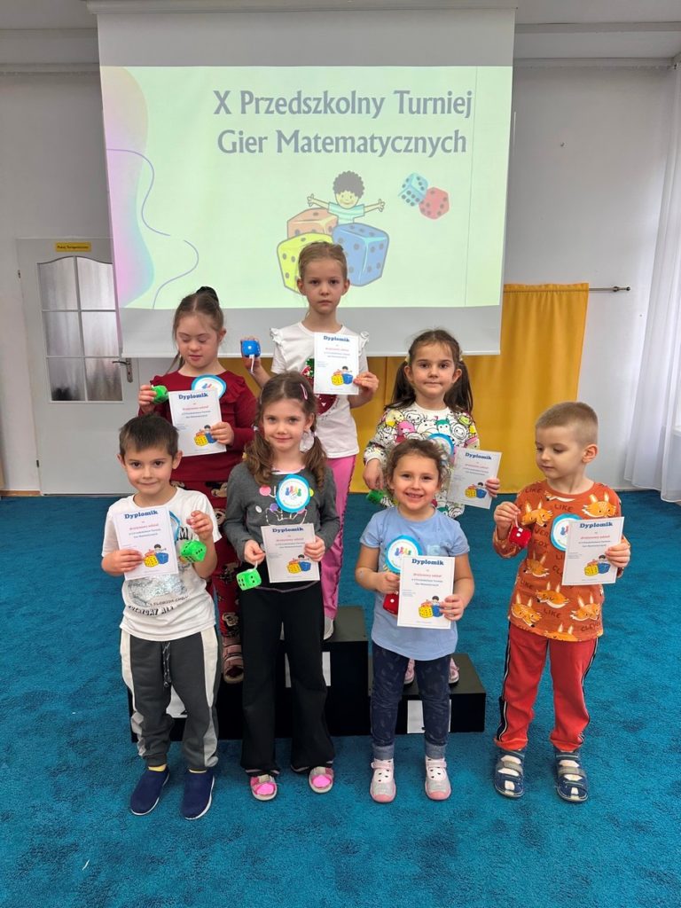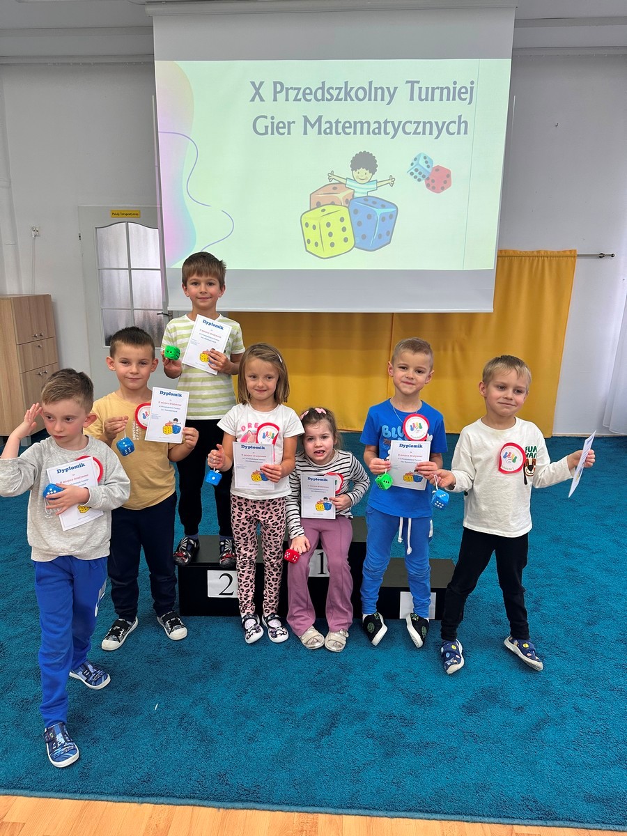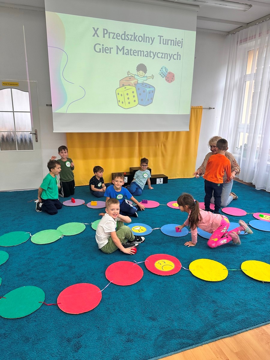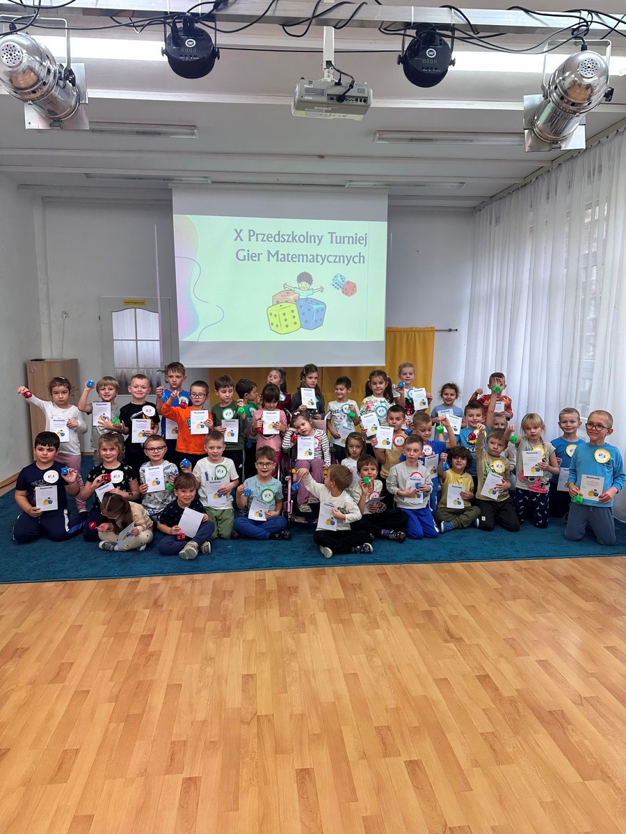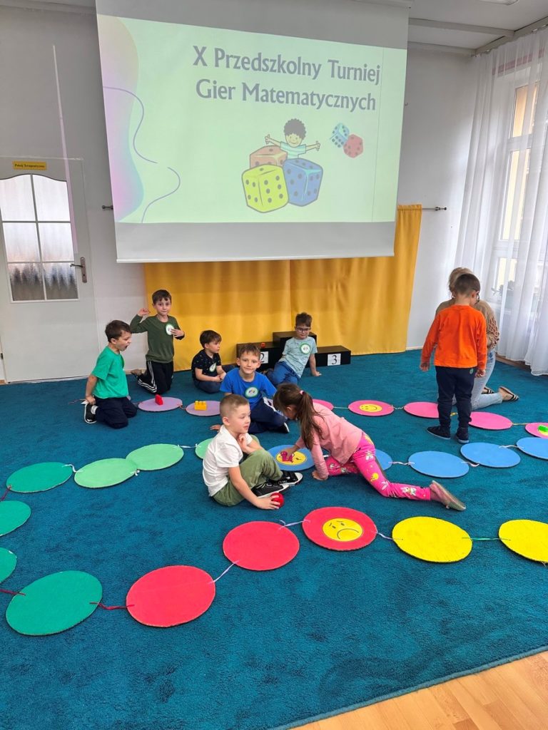 W dniu 17 listopada 2025r. dzieci z grupy III i IV uczestniczyły w „X Turnieju Gier Matematycznych”. Przedszkolaki podzielone na 5 drużyn, w radosnym nastroju rywalizowały ze sobą. Na każdym etapie turniejowym towarzyszyło im poczucie sukcesu dzięki zdobywanym punktom. Na pamiątkę wszyscy otrzymali nagrody i dyplomy.