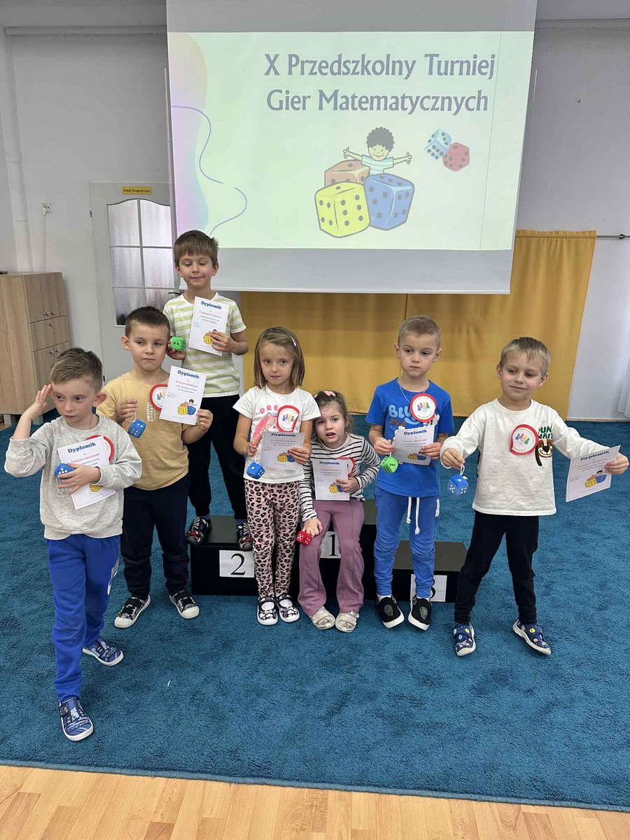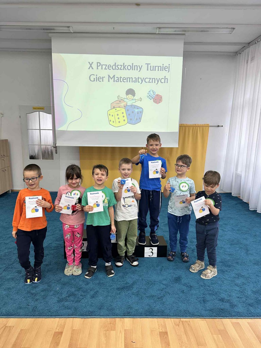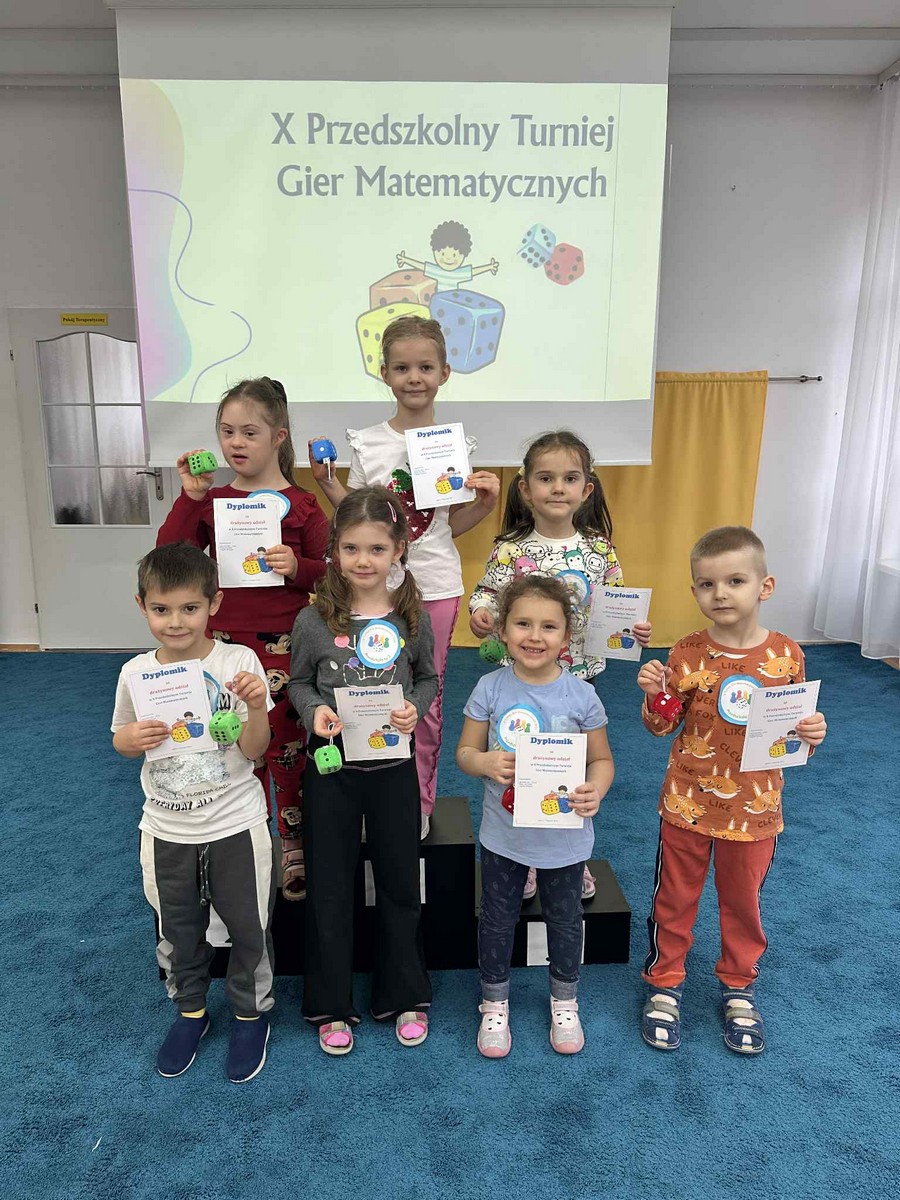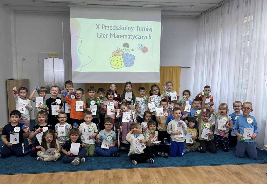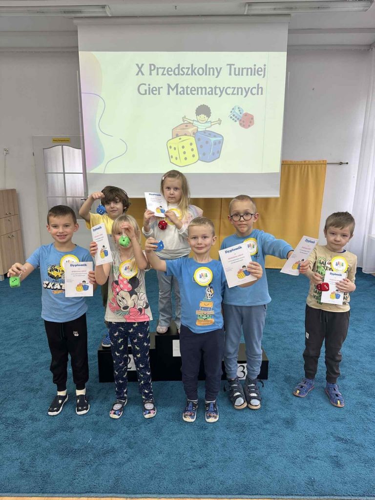 17 listopada  w naszym przedszkolu odbył się X Turniej Gier Matematycznych, który dostarczył dzieciom wielu emocji, radości i okazji do twórczego myślenia. W wydarzeniu wzięły udział średniaki oraz starszaki, a zadania zostały dostosowane do wieku i możliwości naszych  dzieci. Wszystkie przedszkolaki wykazały się ogromnym zaangażowaniem i świetnie poradziły sobie z przygotowanymi zadaniami. Na zakończenie każdy uczestnik otrzymał pamiątkowy dyplom oraz pluszową kostkę do gry w formie breloku.