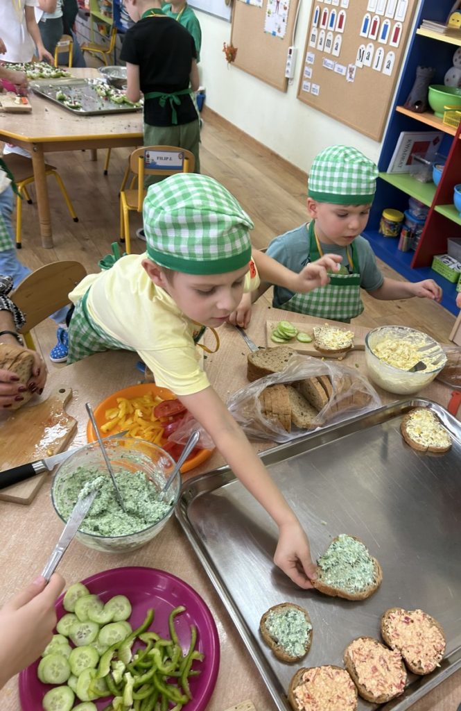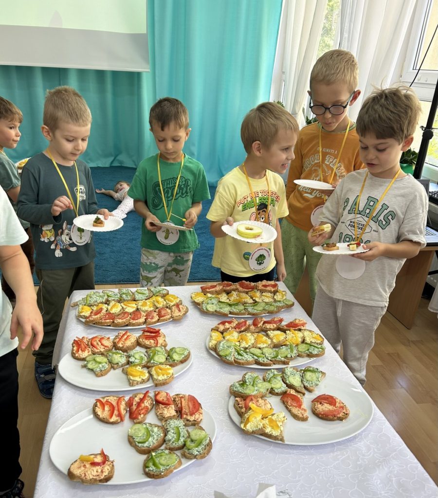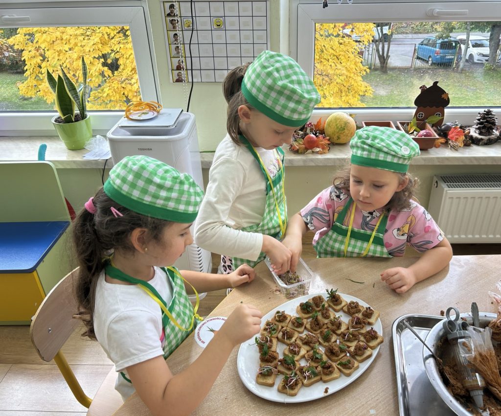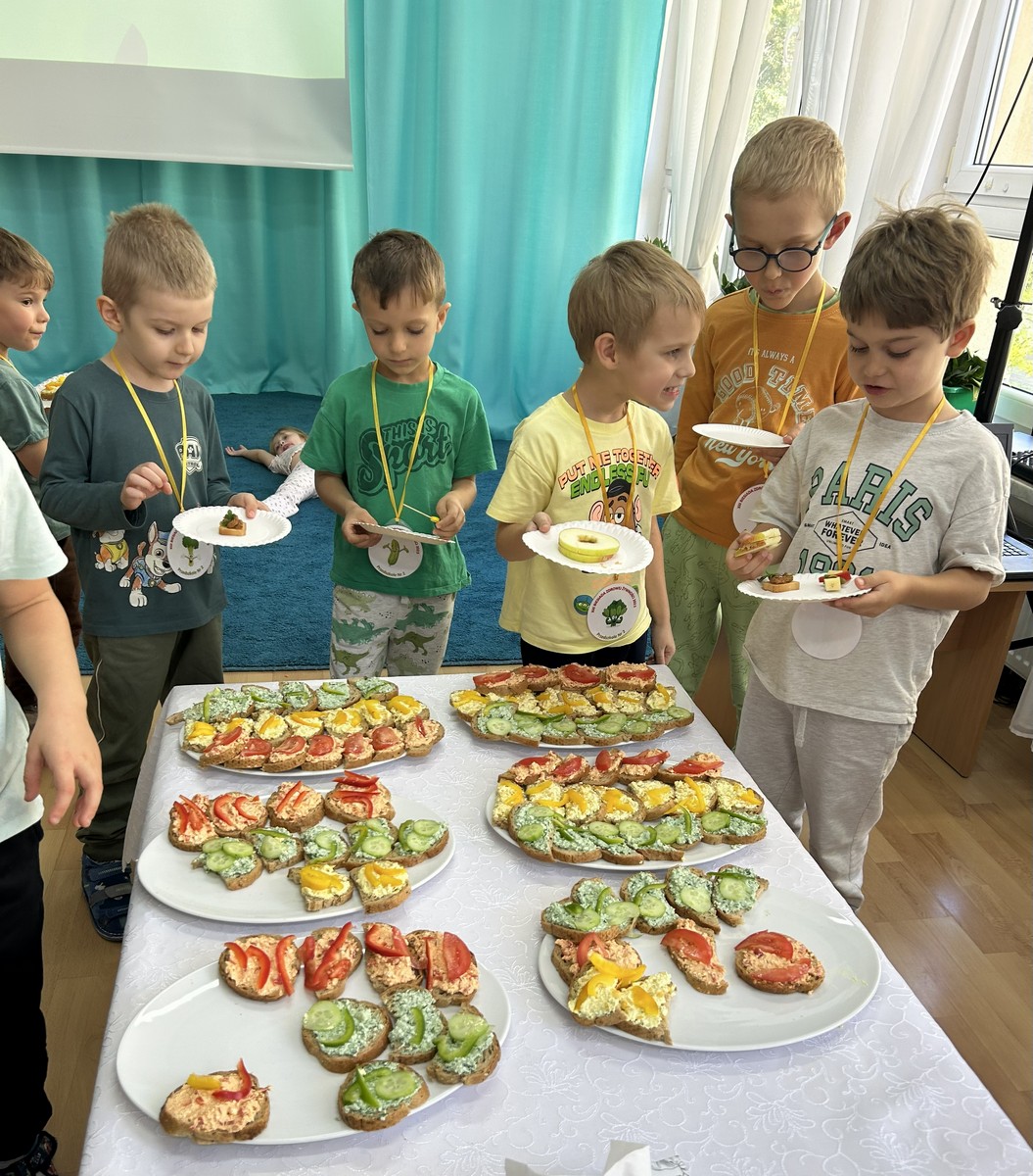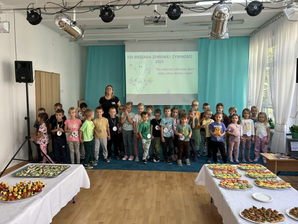 16 października Średniaki wzięły udział w XIII Biesiadzie Zdrowej Żywności pod hasłem „Na talerzu zdrowia moc – zdrowe zęby dzień i noc”. Dzieci obejrzały scenkę, której celem było przekazanie wiedzy na temat prawidłowej higieny jamy ustnej i znaczenia zdrowej diety w dbaniu o zęby. Następnie przedszkolaki pracując w grupach, przygotowały zdrowe potrawy bogate w składniki budulcowe zębów. Degustacja zdrowych przekąsek była apetyczną lekcją kształtowania prawidłowych nawyków żywieniowych.