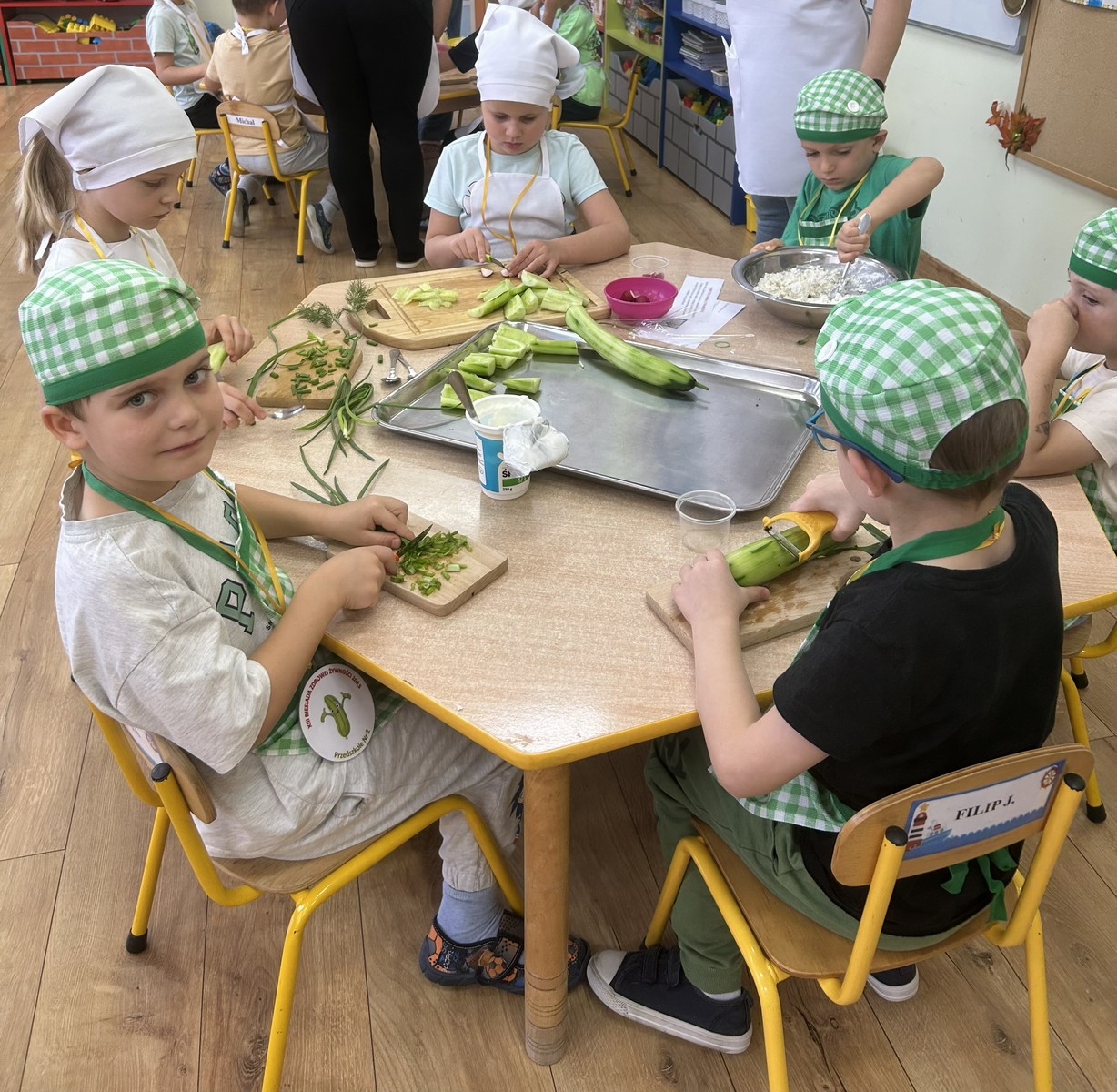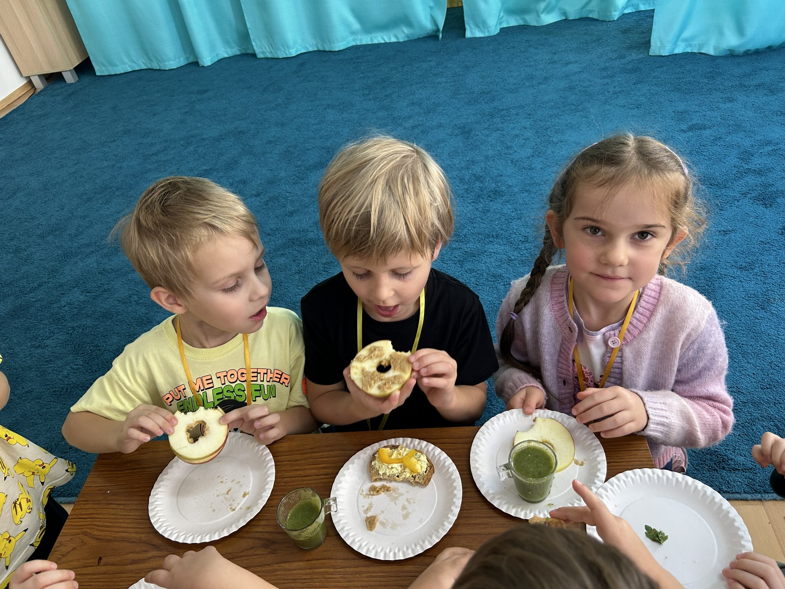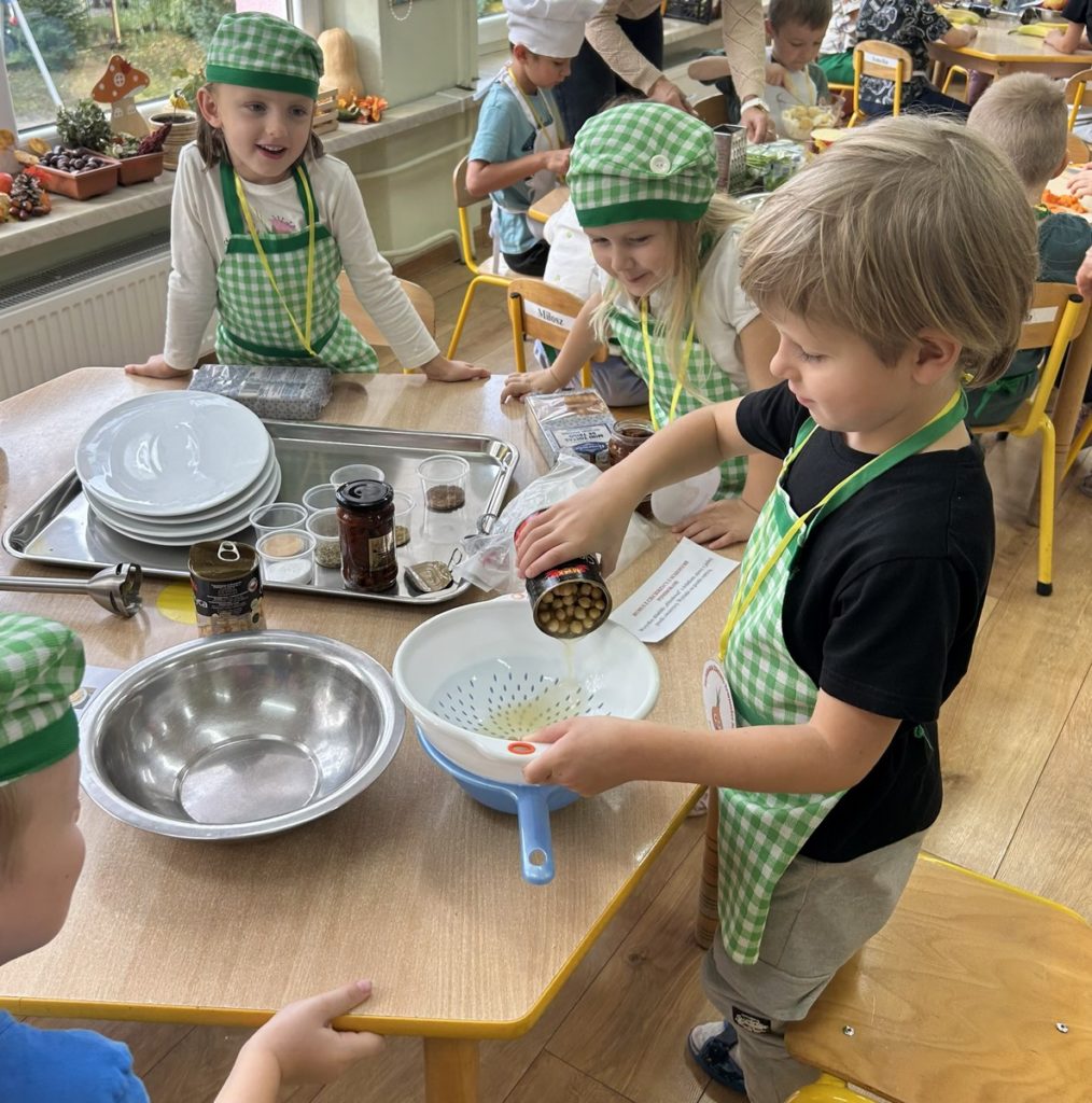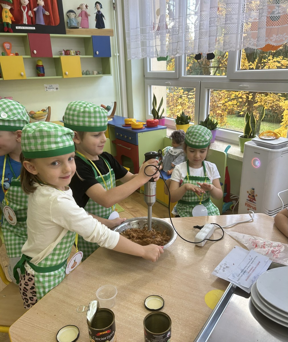 16 października Średniaki wzięły udział w XIII Biesiadzie Zdrowej Żywności pod hasłem „Na talerzu zdrowia moc – zdrowe zęby dzień i noc”. Dzieci obejrzały scenkę, której celem było przekazanie wiedzy na temat prawidłowej higieny jamy ustnej i znaczenia zdrowej diety w dbaniu o zęby. Następnie przedszkolaki pracując w grupach, przygotowały zdrowe potrawy bogate w składniki budulcowe zębów. Degustacja zdrowych przekąsek była apetyczną lekcją kształtowania prawidłowych nawyków żywieniowych.