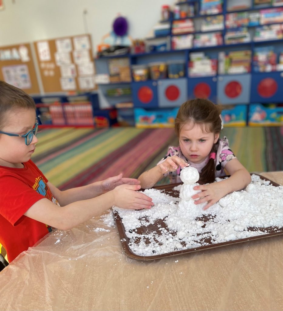 Podczas zimowych zajęć sensorycznych dzieci miały okazję doświadczać i poznawać świat za pomocą zmysłów. Przedszkolaki uczestniczyły w różnorodnych aktywnościach inspirowanych zimową tematyką – dotykały, przesypywały, ugniatały i eksperymentowały z różnymi materiałami. Dzieci z ogromnym zainteresowaniem odkrywały nowe faktury i struktury, doskonale się przy tym bawiąc.